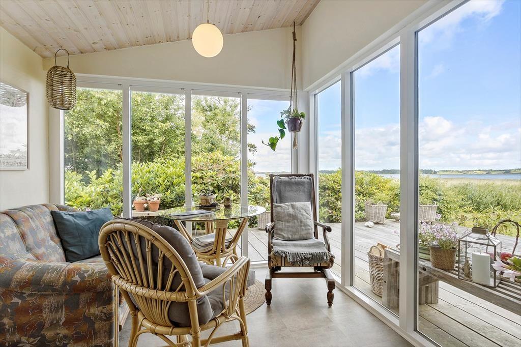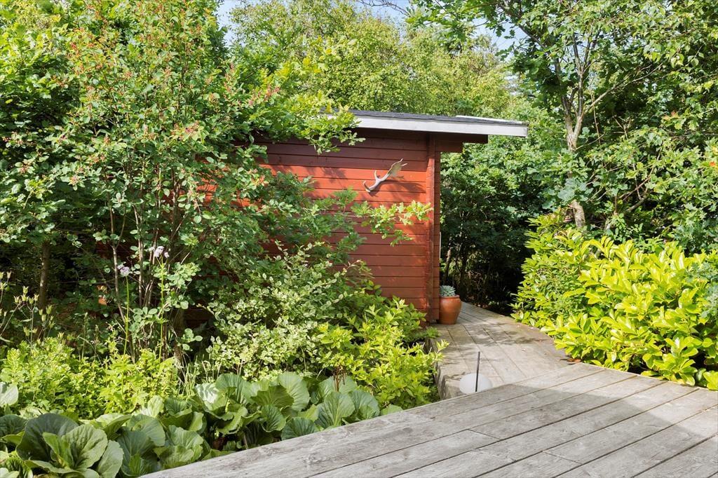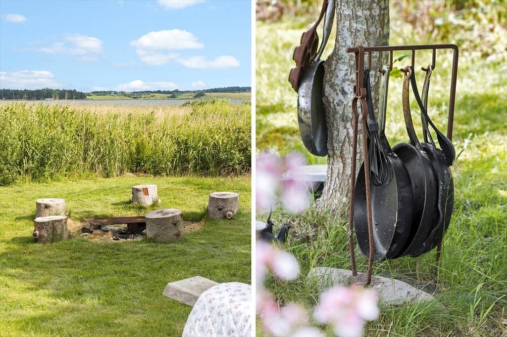 På en solbeskinnet sommerdag har du sikkert ikke lyst til at sidde inde nær brændeovnen, og måske er det for varmt selv at være i udestuen. I så fald kan træterrassen være din redning, for den breder sig hele vejen rundt om sommerhuset, så der er flere dejlige opholdspladser at vælge imellem. Terrassen er delvist overdækket og godt afskærmet af naturgrundens buske og træer – men ud mod vandet er der naturligvis mere åbent, så du får rig mulighed for at sidde og falde i staver over fjord-idyllen. På grunden er der en god græsplæne at lege på, og alle outdoor-typer vil sikkert blive begejstrede over bålpladsen, hvor I kan tilberede hele aftensmaden over åben ild, hvis I lyster.