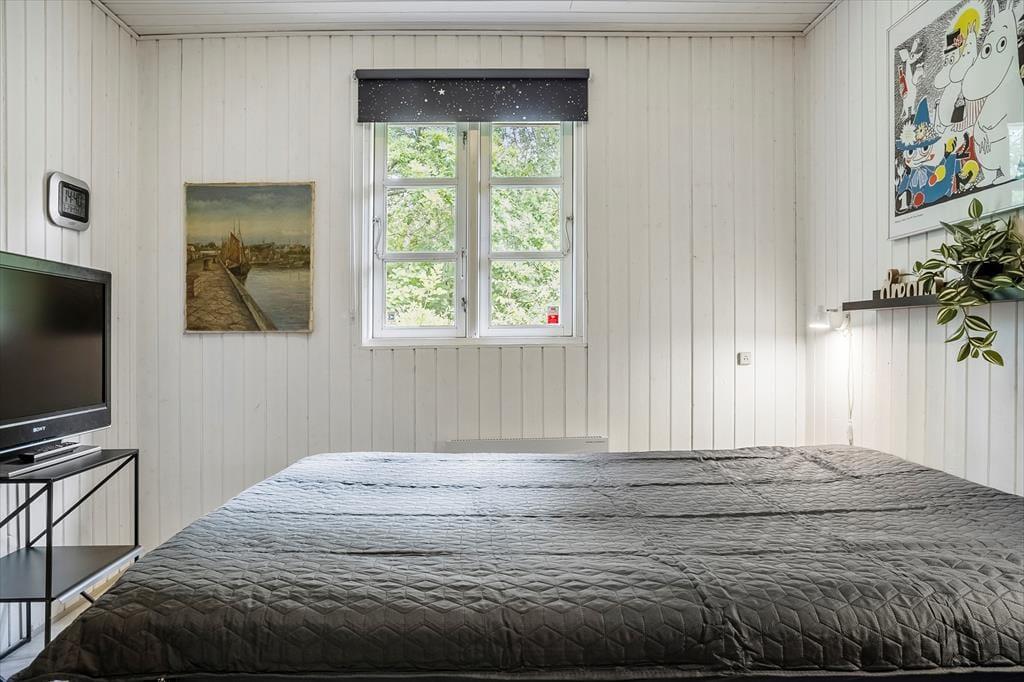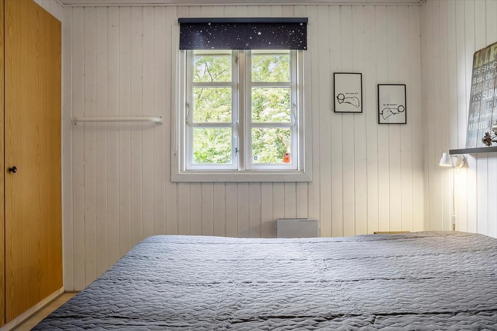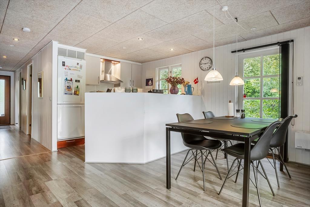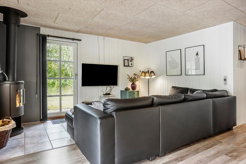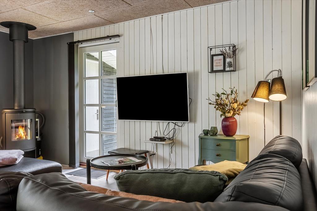 Allerede når du træder ind ad døren, møder du en varm og indbydende atmosfære. Sommerhusets lyse indretning og venlige farvetoner inviterer dig til at sænke skuldrene og tage ferien i helt roligt tempo. Stuen og køkkenet ligger i åben forbindelse, hvilket gør det let at være sammen – også når nogen laver mad, og andre nyder et spil kort ved spisebordet. Brændeovnen står centralt placeret og sørger for både varme og feriestemning, når flammerne knitrer bag ruden og skaber den helt særlige hygge, man kun finder i et sommerhus. Her er plads til at samle familien til nærvær, latter og langsomme dage i sofaen – og med god plads til seks personer er der rig mulighed for, at både børn og voksne kan føle sig godt tilpas.