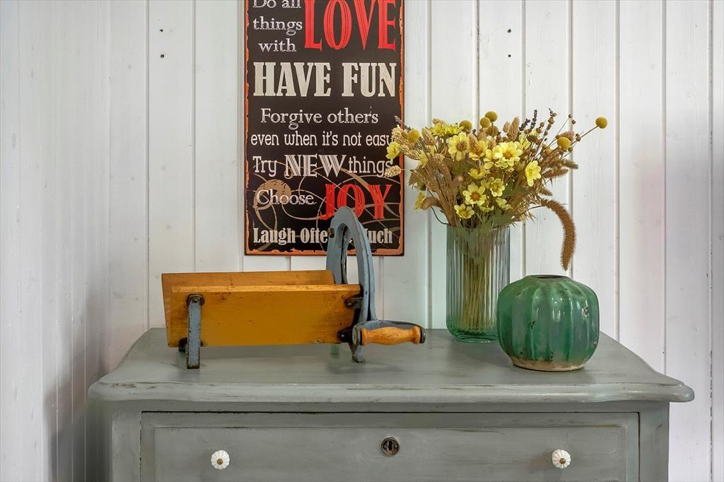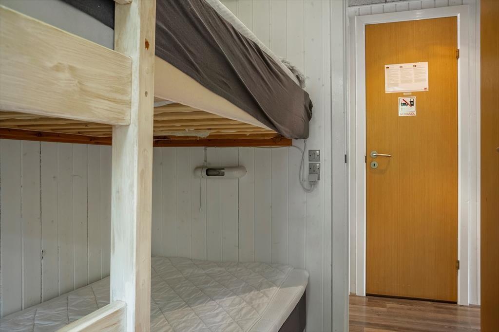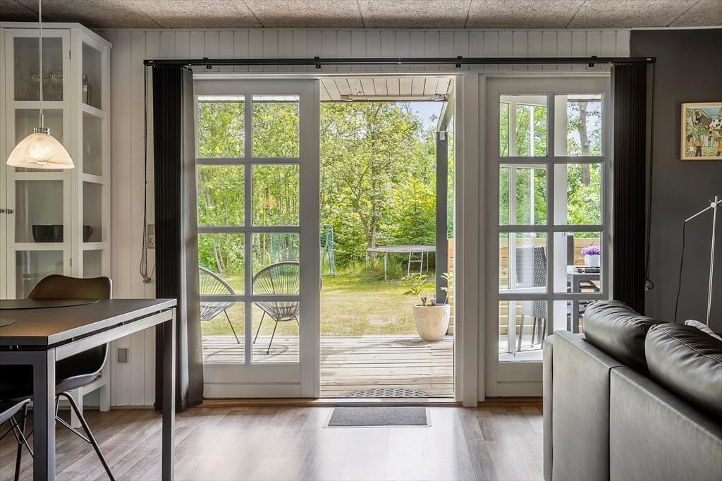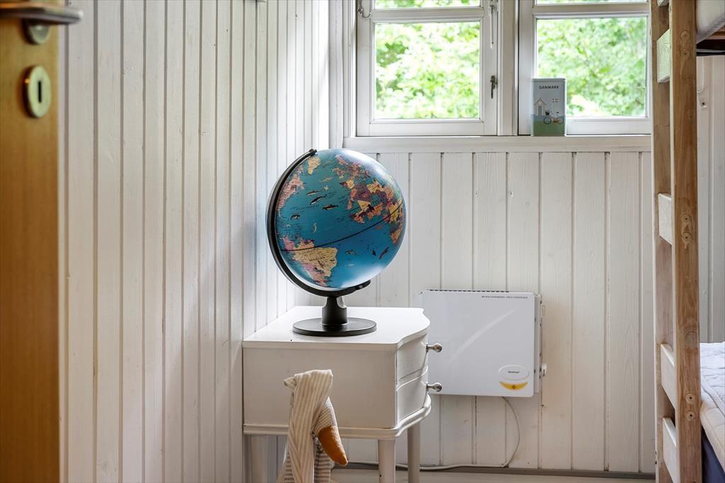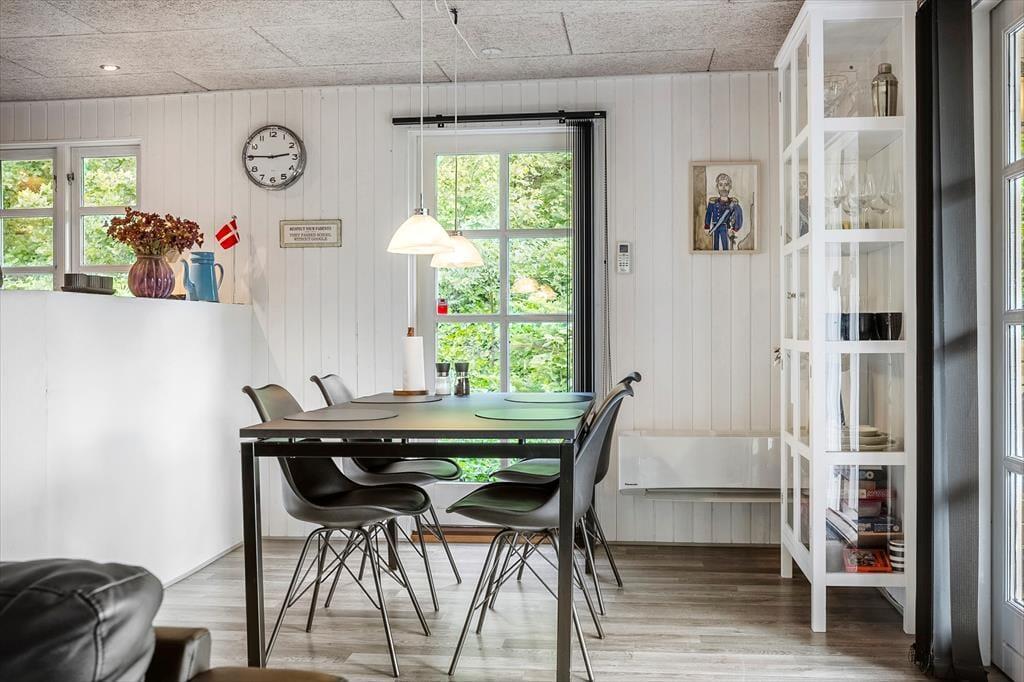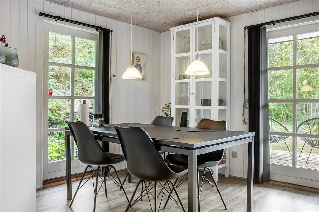 Allerede når du træder ind ad døren, møder du en varm og indbydende atmosfære. Sommerhusets lyse indretning og venlige farvetoner inviterer dig til at sænke skuldrene og tage ferien i helt roligt tempo. Stuen og køkkenet ligger i åben forbindelse, hvilket gør det let at være sammen – også når nogen laver mad, og andre nyder et spil kort ved spisebordet. Brændeovnen står centralt placeret og sørger for både varme og feriestemning, når flammerne knitrer bag ruden og skaber den helt særlige hygge, man kun finder i et sommerhus. Her er plads til at samle familien til nærvær, latter og langsomme dage i sofaen – og med god plads til seks personer er der rig mulighed for, at både børn og voksne kan føle sig godt tilpas.
