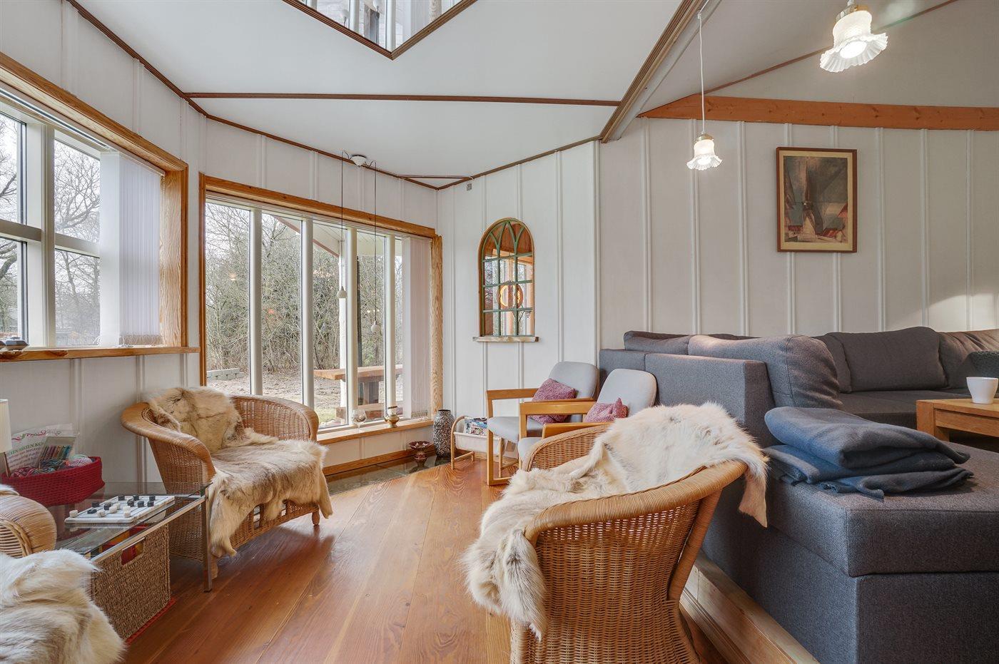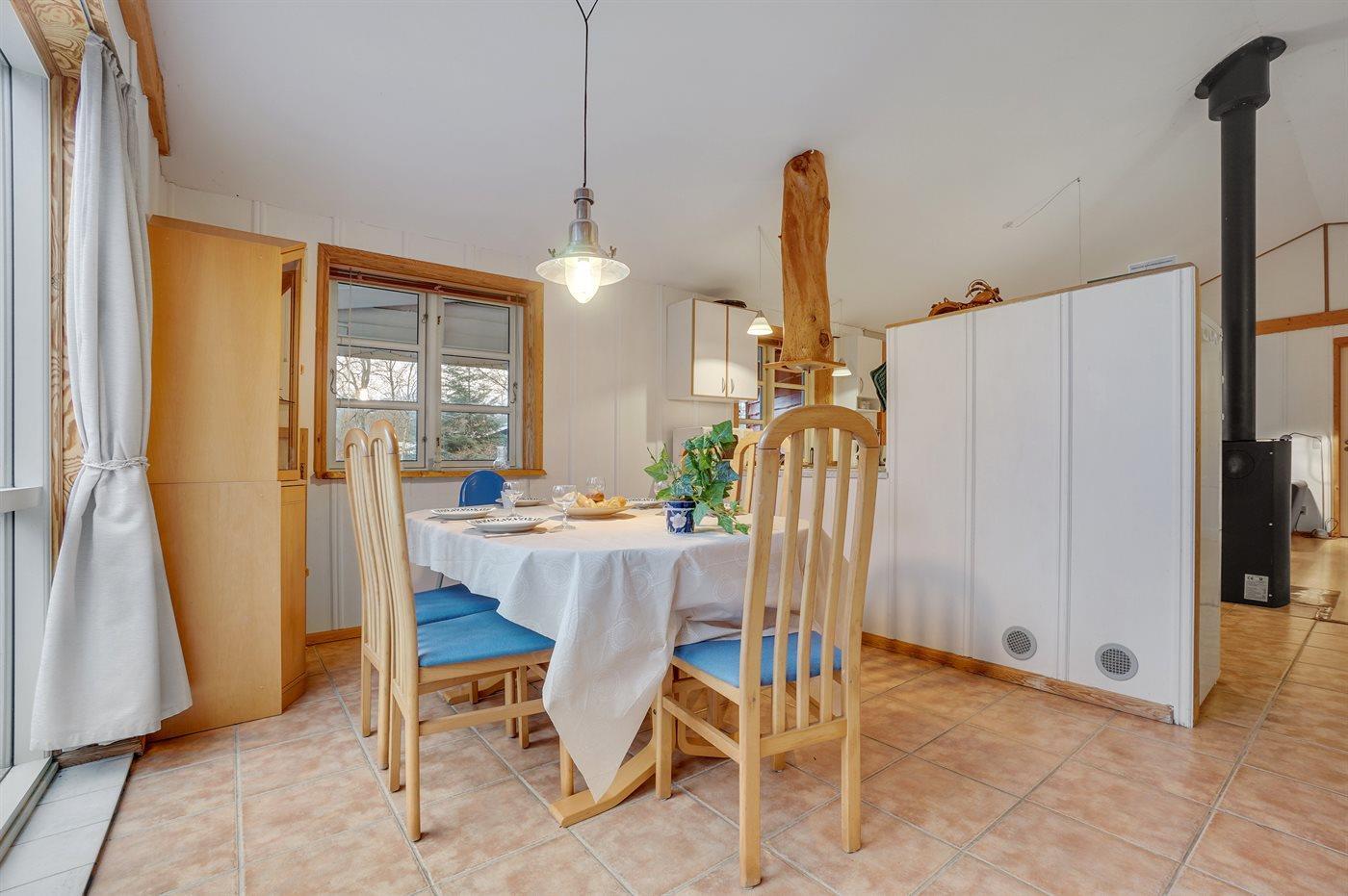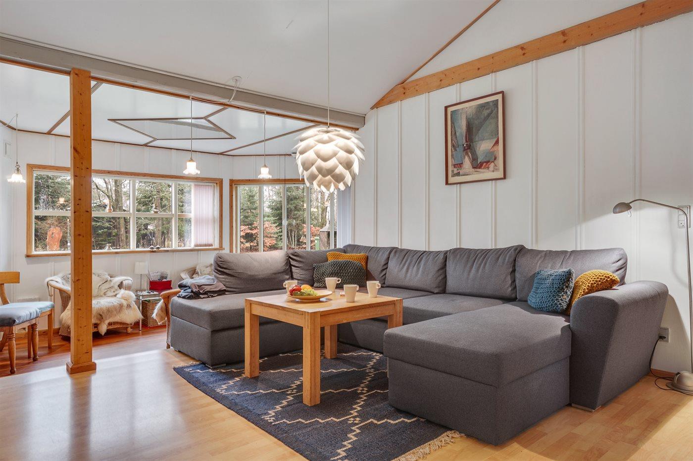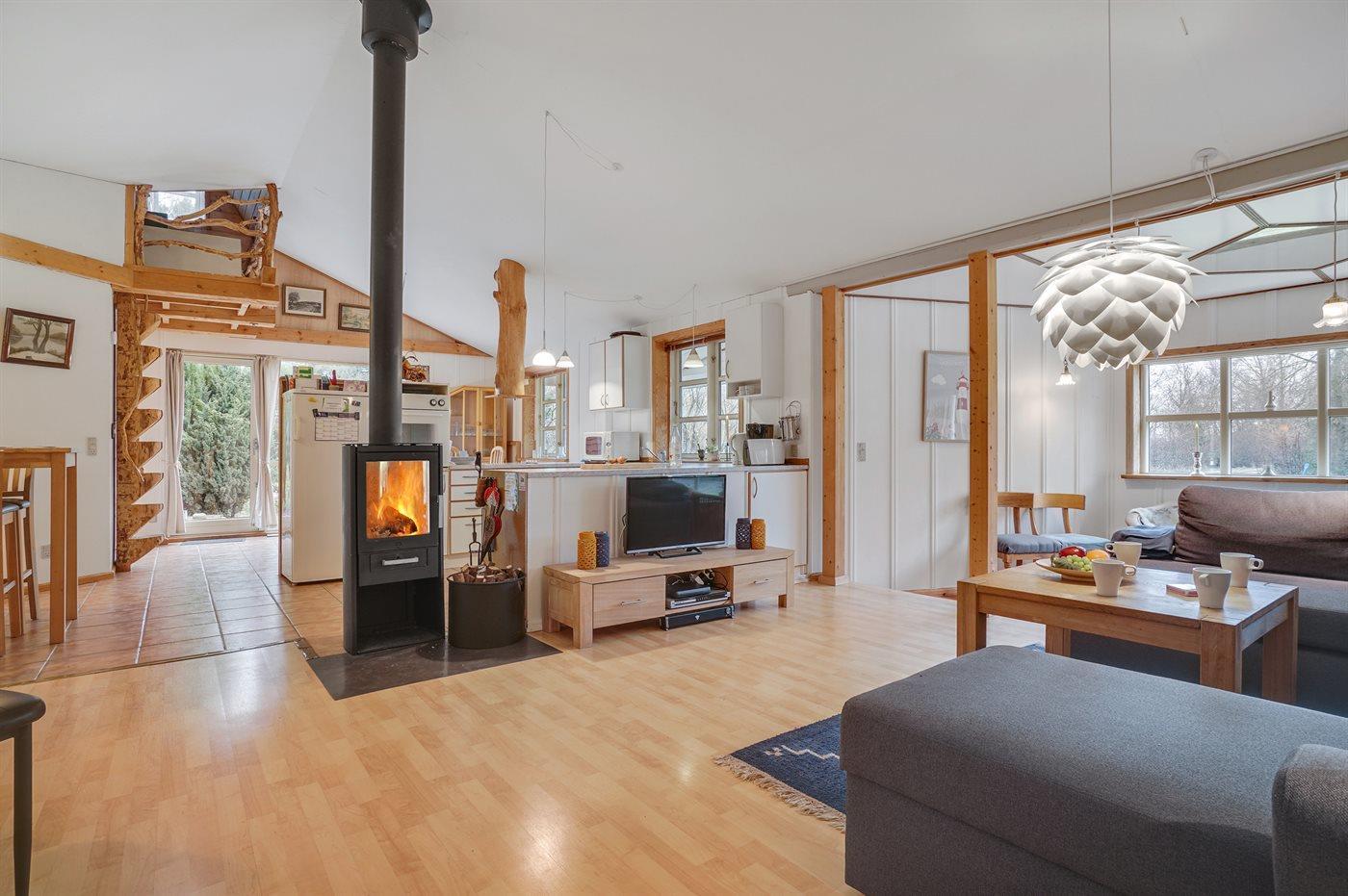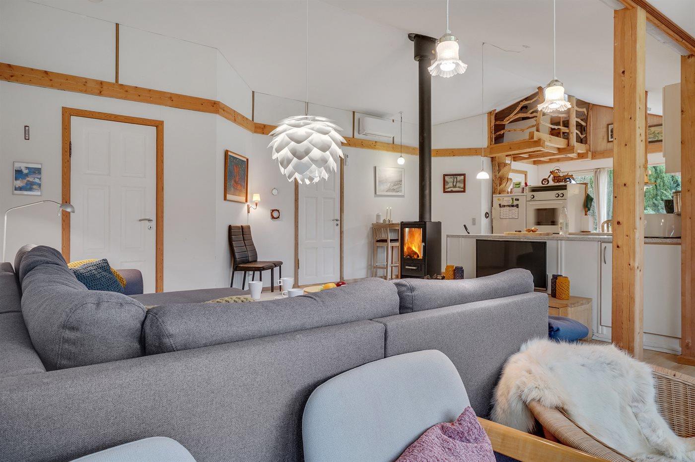 Sommerhuset er stemningsfuldt indrettet med lyse rum og komfortable møbler. Her kan I få mange hyggelige stunder i husets samlingspunkt – den kombinerede spise- og opholdsstue, der har åben forbindelse til køkkenet.