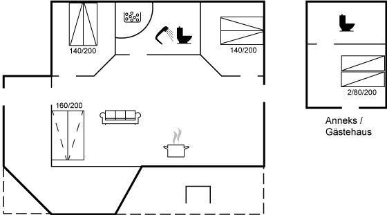 Der er i alt 3 soveværelser. Sovepladserne fordeler sig på: 4 sovepladser i dobbeltsenge. 2 sovepladser i enkeltsenge. 2 sovepladser i sovesofa (enkelt).- 2 af disse sovepladser befinder sig i anneks og 2 i stuen. Derudover er der 1 stk. barneseng.
