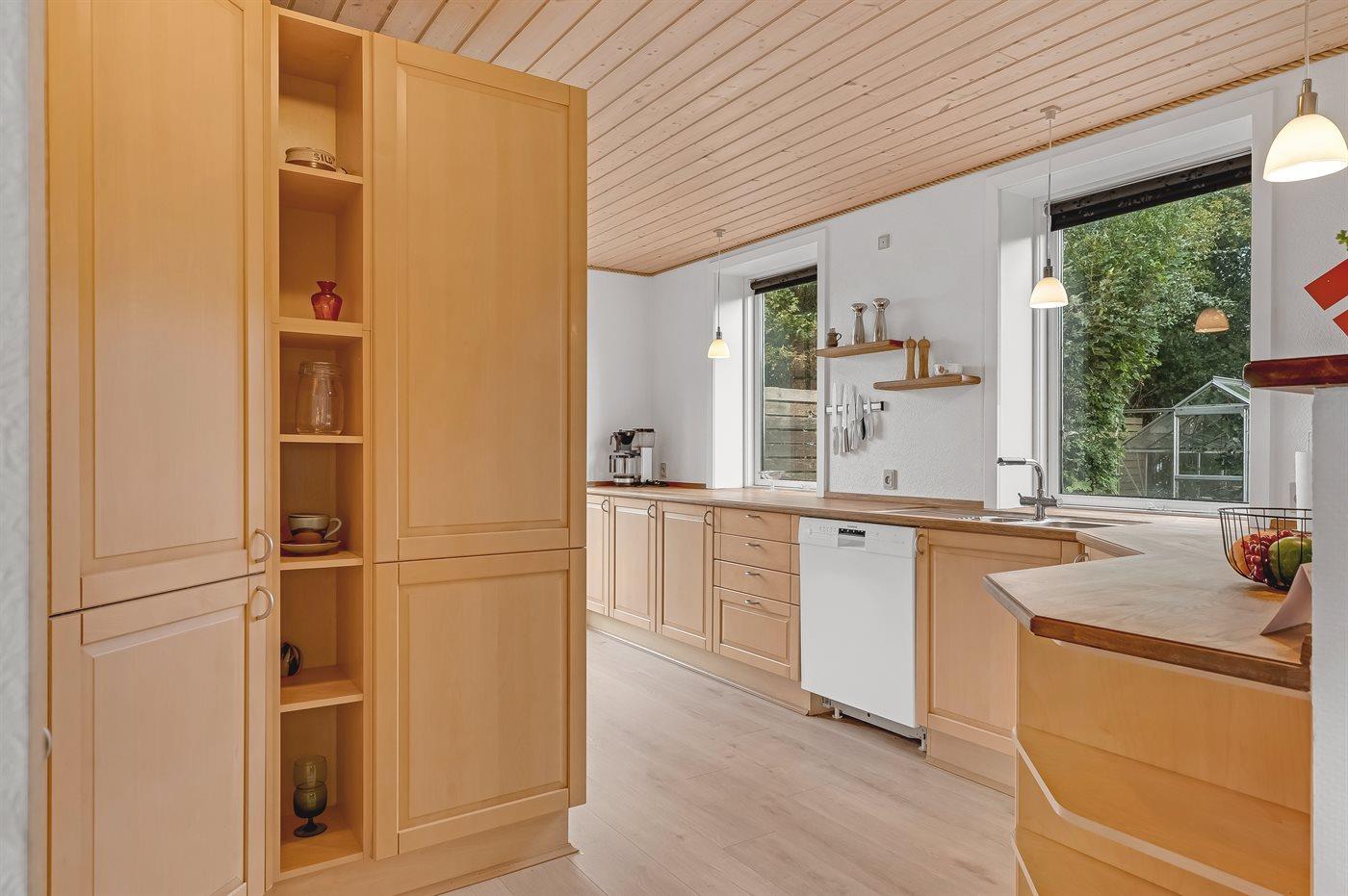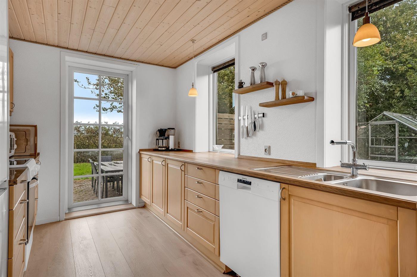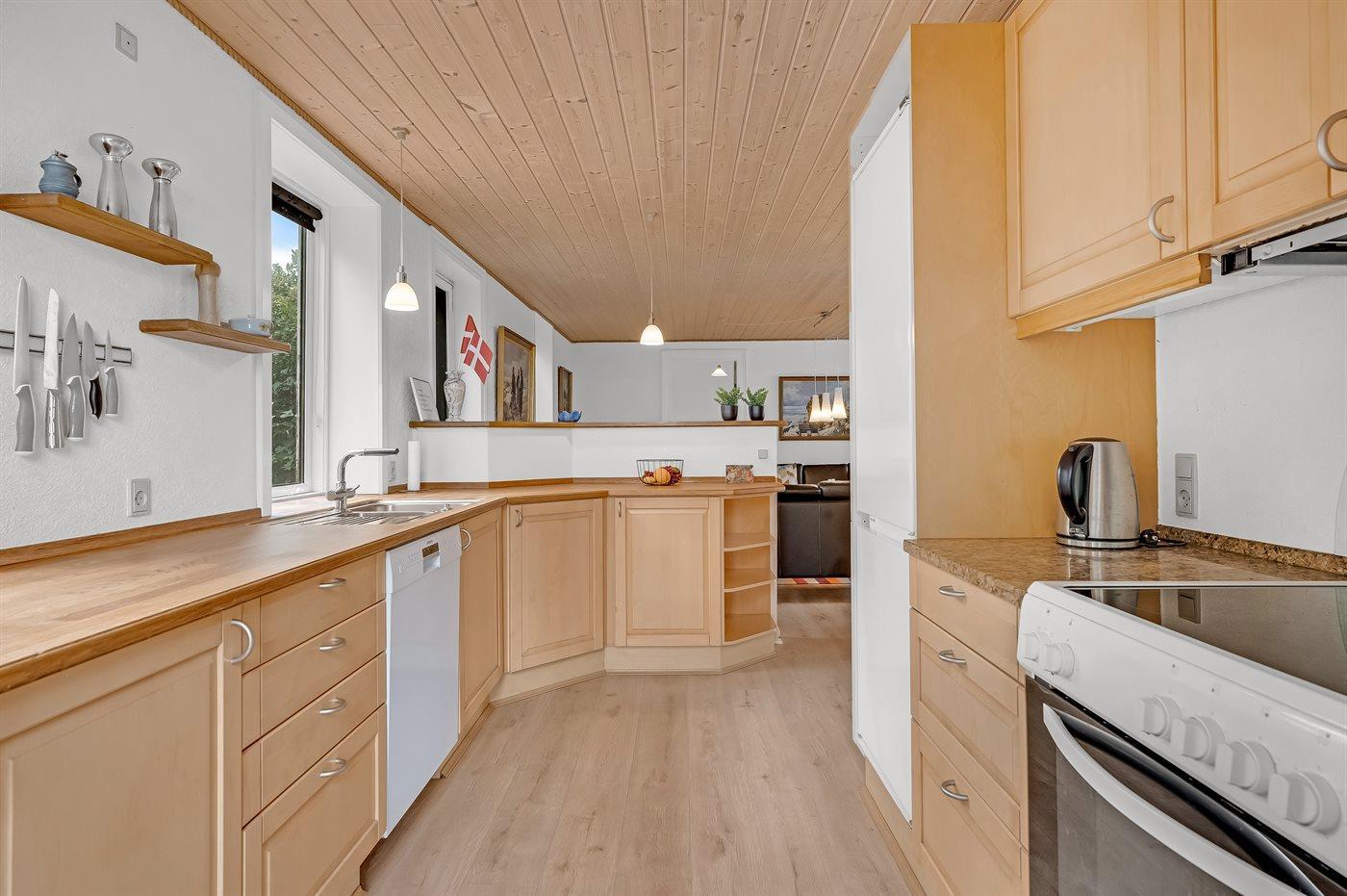 Køkkenet er udstyret med 1 køleskab. Der er 4 elkogeplader, varmluftovn, mikrobølgeovn samt opvaskemaskine Der er gulvvarme i køkkenet.