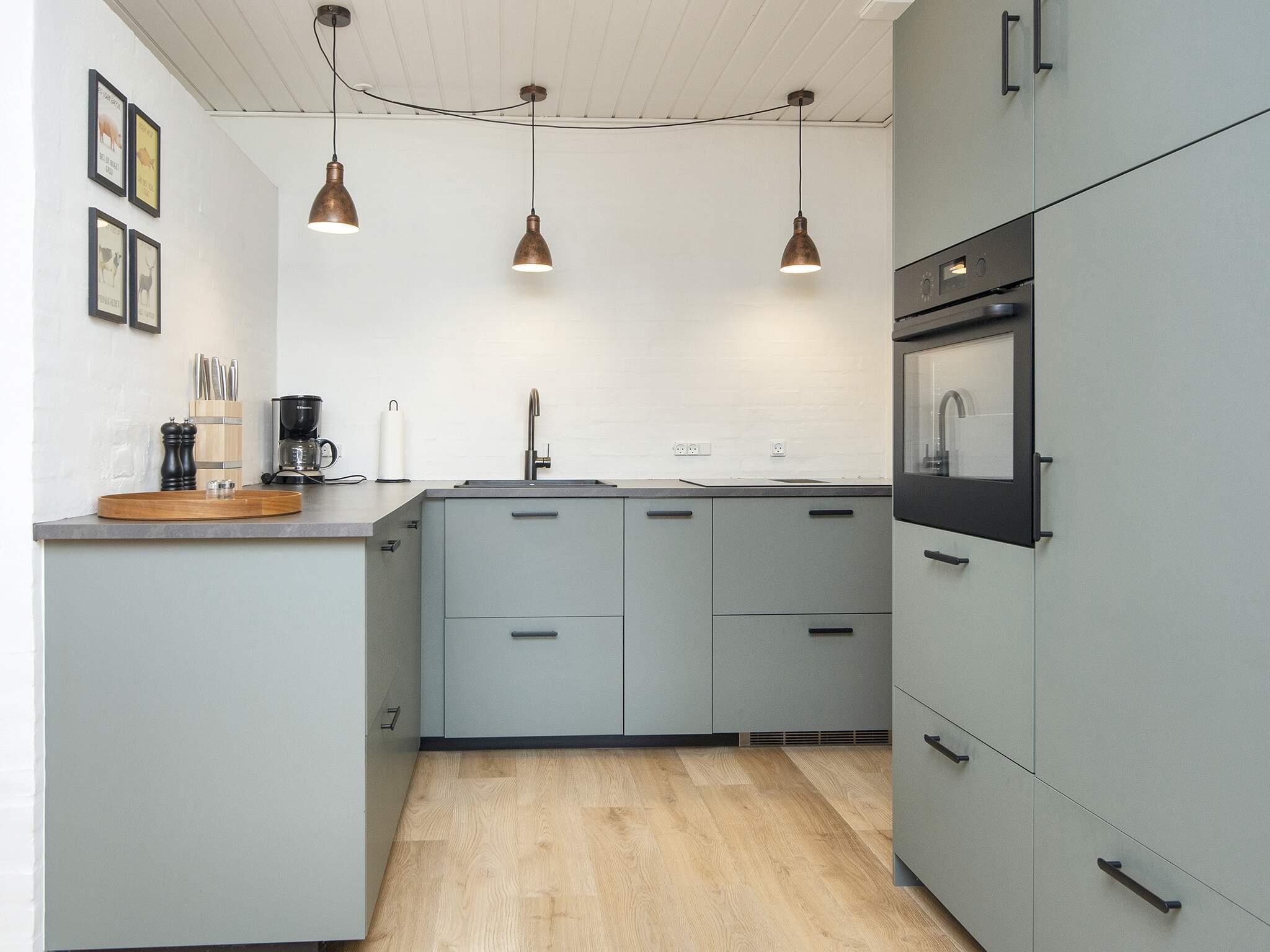 Køkken: Brændeovn, køle-frys, mikroovn, induktionskomfur, kaffemaskine