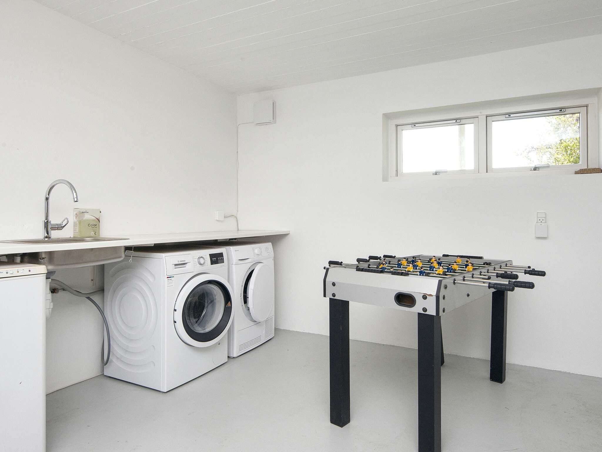 Husets anden fløj byder på tre ekstra soveværelser, et gæstetoilet og en lys stue med endnu en brændeovn – et indbydende rum til familiesammenkomster eller stille stunder med en bog. Praktiske faciliteter såsom et vaskerum tilføjer bekvemmelighed, mens aktivitetsrummet inviterer både børn og voksne til at nyde leg og sjov sammen.