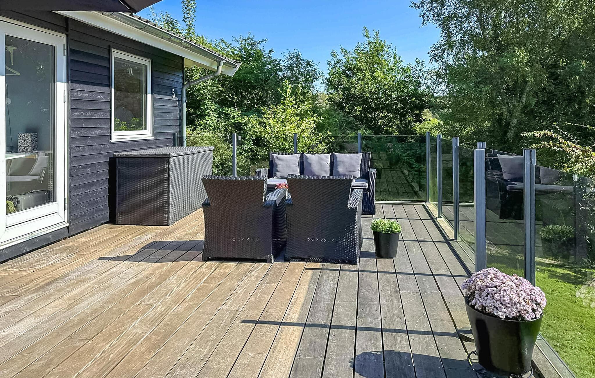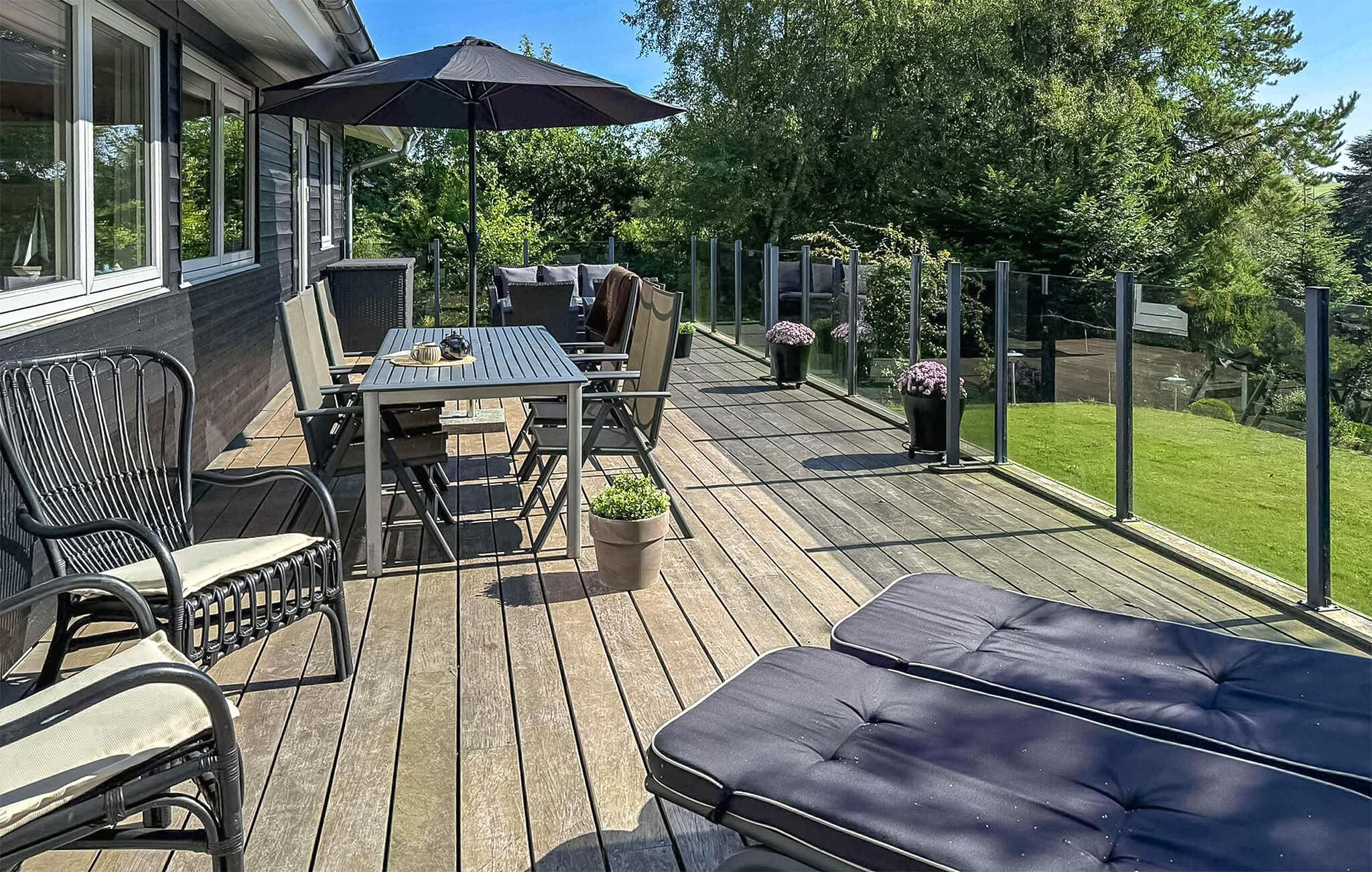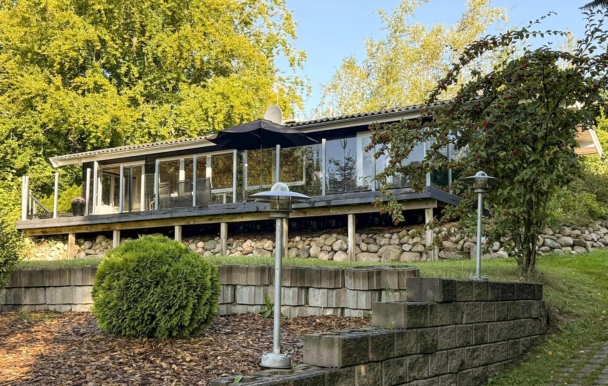 Flot renoveret sommerhus med udsigt til sø og stor sydvendt terrasse i naturskønt område nær strand og indkøb.