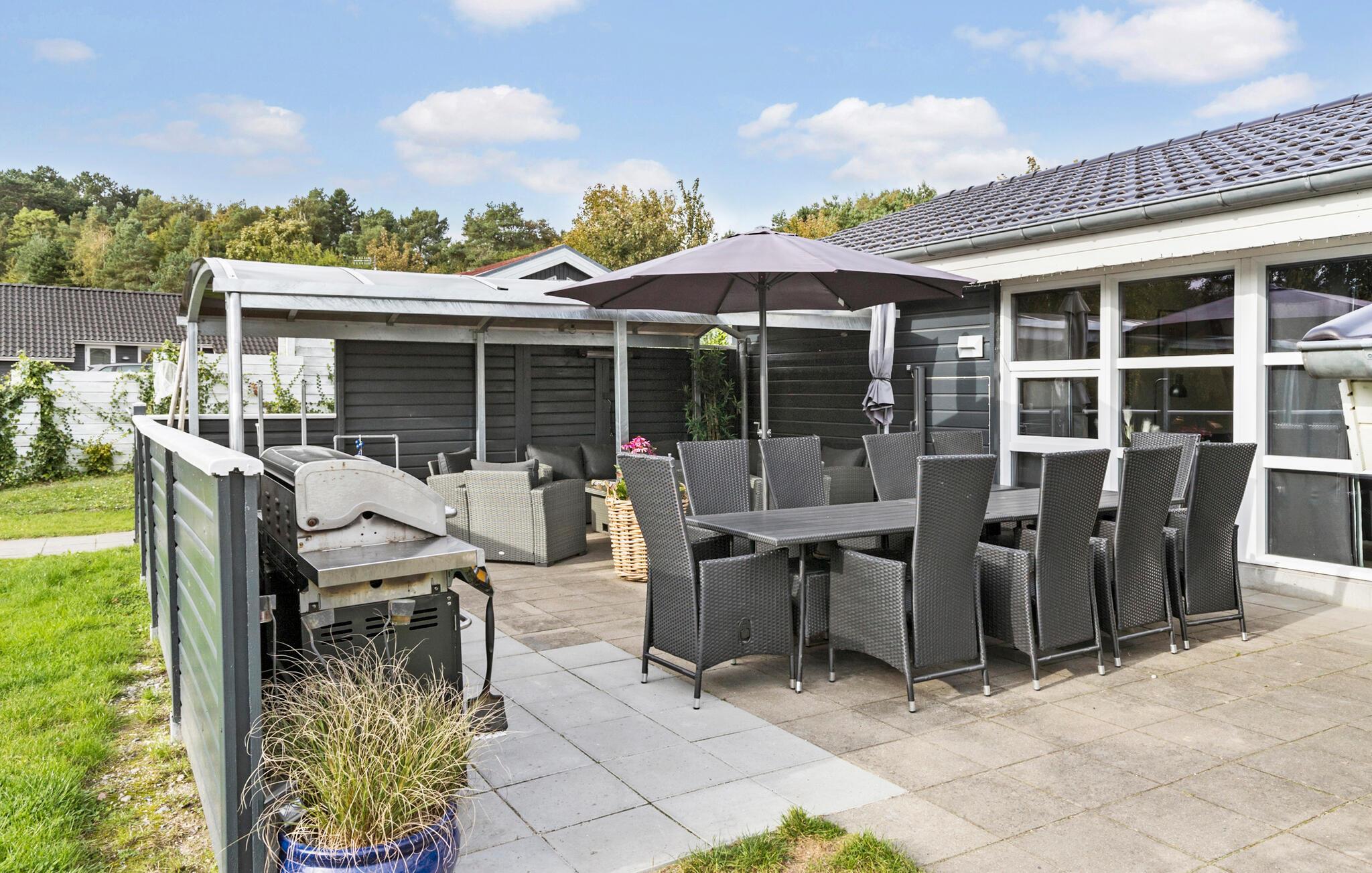 På de store terrasser kan I nyde solen og de dejlige middage, som I kan tilberede på grillen. I kan sætte ekstra trumf på udelivet og overnatte i shelteret i haven. Her kan I også samles om den flotte bålplads med faste bænke og bage snobrød eller riste skumfiduser, mens mørket sænker sig.