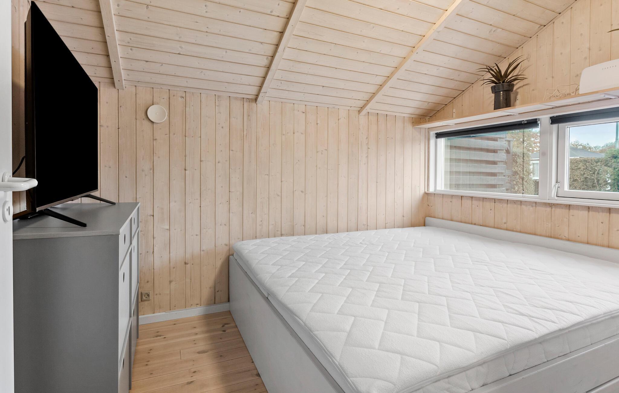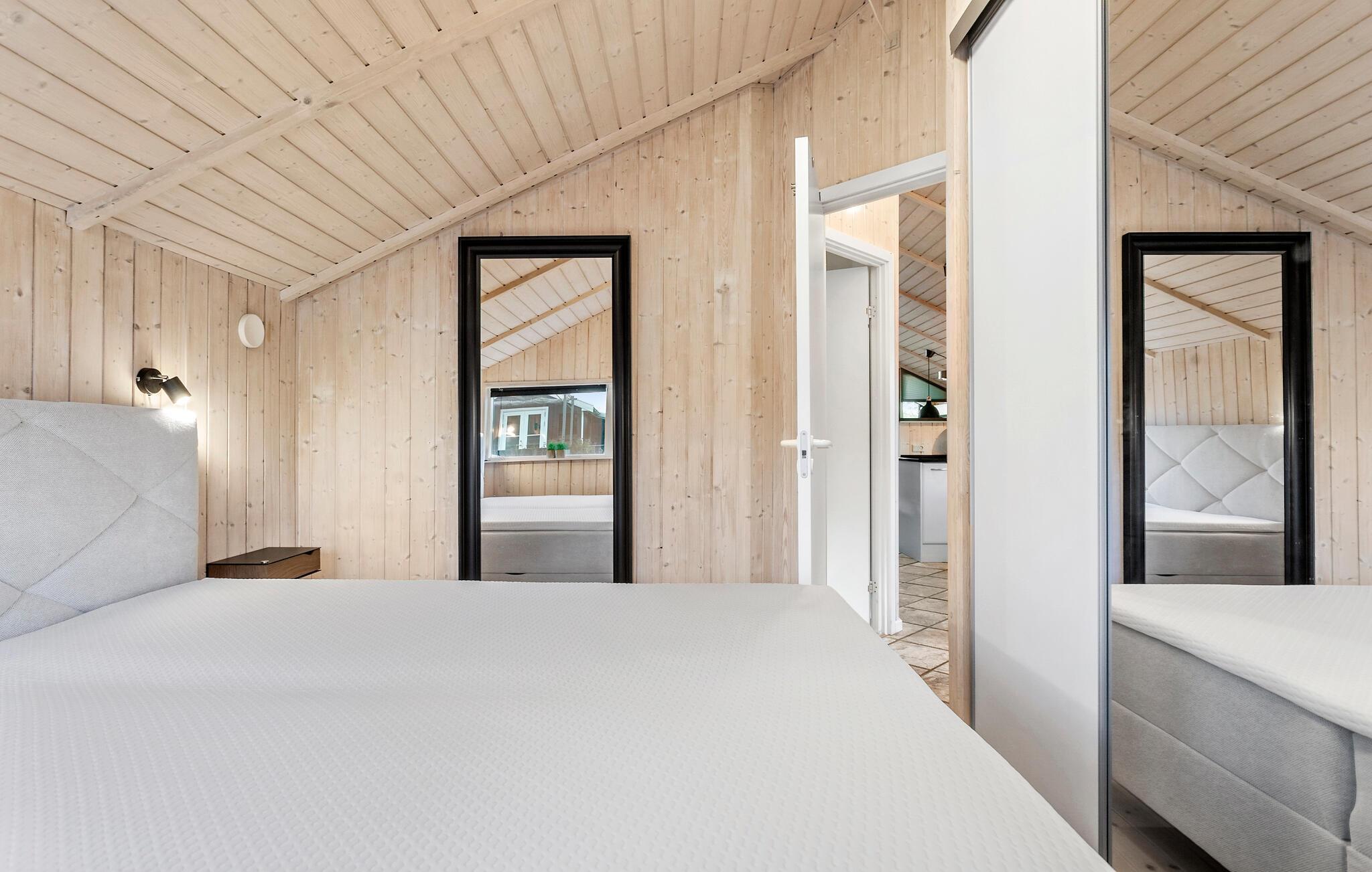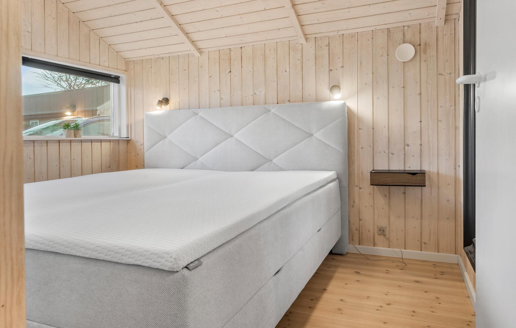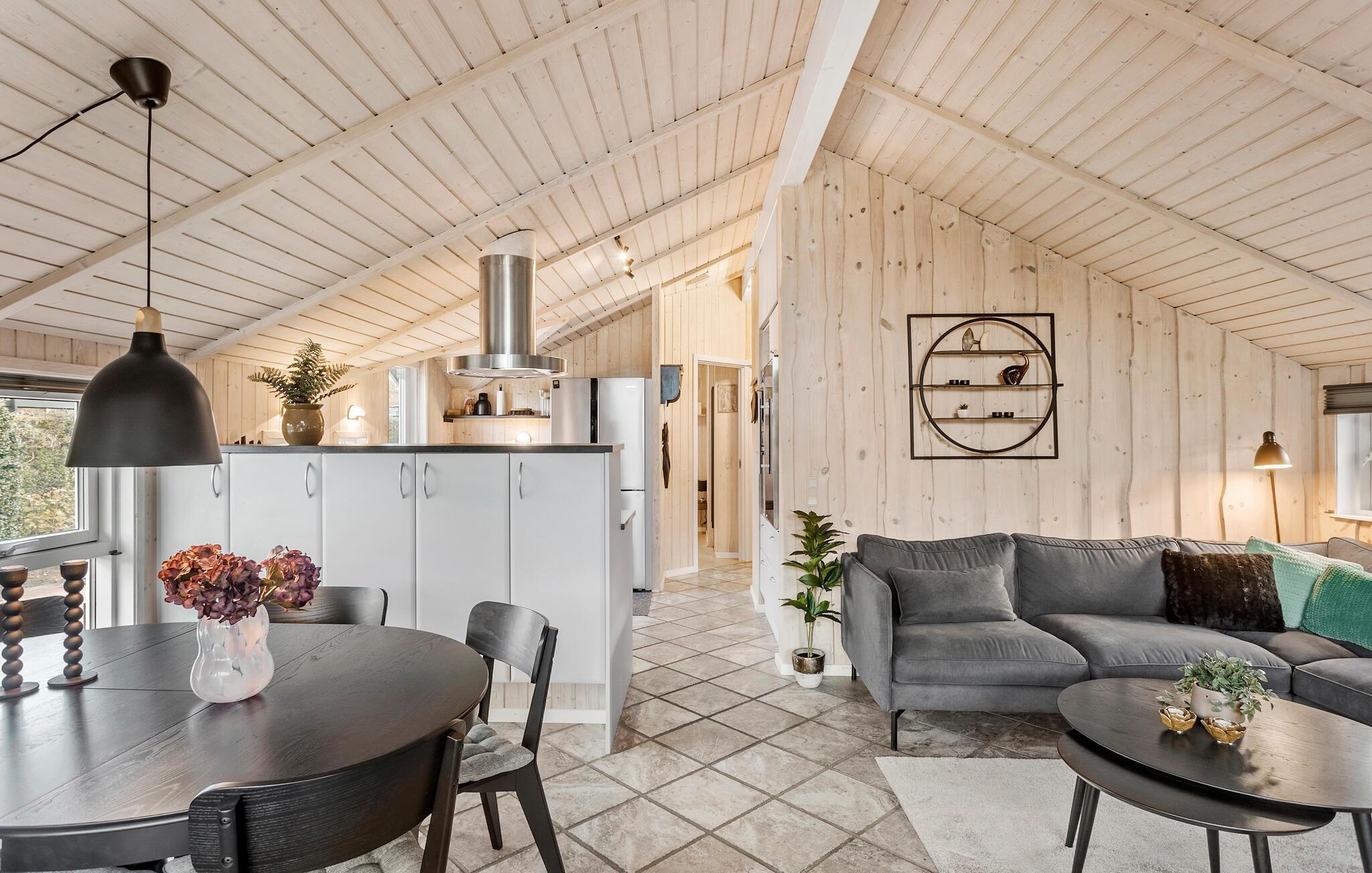 Der er kun en lille gåtur ned til stranden fra dette herlige hus, hvor I kan se frem til nogle fredfyldte feriedage. Det åbne opholdsområde har lyse trævægge og et dejligt lysindfald fra vinduerne, så her er det nemt at koble af. Tilbring hyggelige aftener i siddeområdet med film, brætspil og gode bøger. I udestuen kan I sætte jer med en lun kop te og kigge ud på haven i al slags vejr. Det moderne køkken giver jer gode rammer til at gøre madlavningen til et hyggeligt fællesprojekt.