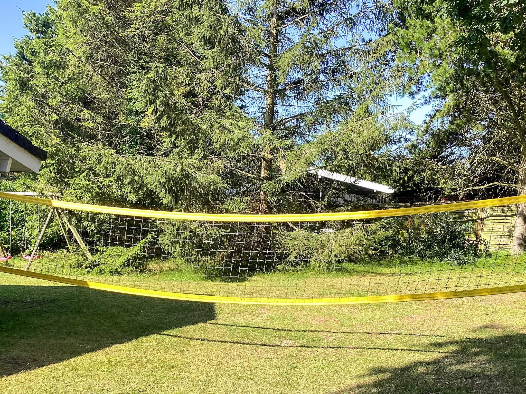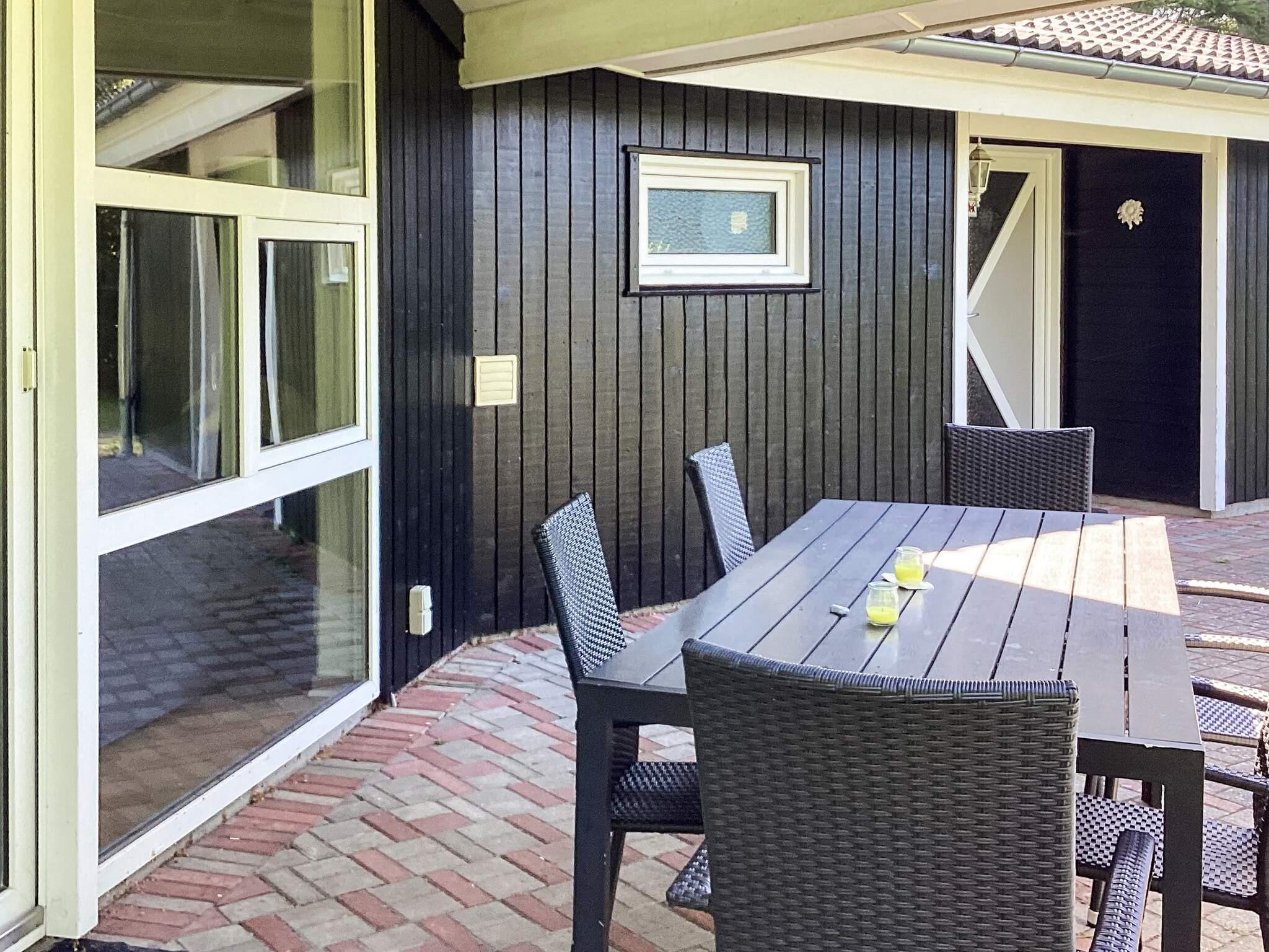 Udendørsområdet tilbyder en ugeneret have på knapt 1400 m2 med flere muligheder for udendørsaktiviteter. Der er bl.a. volleyball/badmintonnet, dart, fodboldmål, sandkasse og gyngestativ. Derudover er der to terrasser. Den mod sydøst fanger morgensolen, hvor morgenmaden kan indtages. Terrassen mod sydvest er overdækket og har en stenovnspejs/grill, hvor solen står på næsten hele dagen. Udlejes ikke til ungdomsgrupper.