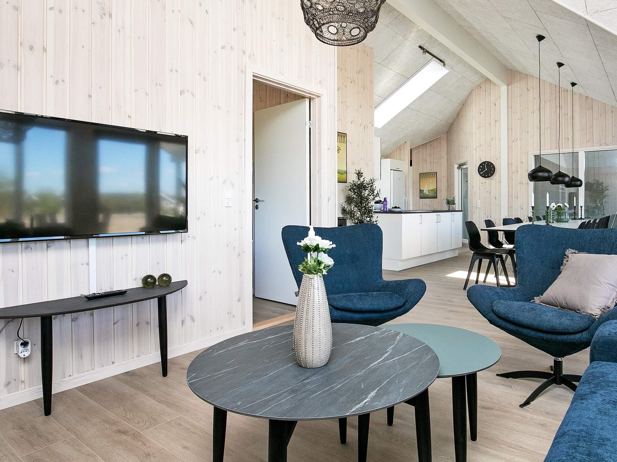 Spise-/opholdsrum er smagfuldt indrettet med stereoanlæg med cd-afspiller, tv, dvd-afspiller, høj barnestol, sofaafdeling og brændeovn. Der er behagelig gulvvarme i hele huset.