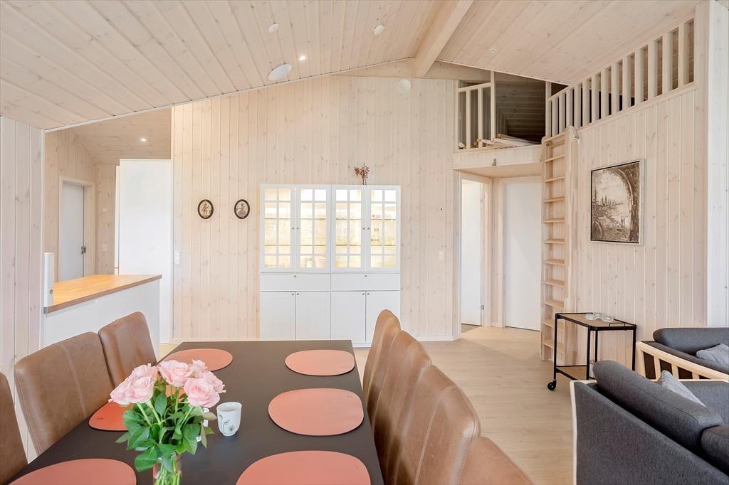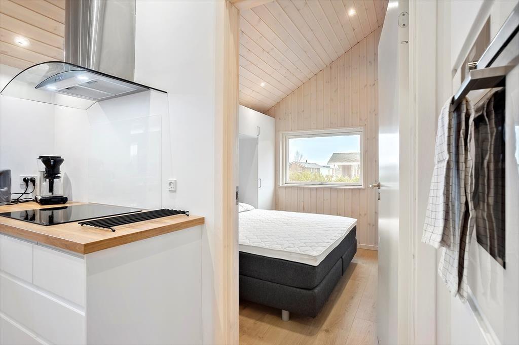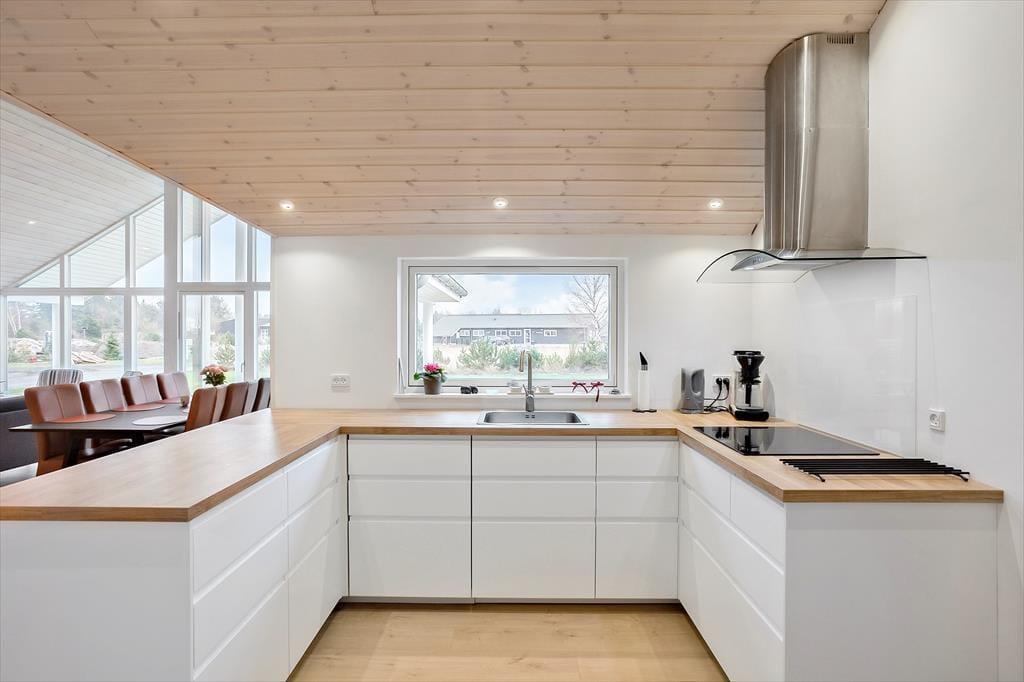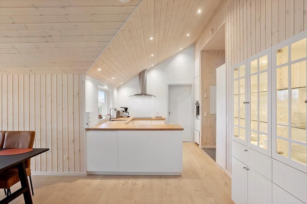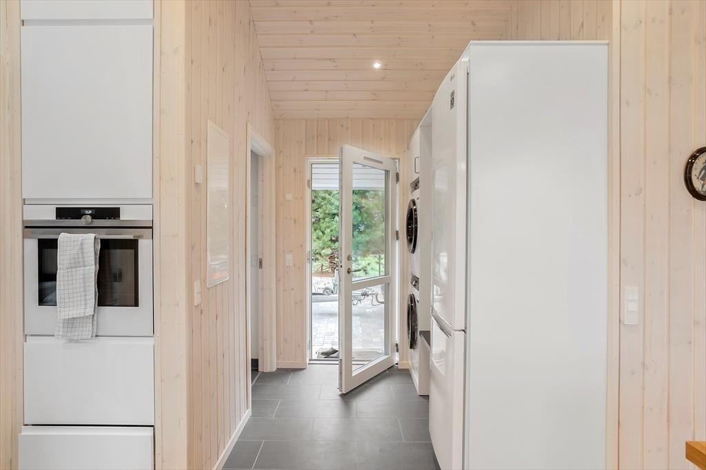 Skønt fritidshus på en flot grund, indrettet i lyse og indbydende farver overalt indvendigt, og byder på et moderne åbent køkken, med køleskab med fryser, ovn, kogeplader, mikroovn og meget mere.