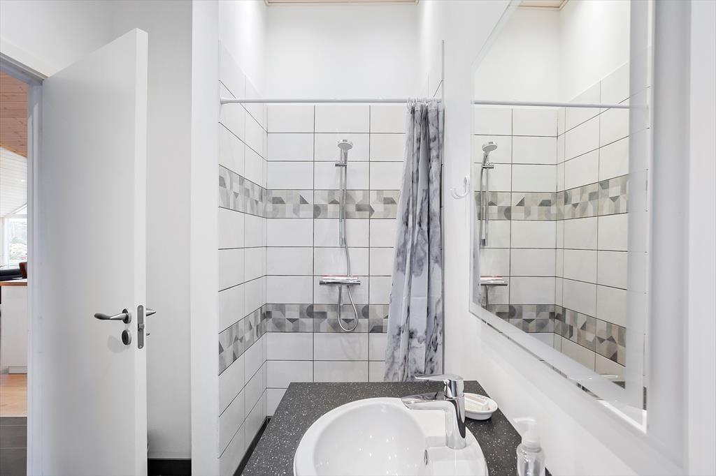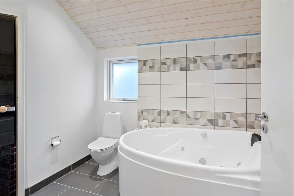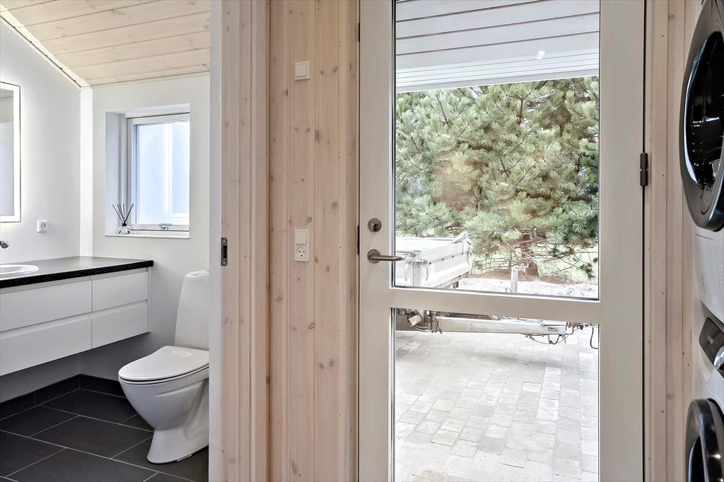 En lille entré med vaskesøjle, hvorfra der er adgang til husets lille badeværelse, hvor der findes et WC og en bruser. Fra køkkenalrummet er der indgang til husets store badeværelse, som rummer både et spabad og wc.