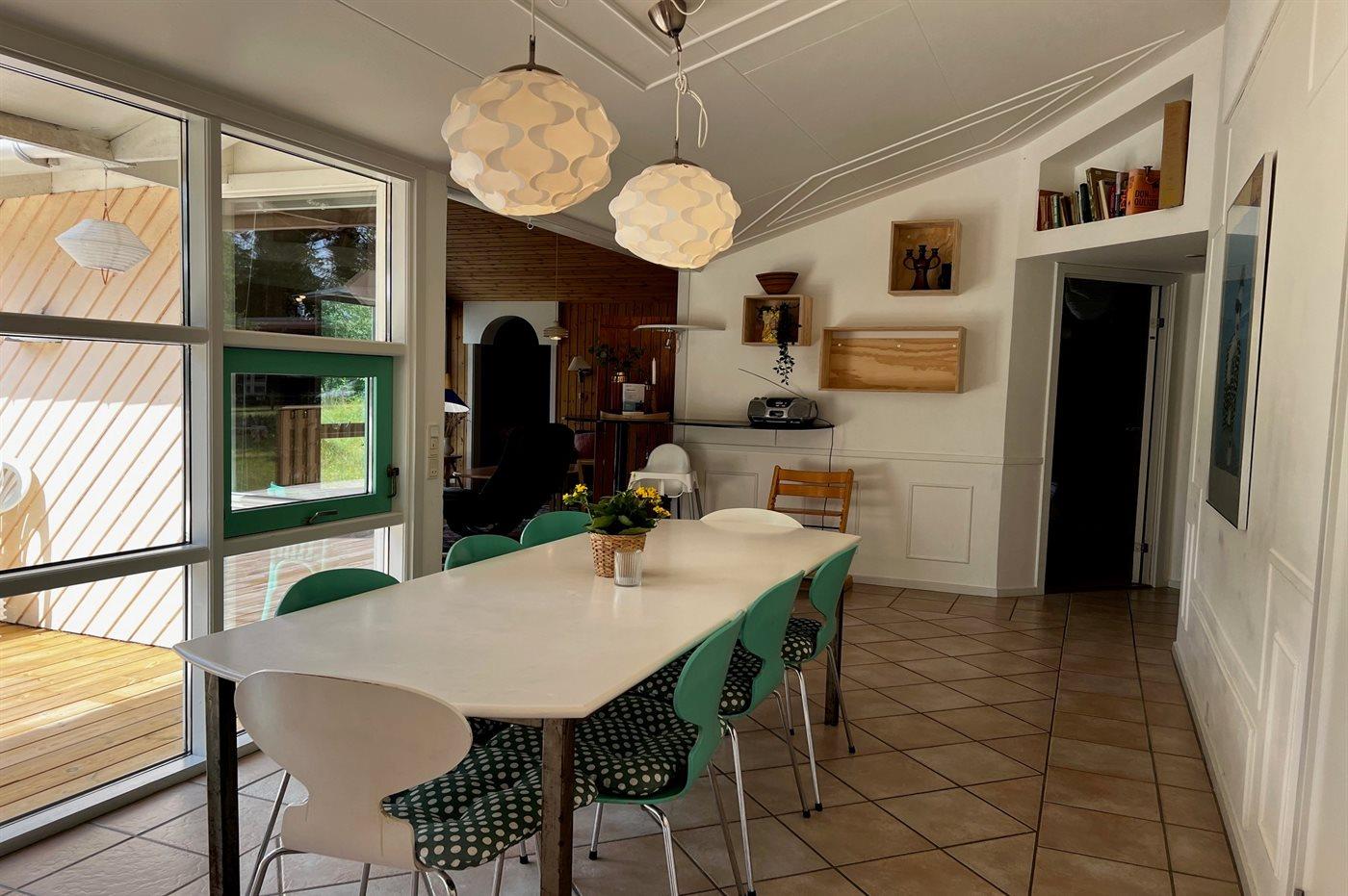 Køkkenet er udstyret med 1 køleskab. Der er ekstra køleskab i udestuen. Der er 4 elkogeplader, bageovn, mikrobølgeovn samt opvaskemaskine Der er gulvvarme i køkkenet.