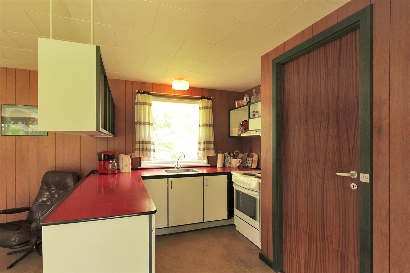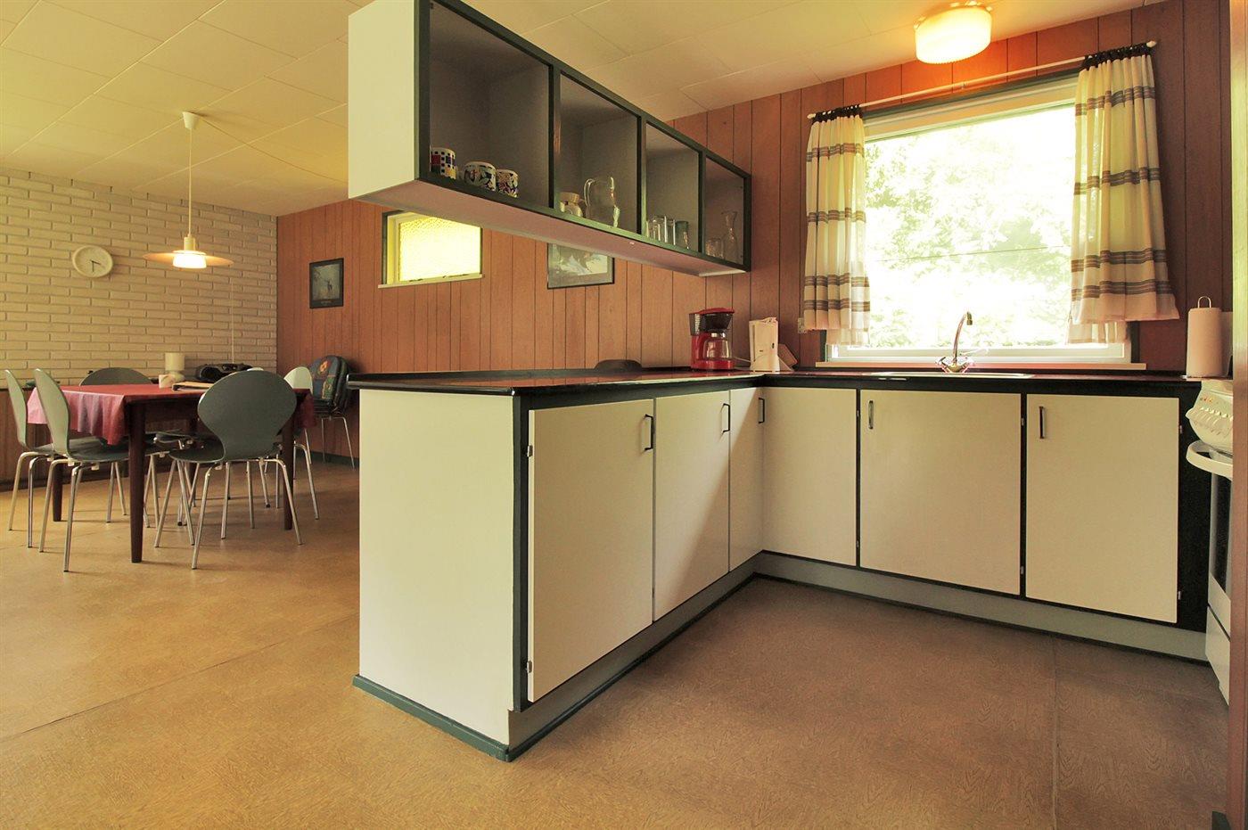 Køkkenet er udstyret med 1 køleskab. Der er 4 elkogeplader, bageovn.