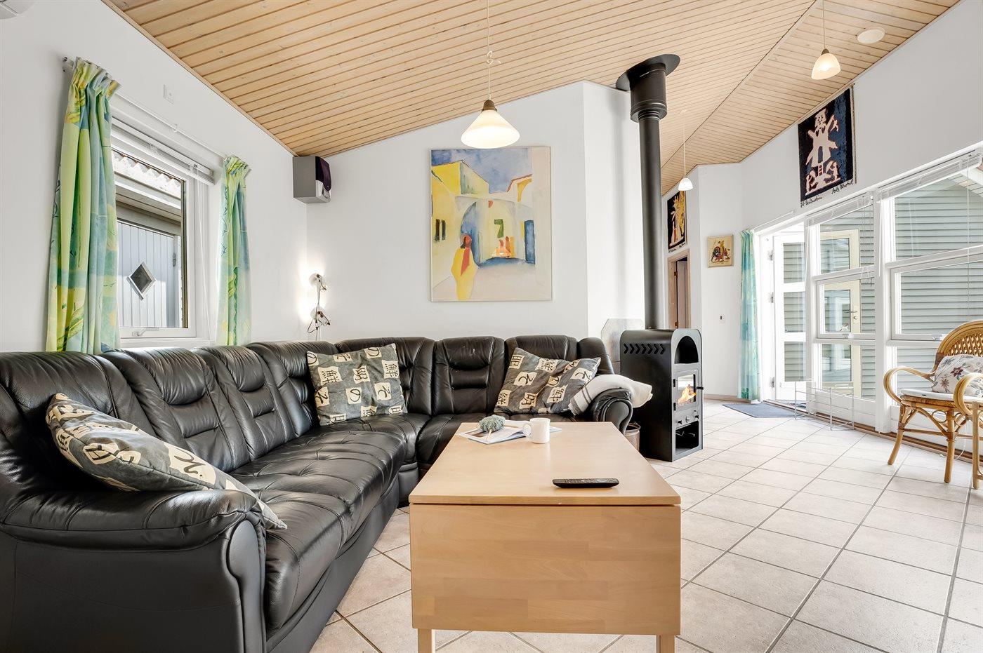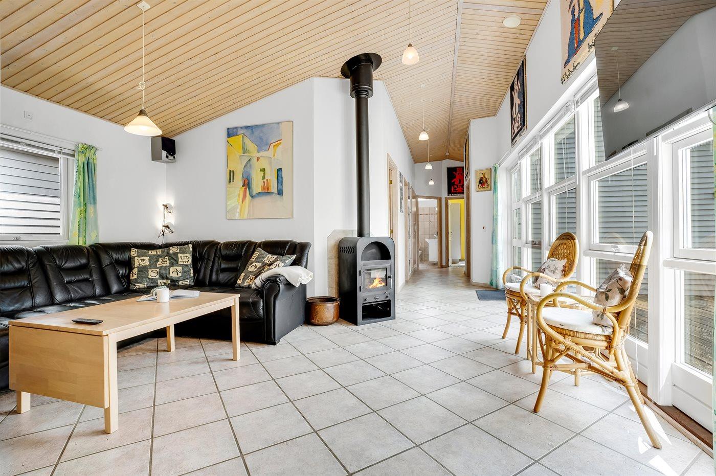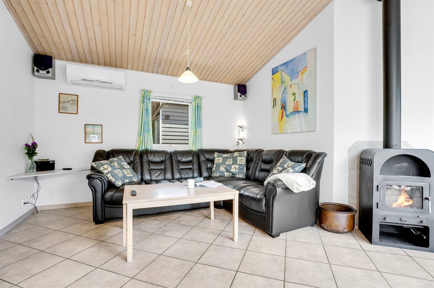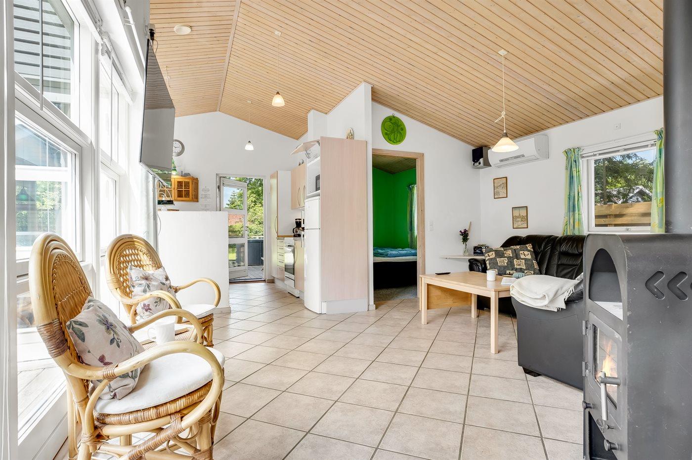 Det lyse køkken som ligger i forbindelse med stuen indeholder bl.a. køleskab med fryser, komfur med keramiske kogeplader, varmluftovn, mikrobølgeovn og opvaskemaskine. I den hyggelige og moderne indrettede stue finder I brændeovn, Smart-TV og radio.