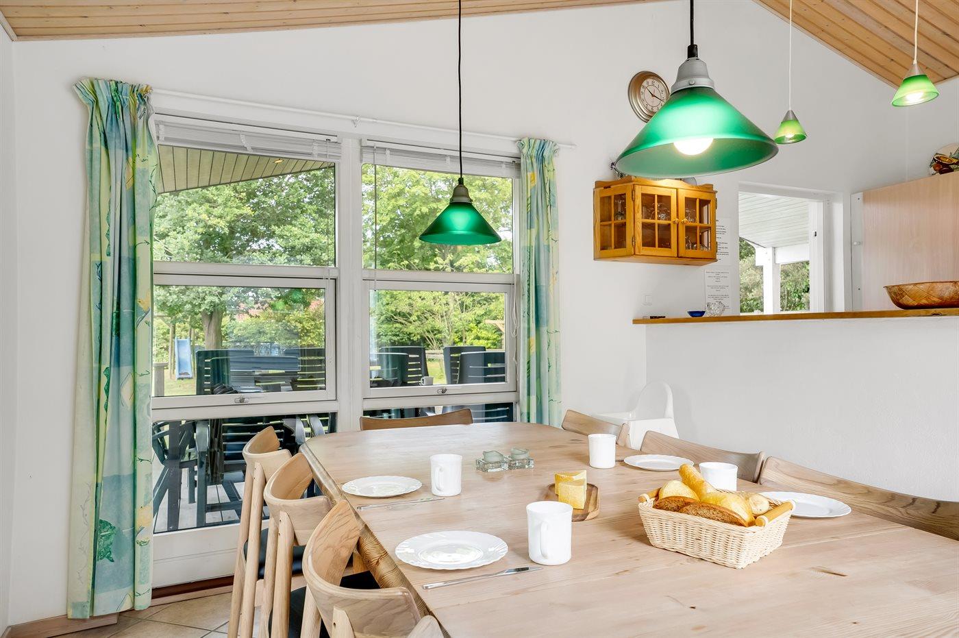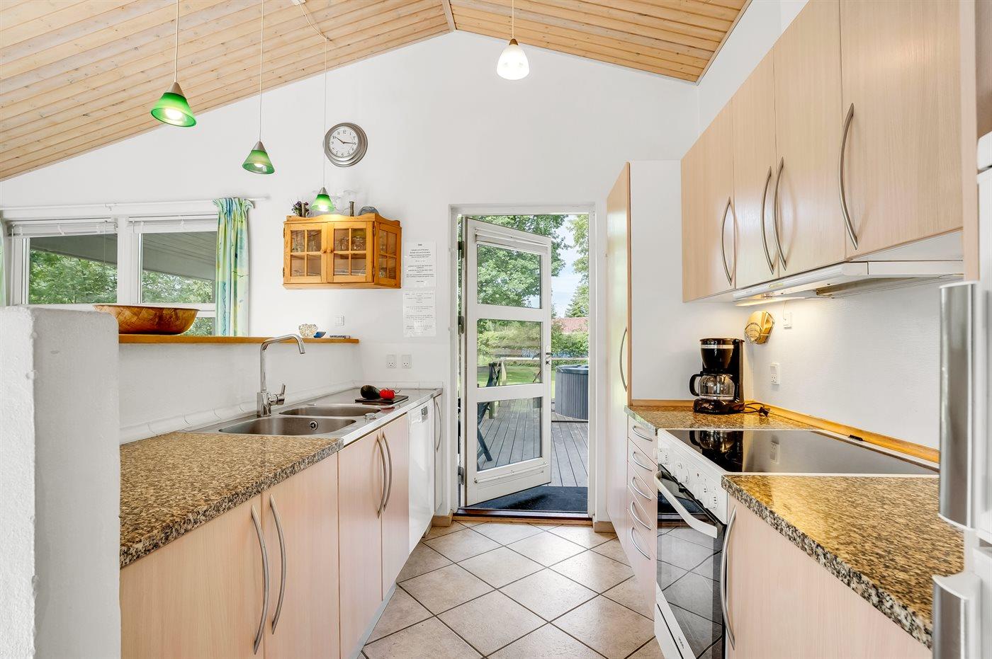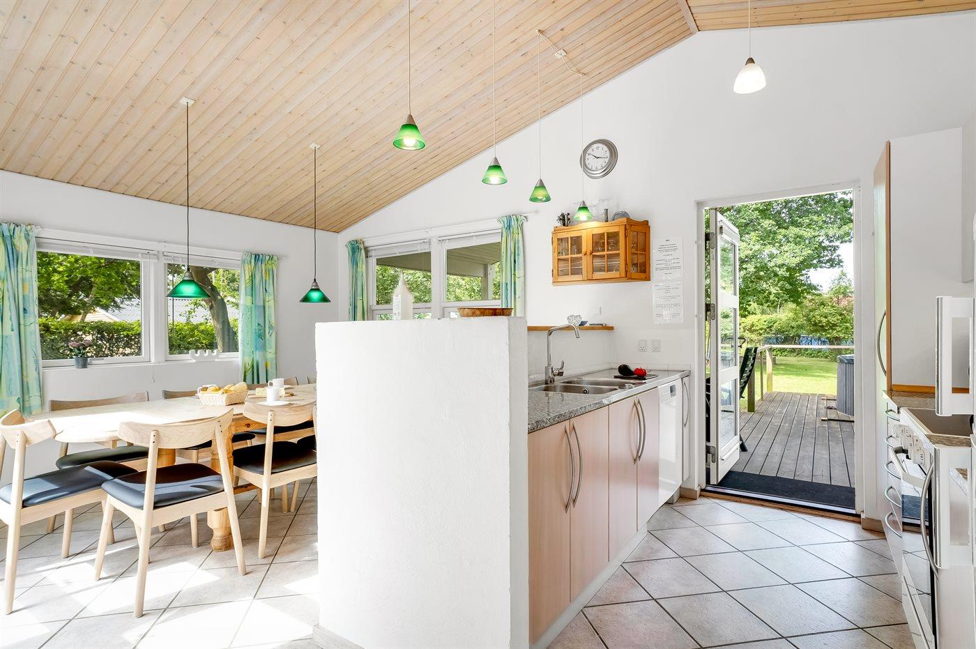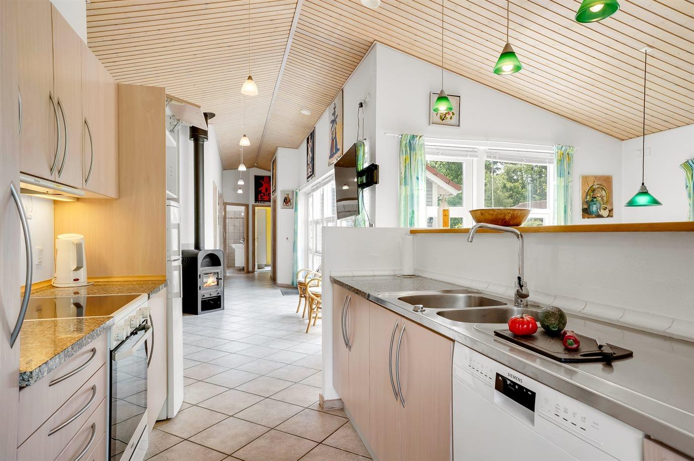 Det lyse køkken som ligger i forbindelse med stuen indeholder bl.a. køleskab med fryser, komfur med keramiske kogeplader, varmluftovn, mikrobølgeovn og opvaskemaskine. I den hyggelige og moderne indrettede stue finder I brændeovn, Smart-TV og radio.