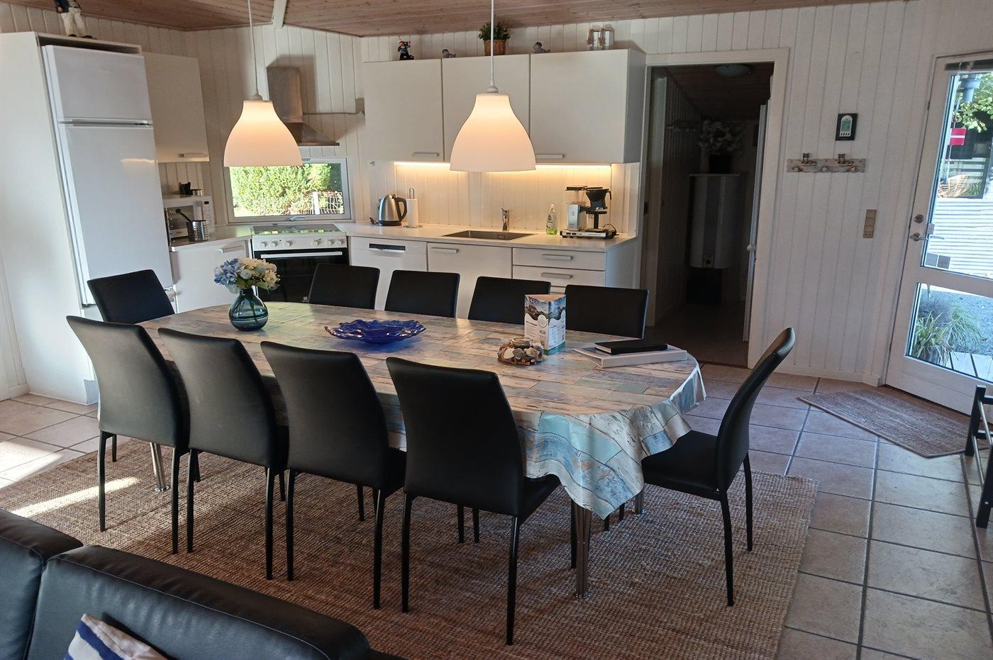 Der er indgang til en lille entré i hjørnet af køkken-alrummet, hvor man træder direkte ind i husets hjerte. Herfra er der frit kik til køkkenafdelingen, som indeholder alt hvad der behøves til en god ferie. Køkkenet ligger i åben forbindelse med stuen, der indeholder en sofagruppe samt TV, og store vinduer ud mod haven. Et stort spisebord adskiller køkkenet fra stuen.