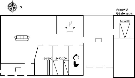 Der er i alt 3 soveværelser. Sovepladserne fordeler sig på: 2 sovepladser i dobbeltseng. 2 sovepladser i enkeltsenge. 2 sovepladser i køjeseng. 2 sovepladser på madrasser. 2 af disse sovepladser befinder sig i et anneks og 2 af dem befinder sig på hemsen. Derudover er der 1 stk. barneseng.