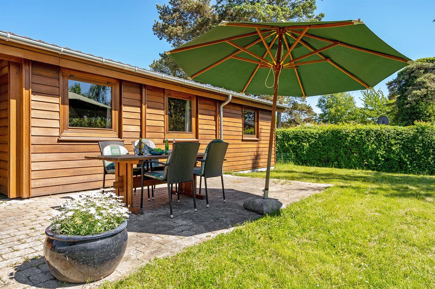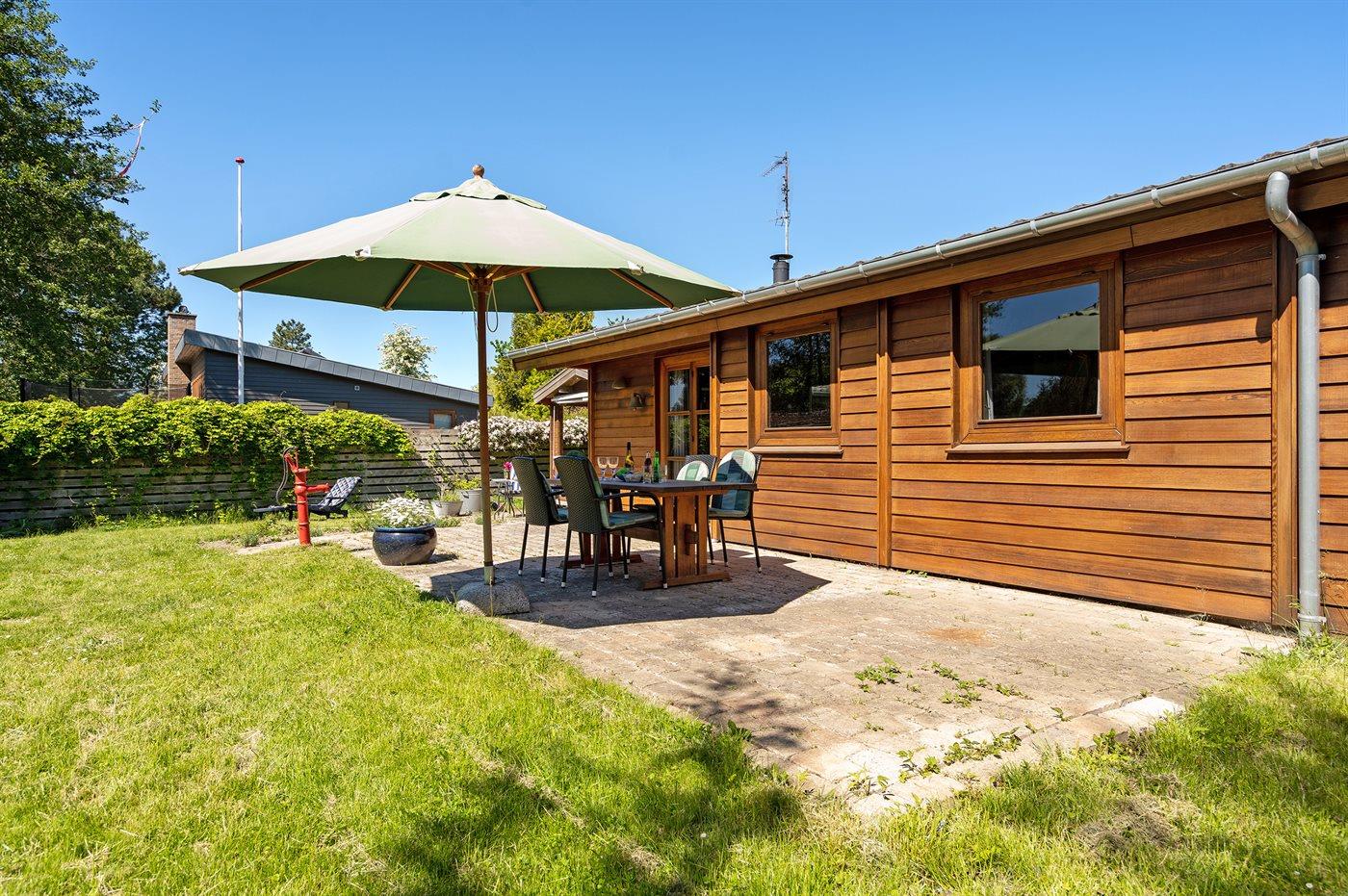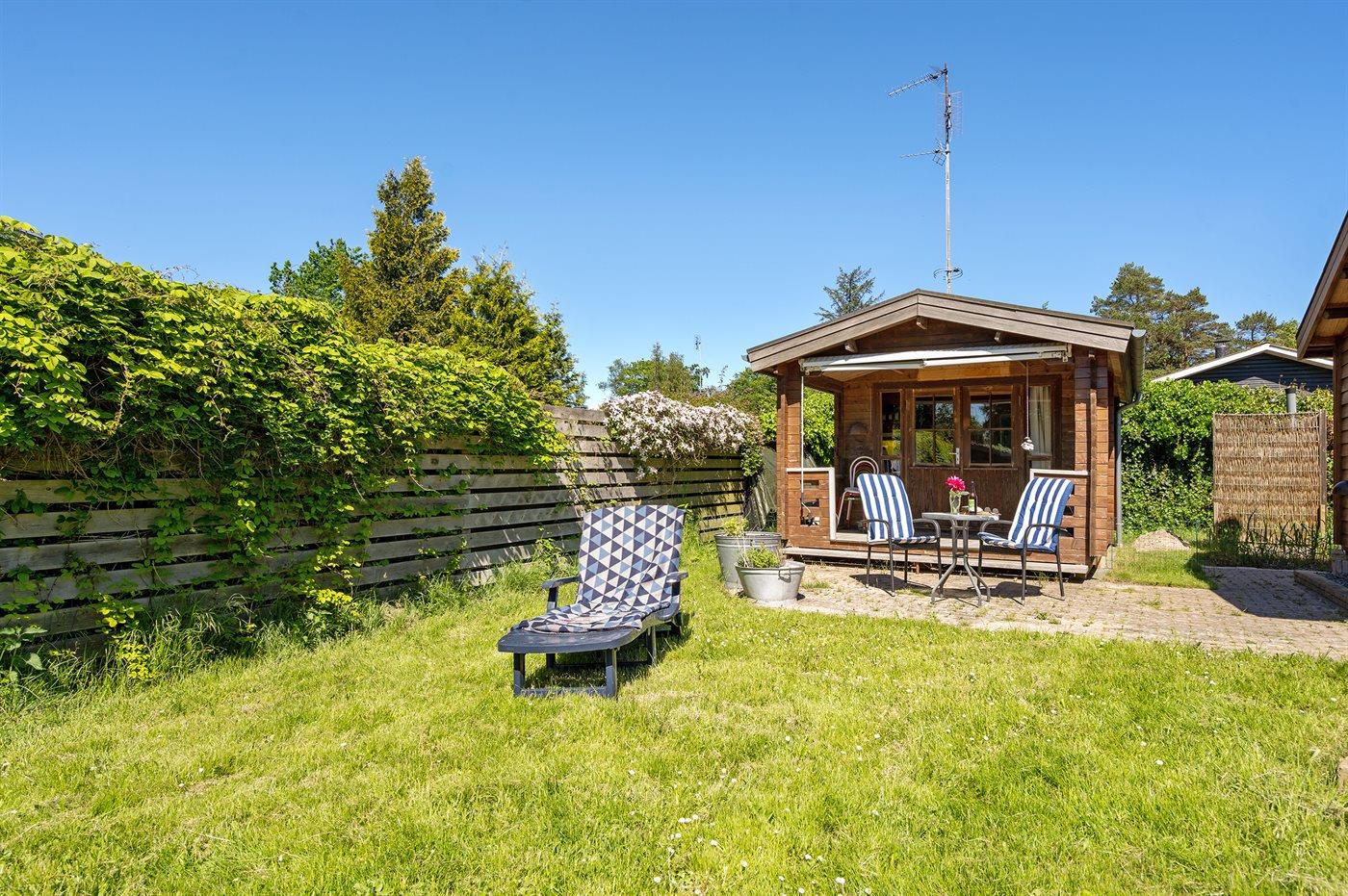 Ferieboligen er beliggende på en 714 m² stor havegrund. Grunden er indhegnet. Der er 100 m til havet. Nærmeste forretning er beliggende i en afstand af 1200 m. Der er en golfbane i en afstand af 3000 m. Til ferieboligen hører 30 m² terrasseareal. Desuden er der 6 m² overdækket terrasse. Gynge. Legetårn. Udendørs bruser. Grill til rådighed. Der er installeret stik til opladning af elbil. Parkering ved ferieboligen.