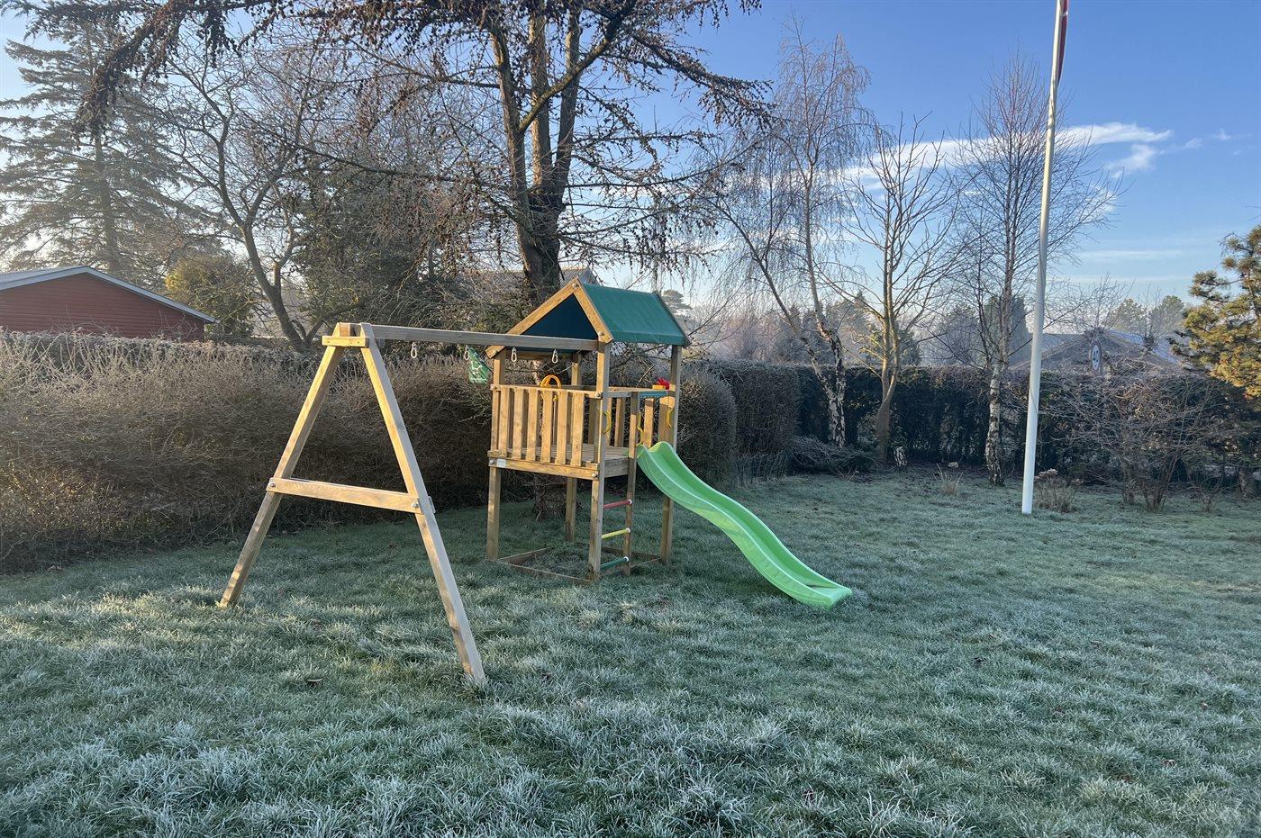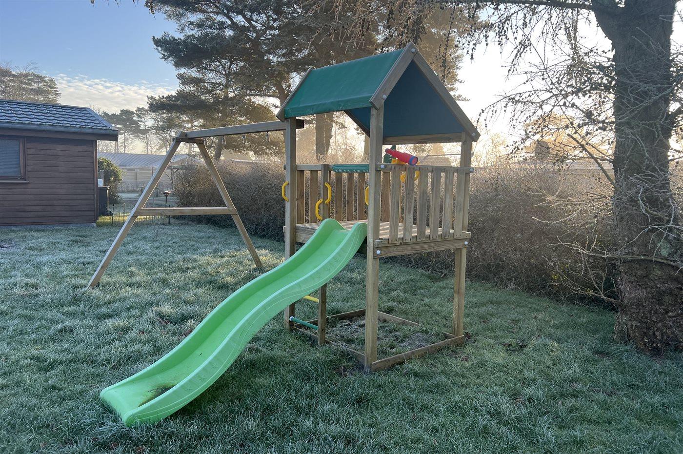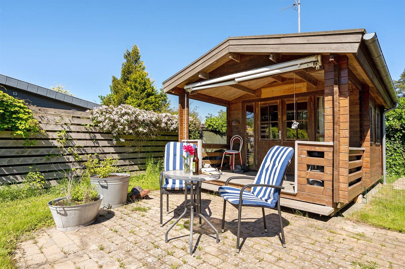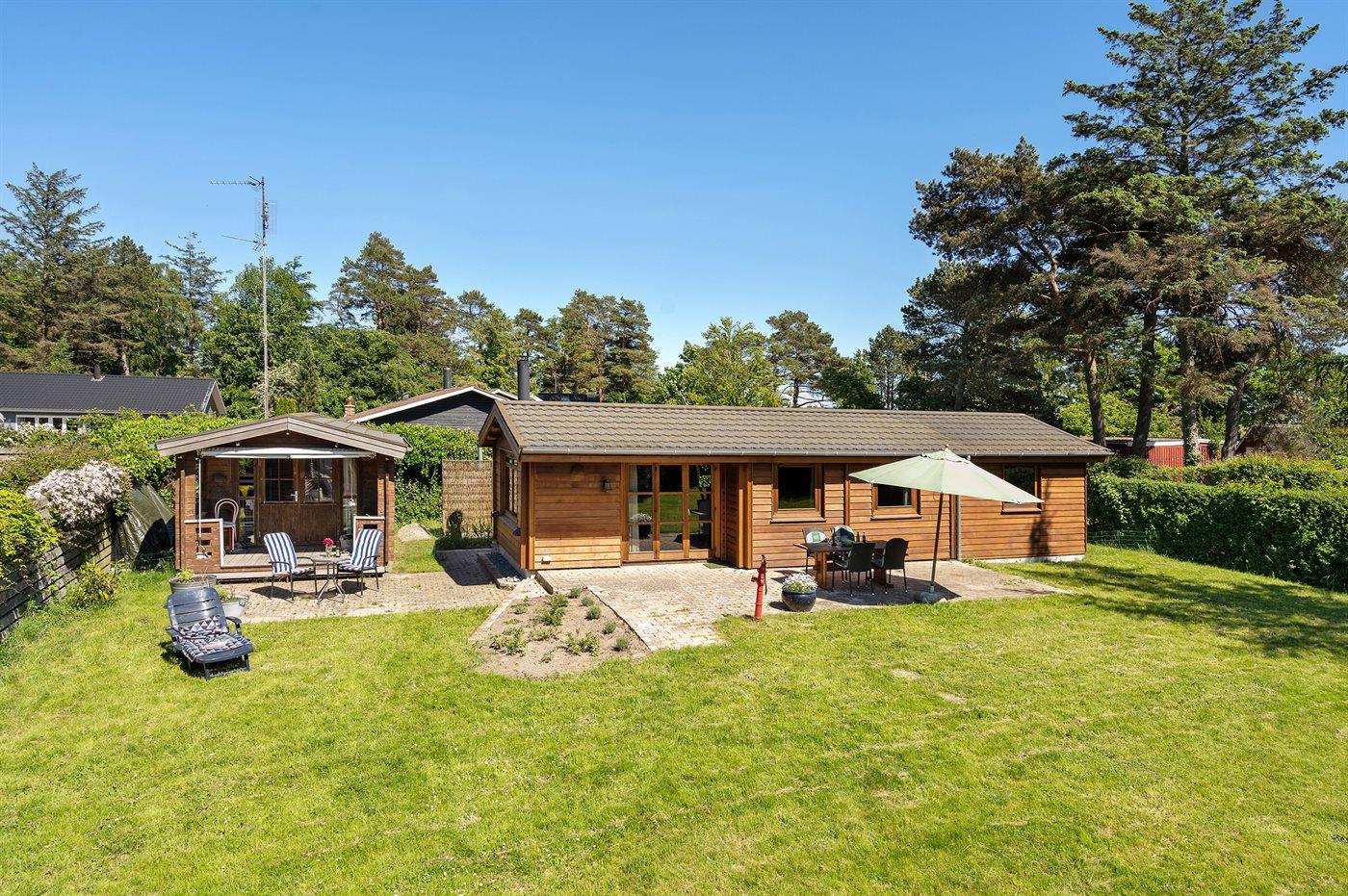 Ferieboligen er beliggende på en 714 m² stor havegrund. Grunden er indhegnet. Der er 100 m til havet. Nærmeste forretning er beliggende i en afstand af 1200 m. Der er en golfbane i en afstand af 3000 m. Til ferieboligen hører 30 m² terrasseareal. Desuden er der 6 m² overdækket terrasse. Gynge. Legetårn. Udendørs bruser. Grill til rådighed. Der er installeret stik til opladning af elbil. Parkering ved ferieboligen.