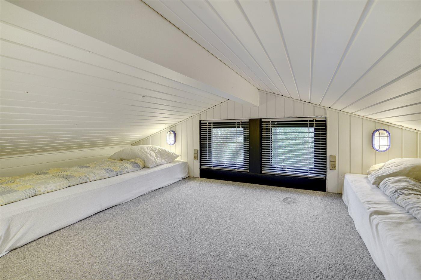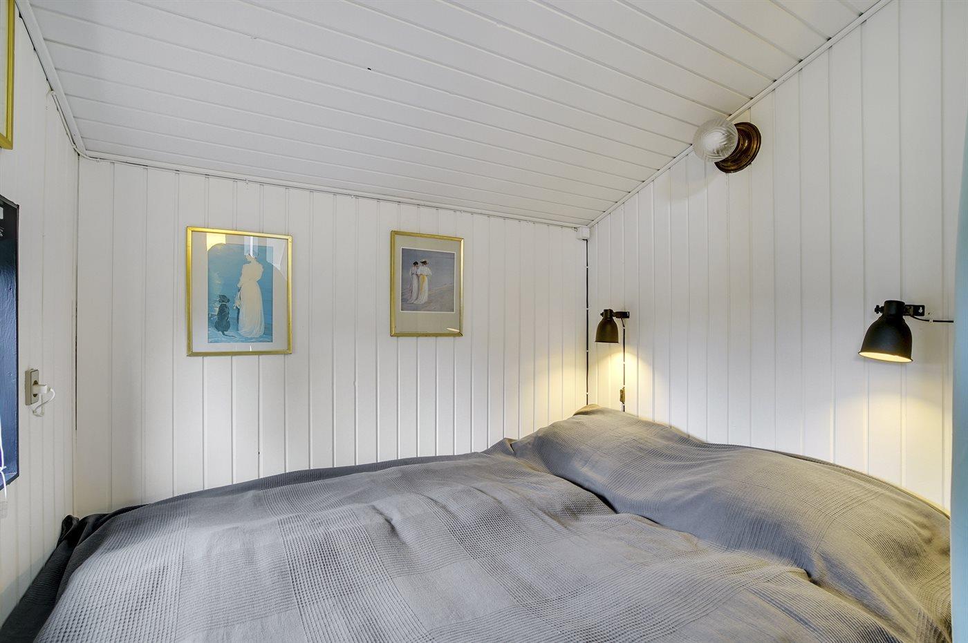 Der er i alt 2 soveværelser. Sovepladserne fordeler sig på: 2 sovepladser i dobbeltseng. 2 sovepladser i enkeltsenge. 2 sovepladser på madrasser. 2 sovepladser i alkove. 2 af disse sovepladser befinder sig i opholdsstuen og 2 af dem befinder sig på hemsen. Derudover er der 1 stk. barneseng.