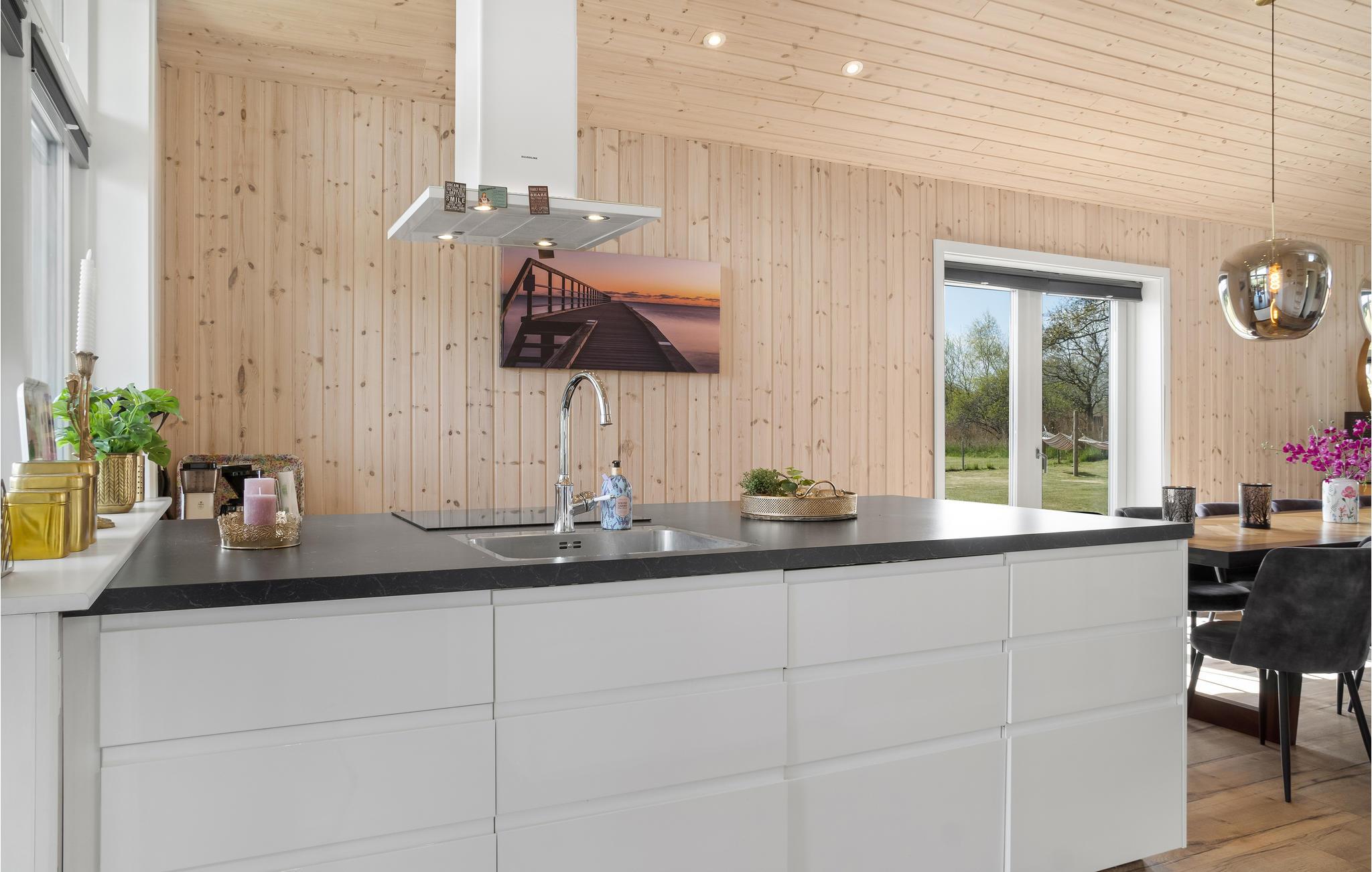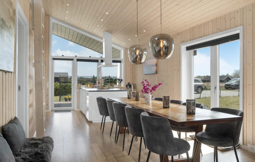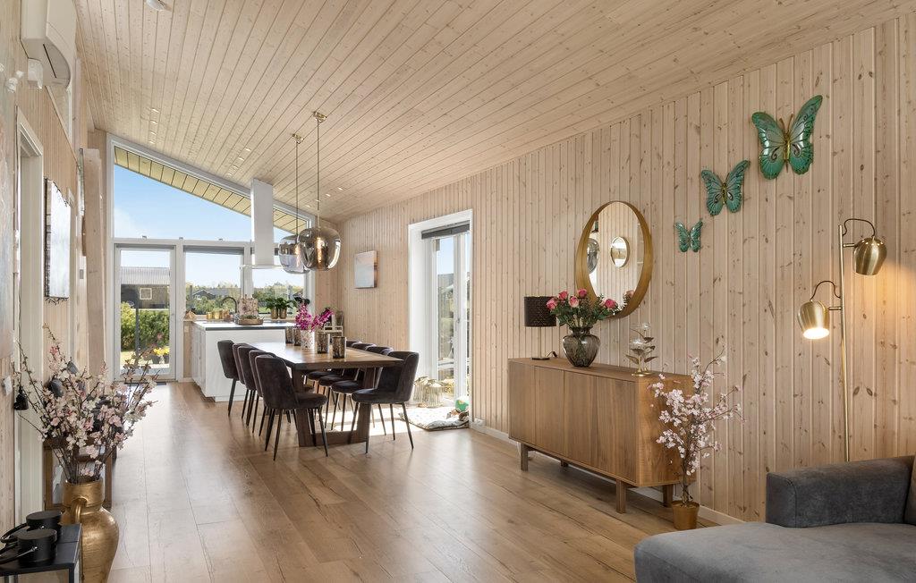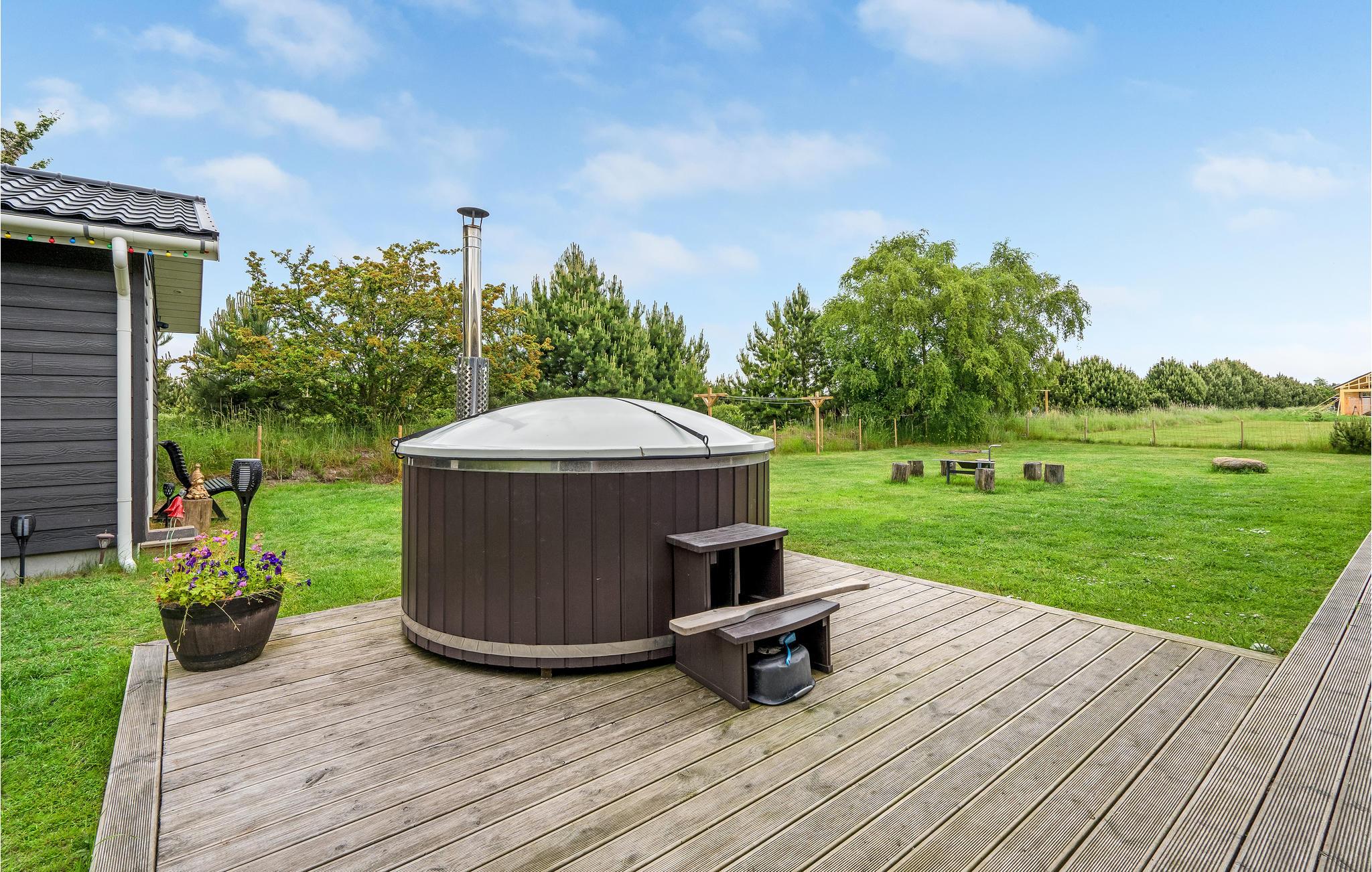 Husets ejer har lavet en masse aktivitetsmuligheder både inde og ude, så I kommer ikke til at kede jer. Feriehuset er indrettet med fire soveværelser og to badeværelser, og er dermed yderst velegnet til to familier. Spabadet står i det ene af badeværelserne. Den store, lyse stue med komfortable møbler ligger i forbindelse med det veludstyrede køkken. Fra stuen er der udgang til den store, afskærmede træterrasse, hvor I kan nyde solen og tilberede aftensmaden på grillen, inden I hopper i vildmarksbadet, måske med et glas champagne og udsigt til stjernehimlen.