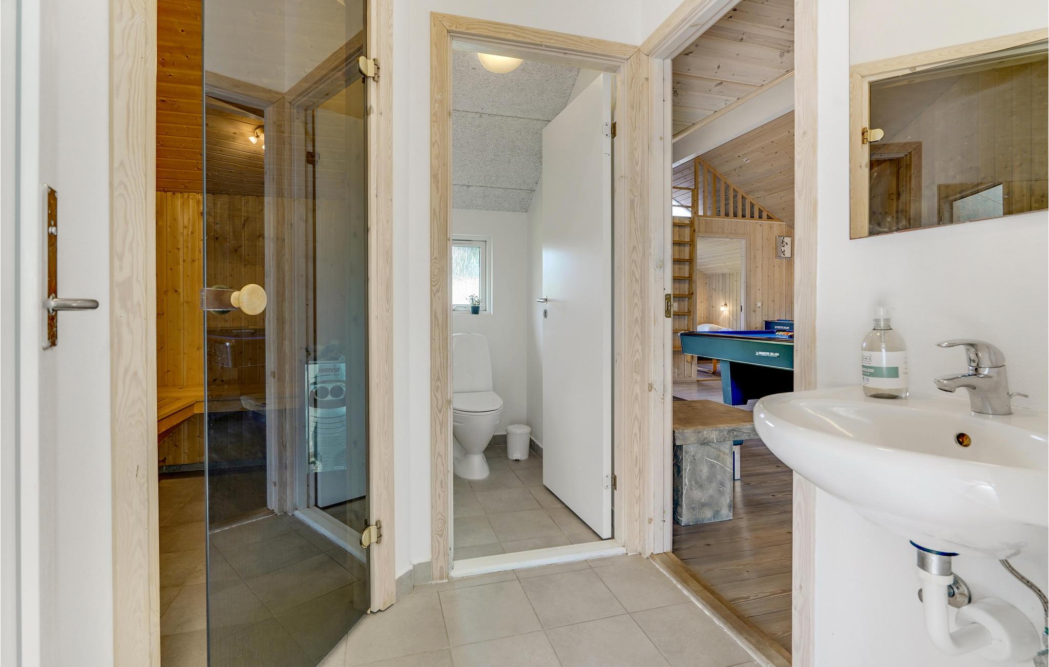 Her er gjort alt for, at ferien skal blive en succes - uanset om I foretrækker fred og ro eller en aktiv ferie. Nyd en tur i swimmingpoolen, boblebadet eller den varme sauna. I aktivitetsrummet kan I hygge jer med et spil billard, bordtennis eller dart. Brændeovnen spreder dejlig varme i det velindrettede køkken/alrum. Udendørs på den store grund er der god plads til børnenes boldspil og leg, mens I slapper af på den dejlige terrasse. Et unikt feriehus, velegnet til 2-3 familier, der uden tvivl vil vække begejstring, uanset årstiden.