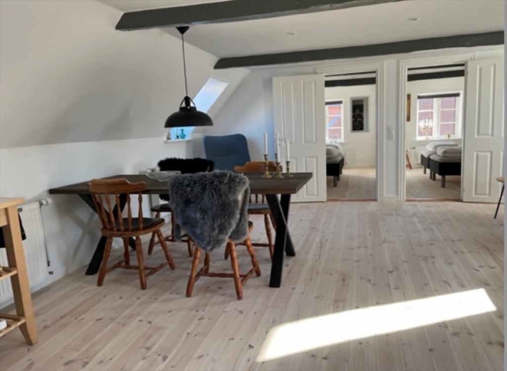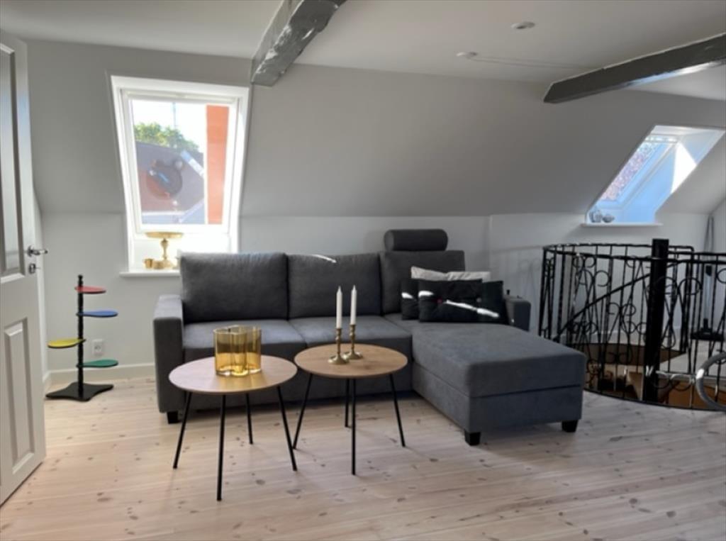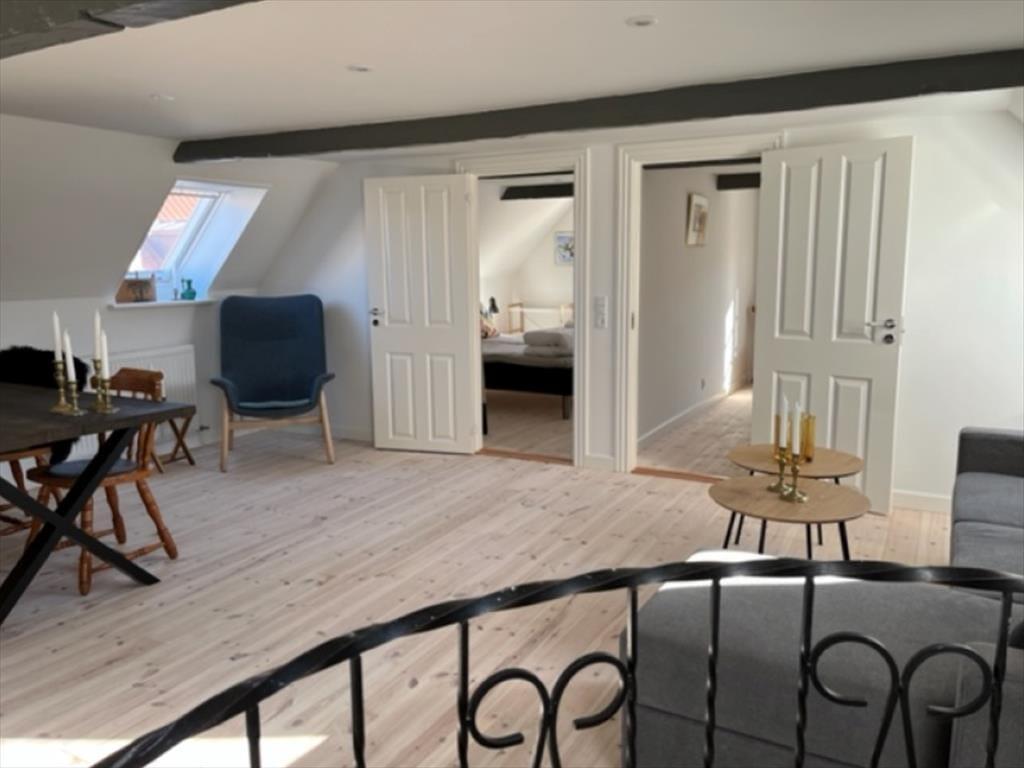 Ud over den indbydende indendørsplads har du også adgang til en hyggelig og lukket gårdhave, hvor du kan nyde solens stråler eller tage en stille stund. Lejligheden har sin egen indgang fra Ny Møllegade og ligger på 1. sal, hvilket gør den ideel for dem, der ønsker en ferie med både komfort og byens puls lige udenfor døren.