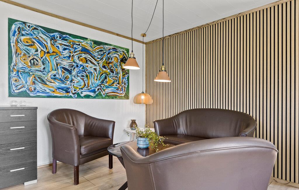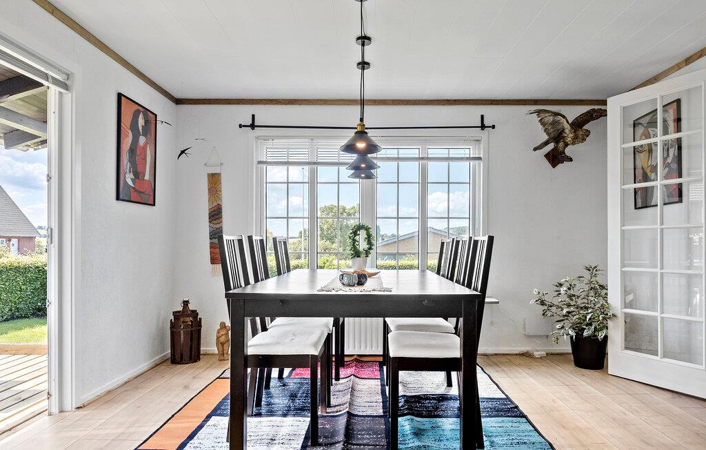Velkommen til et hyggeligt sommerhus ved Mjels Sø, som ligger i den nordlige ende af Als. Her får I en elegant bolig til feriedagene, hvor I kan komme ned i tempo og nyde en harmonisk ramme om samværet både ude og inde. Læn jer tilbage i stuens bløde møbler og glæd jer over moderne kvalitetsløsninger, velvalgt udsmykning på væggene og en fredfyldt udsigt til søen gennem de brede vinduer. Spisebordet bliver centrum for en masse hyggestunder med gode måltider og brætspil.