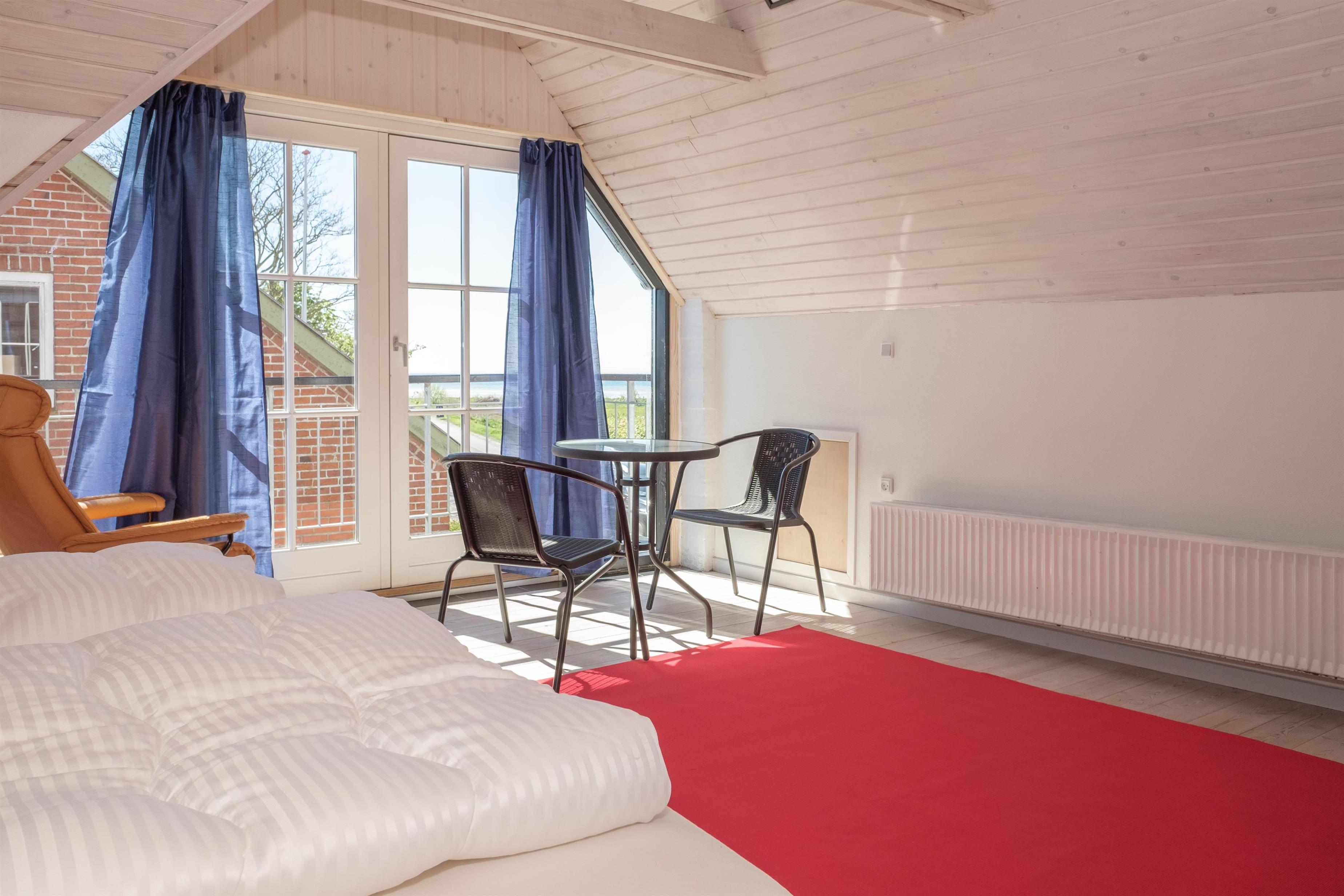 På 1. salen findes der 4 værelser: 3 med enkeltsenge og 1 med dobbeltseng, hvorfra der er udgang til balkon med udsigt ud over Kalø Vig. Endvidere fællesrum, stort badeværelse samt walk-in closet.