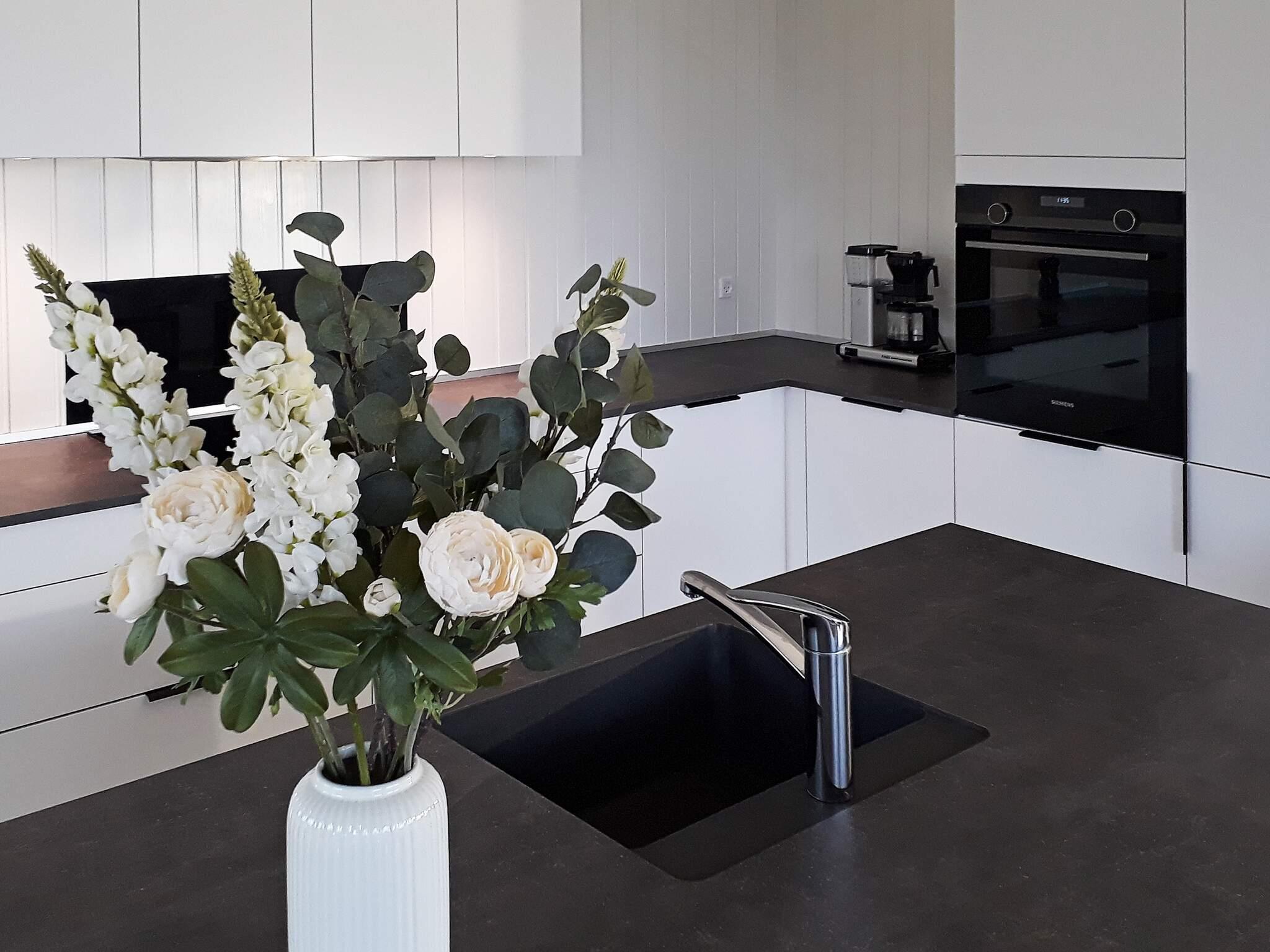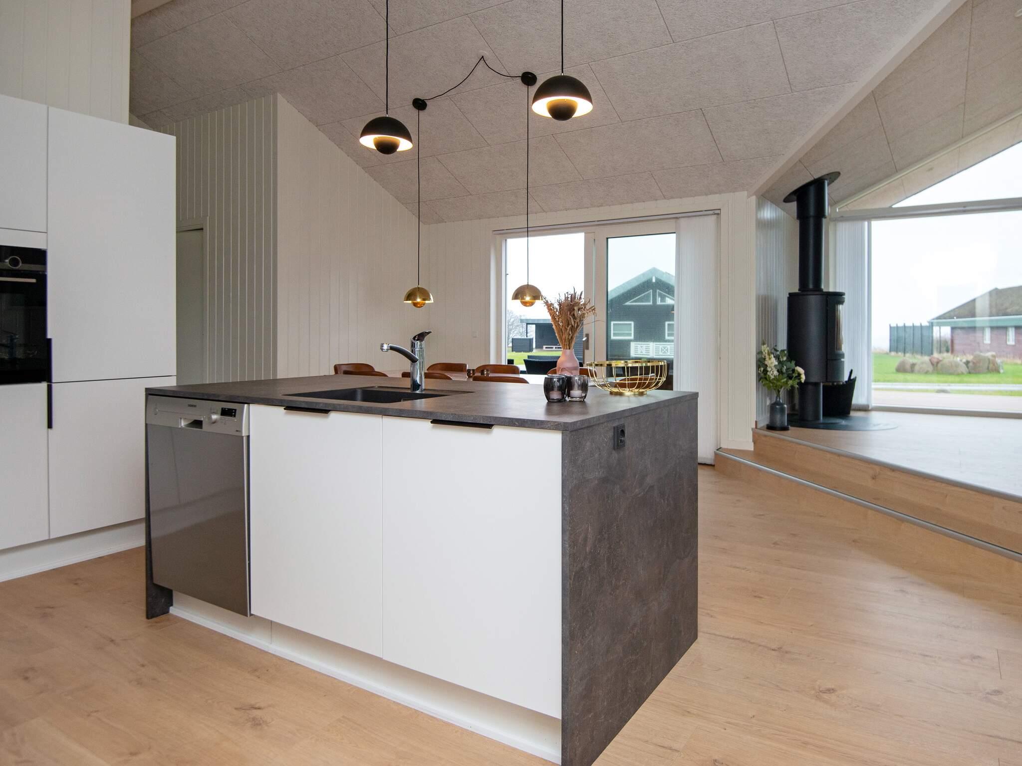 Det flotte, arkitekttegnede sommerhus er indrettet med loft til kip. Mod vandet er der store vinduespartier, som gør huset meget lyst. Fra det store køkken/alrum og opholdsstuen har I panoramaudsigt til vandet, som kan nydes både under madlavningen eller afslappende stunder på sofaen. I køkkenøen er der installeret et særskilt vinkøleskab ligesom møblering og hyggen i huset er noget helt særligt.