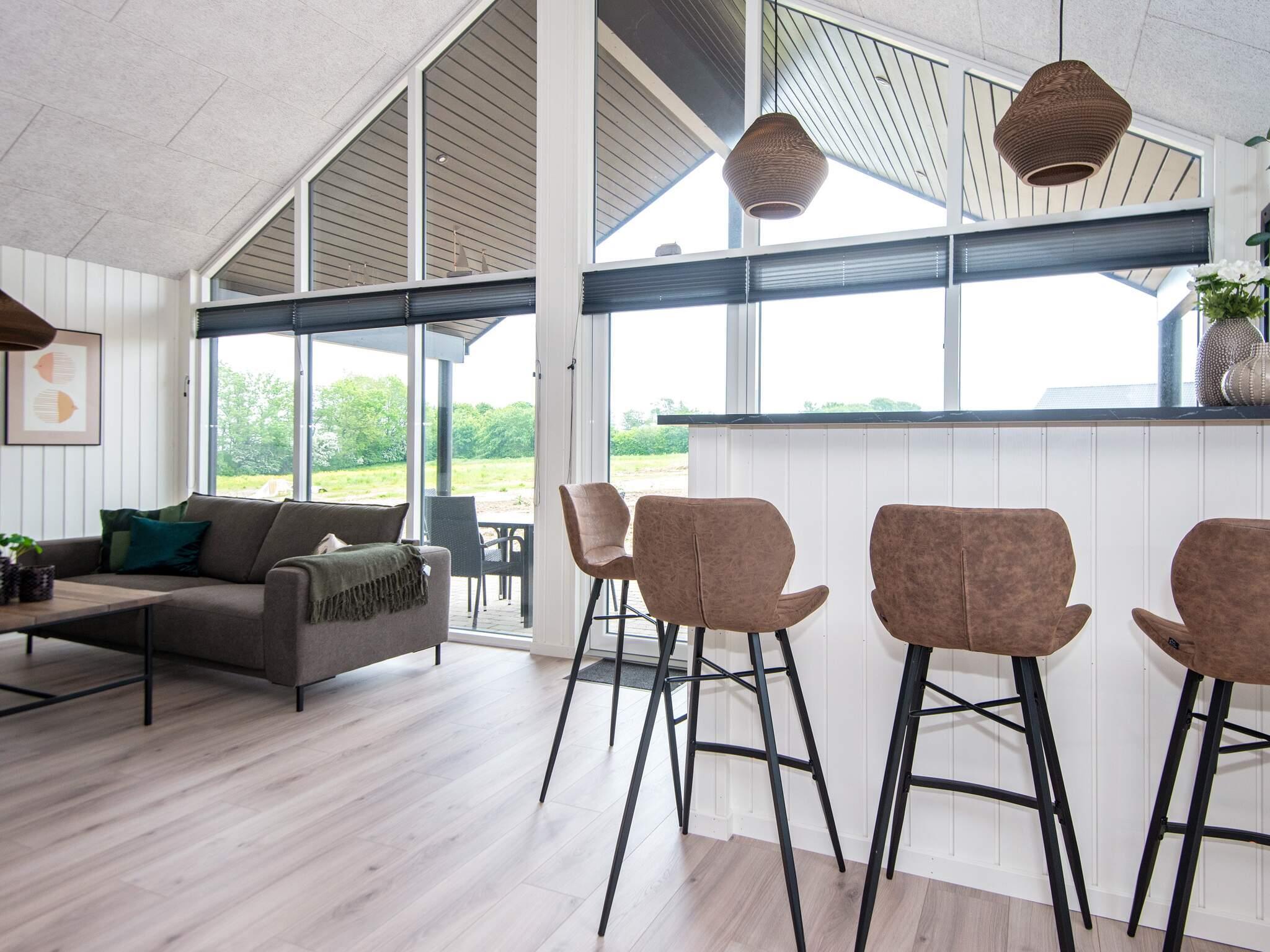 Det store opholdsrum, med udgang til terrassen, er husets naturlige samlingspunkt med sofagruppe, spisepladser og køkken. Køkkenet er praktisk indrettet med køkken-ø og dobbelt opvaskemaskine, vask, ovn, køleskab og kogeplader, så det er nemt at kokkere til alle feriens måltider.