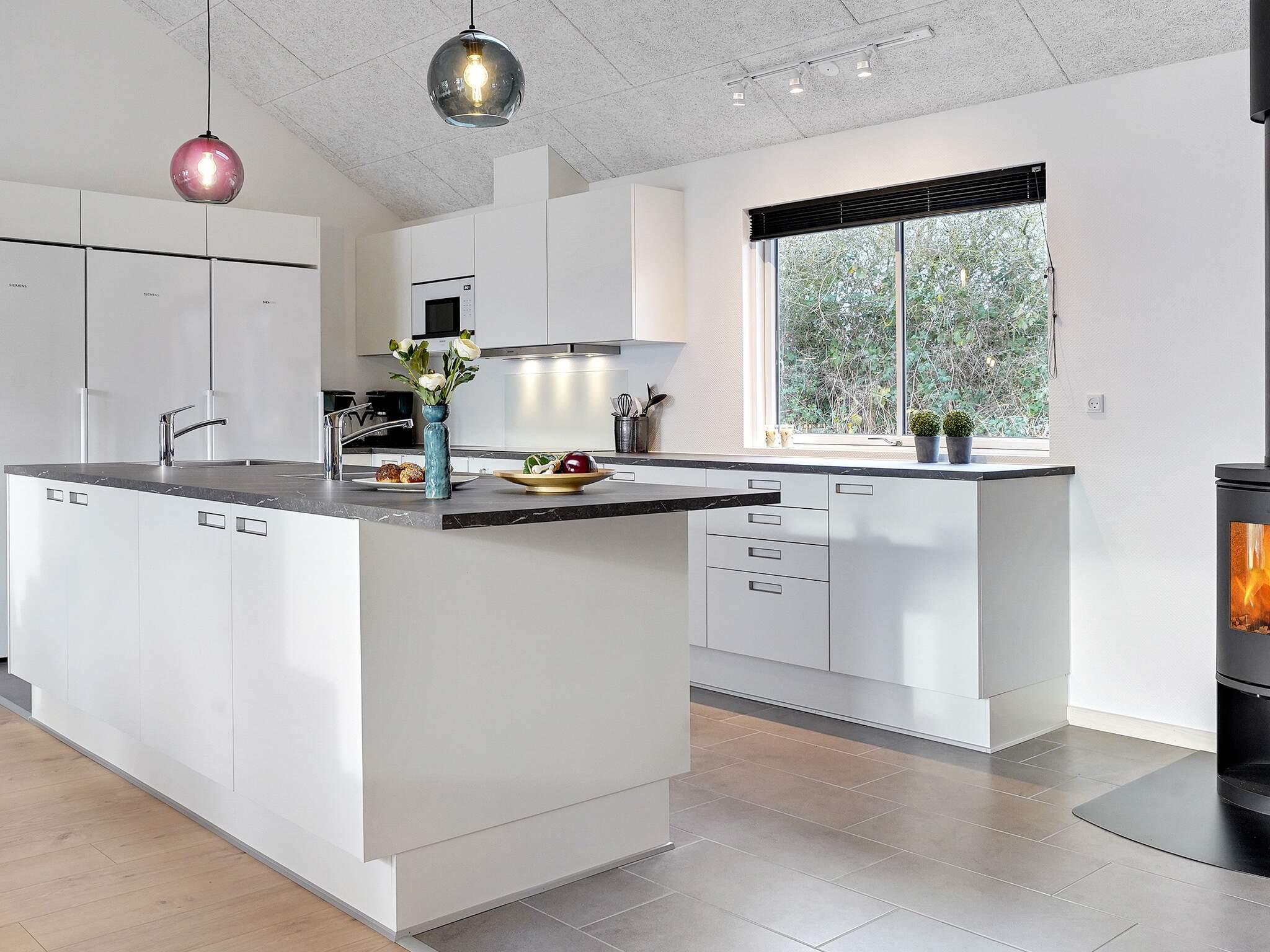 Feriehuset har en hyggelig stue med spisebord og sofahjørne. Du kan nyde varmen fra brændeovnen med en god film eller bog. Det stilrene køkken er veludstyret og ligger i forlængelse af stuen. Her finder du det ekstra rummelige køkken med ekstra kogeplade, køleskab, ovn, samt plads til større måltider.