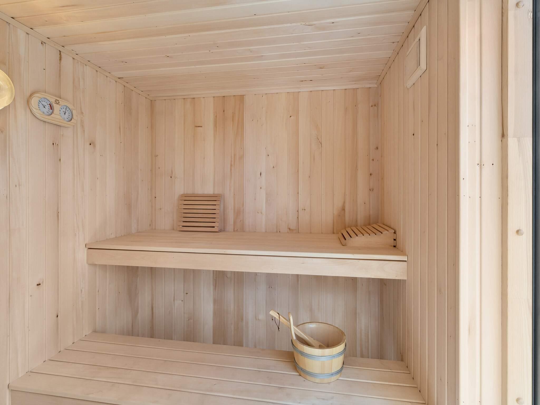 Huset har eget poolområde, hvor man kan bade og lege i timevis, med plads til både store og små børn. Udenfor finder du et wellness-område med en lille overdækket træterrasse, sauna, udendørs spa og udendørs bruser, hvor du kan slappe af under åben himmel.