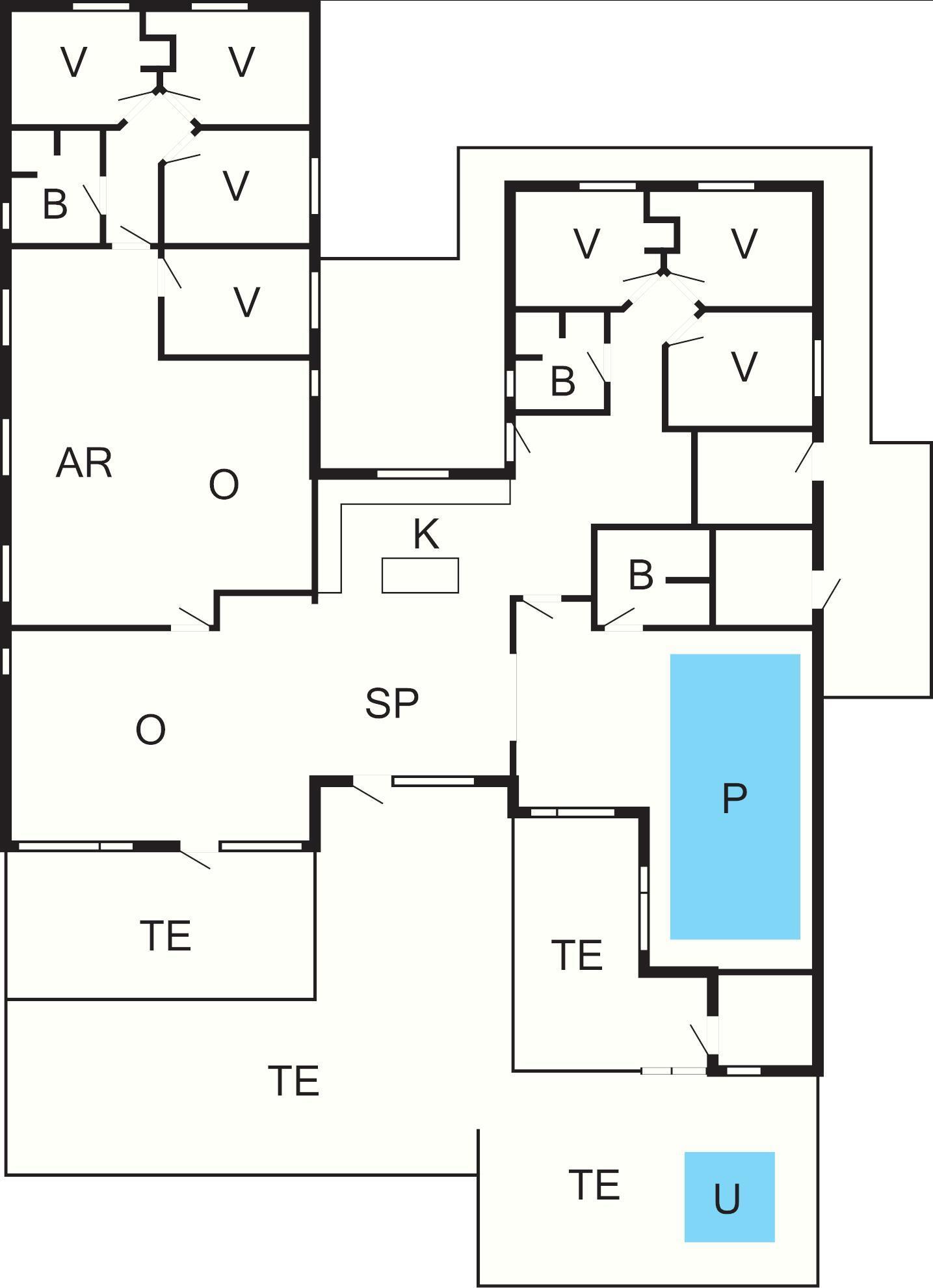 7 Soveværelser: (1DS)+(1DS)+(2S)+(2S)+(2S)+(2S)+(2S), barneseng