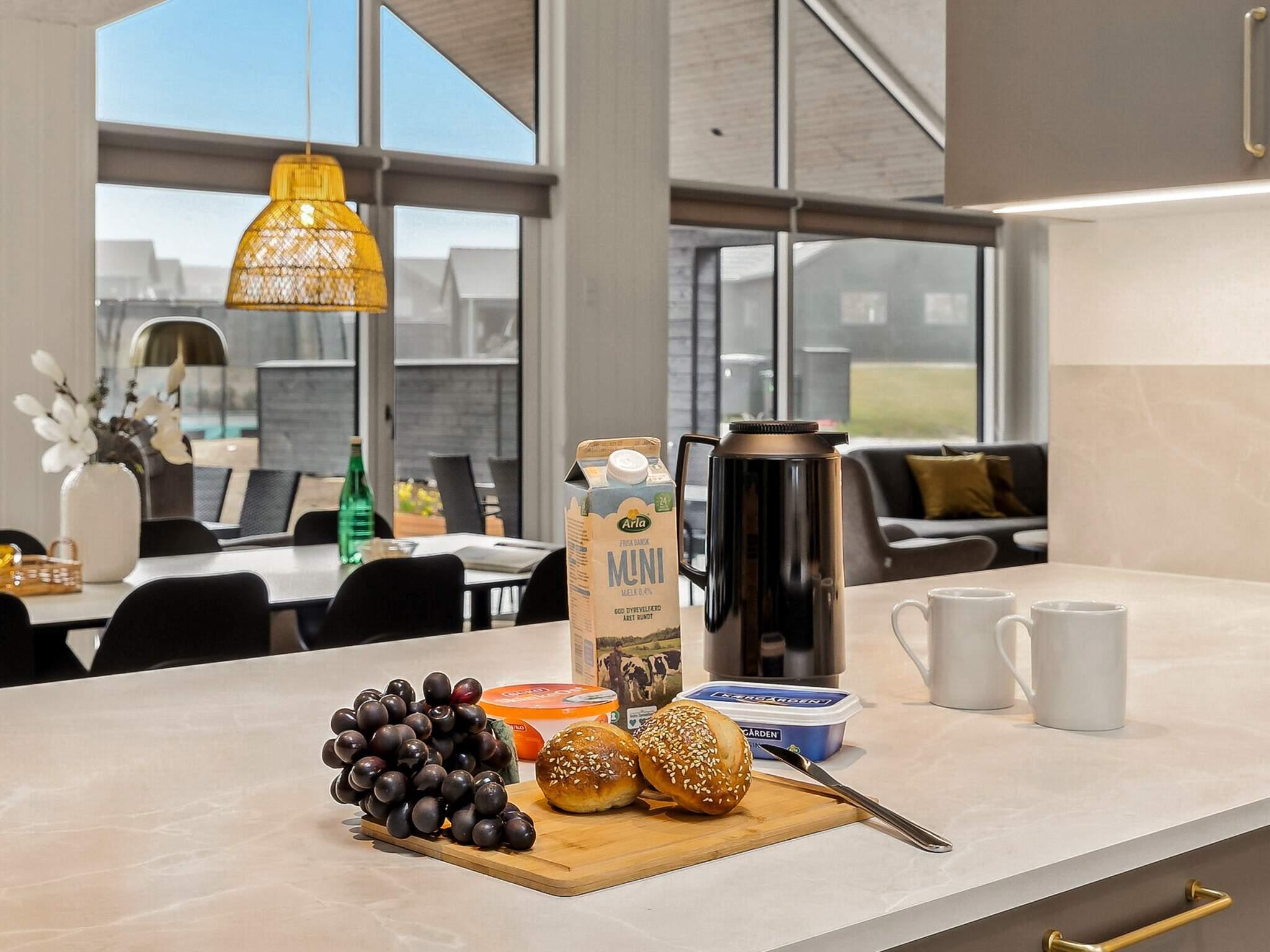 Køkken-alrummet er udstyret med moderne faciliteter, der gør madlavningen nem og behagelig. Det lange spisebord har plads til alle, så I kan nyde jeres måltider sammen. Den tilstødende stue er lys og rummelig med store vinduespartier, komfortable sofaer, og en brændeovn, der skaber en hyggelig atmosfære.
