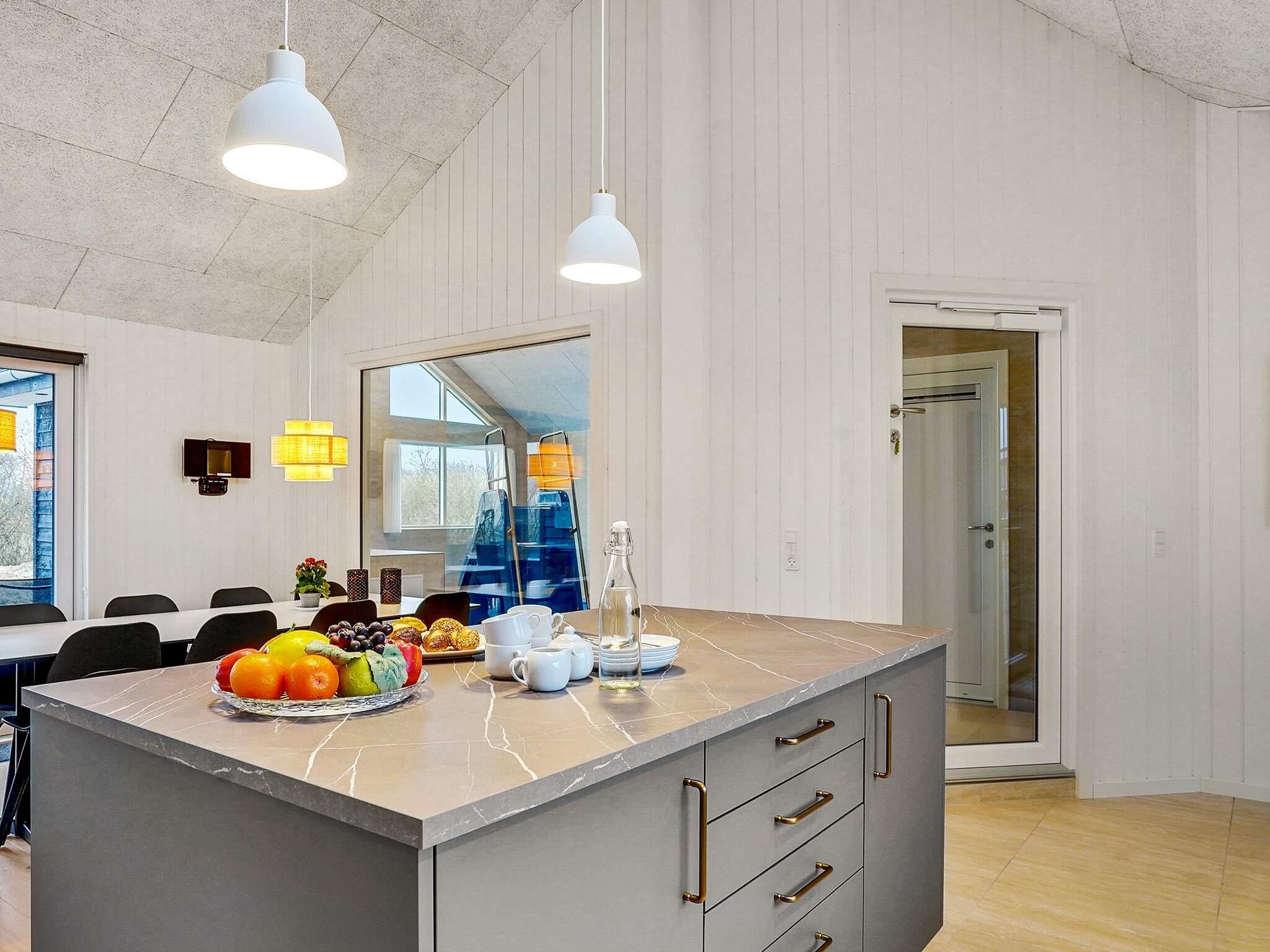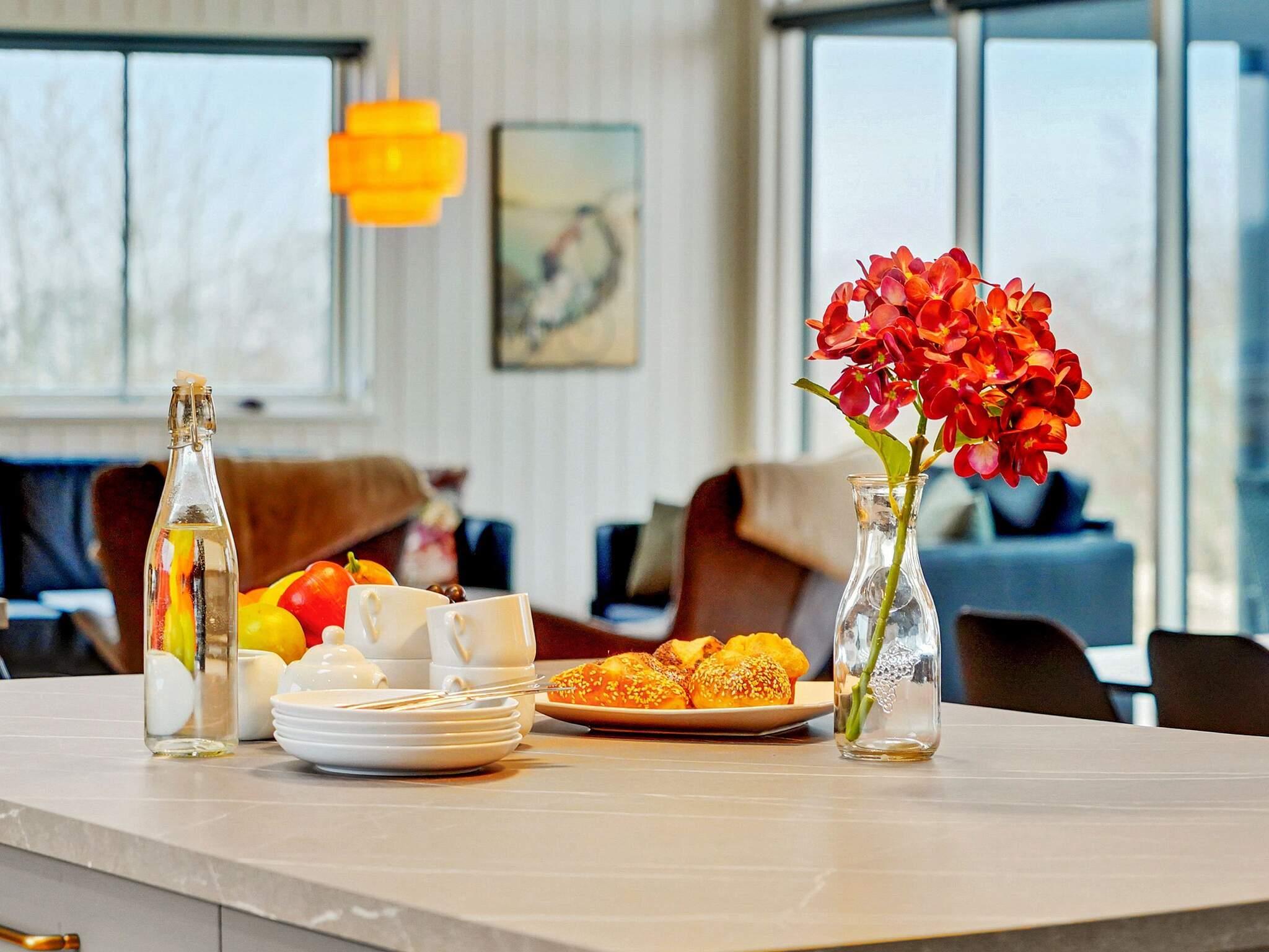 Centralt beliggende i huset ligger det store køkken/alrum. Fra det lange spisebord kan du holde øje med dem, der svømmer i poolen eller måltidet, der er ved at blive tilberedt. Køkkenet er veludstyret, og med både dobbeltkomfur, to ovne, en vask og to opvaskemaskiner bliver madlavningen til mange mennesker både sjov og overskuelig. Fra det hyggelige sofahjørne nær sommerhusets brændeovn er der udsigt til terrasse og græsplæne.