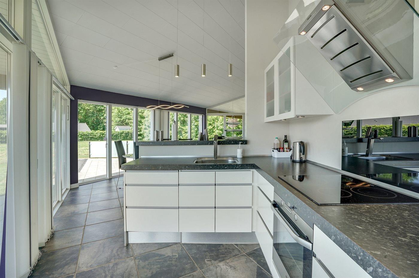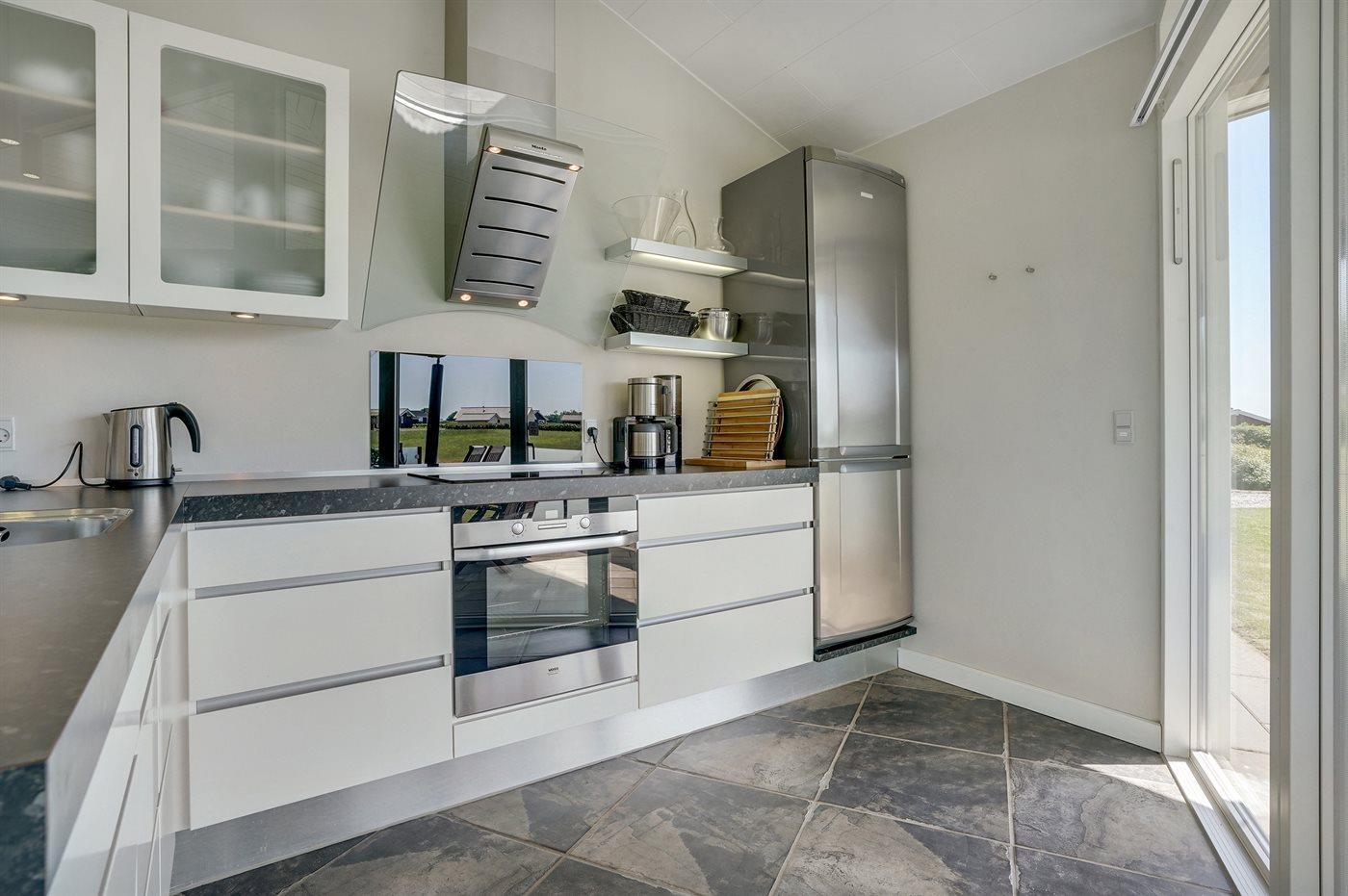 Køkkenet er udstyret med 1 køleskab. Der er 4 keramiske kogeplader, bageovn, mikrobølgeovn samt opvaskemaskine.