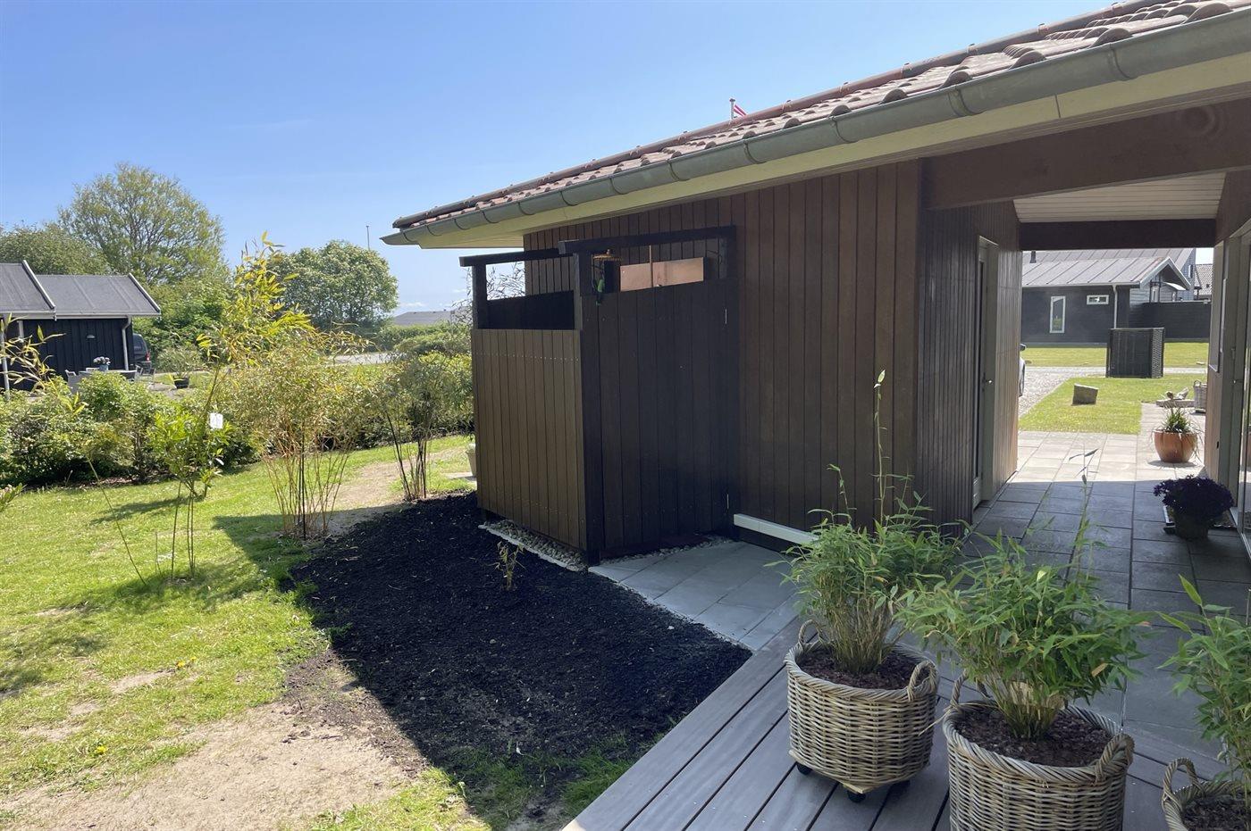 Ferieboligen er beliggende på en 1148 m² stor havegrund. Der er 250 m til havet. Nærmeste forretning er beliggende i en afstand af 4500 m. Til ferieboligen hører 40 m² terrasseareal. Desuden er der 15 m² overdækket terrasse. Parkering ved ferieboligen.