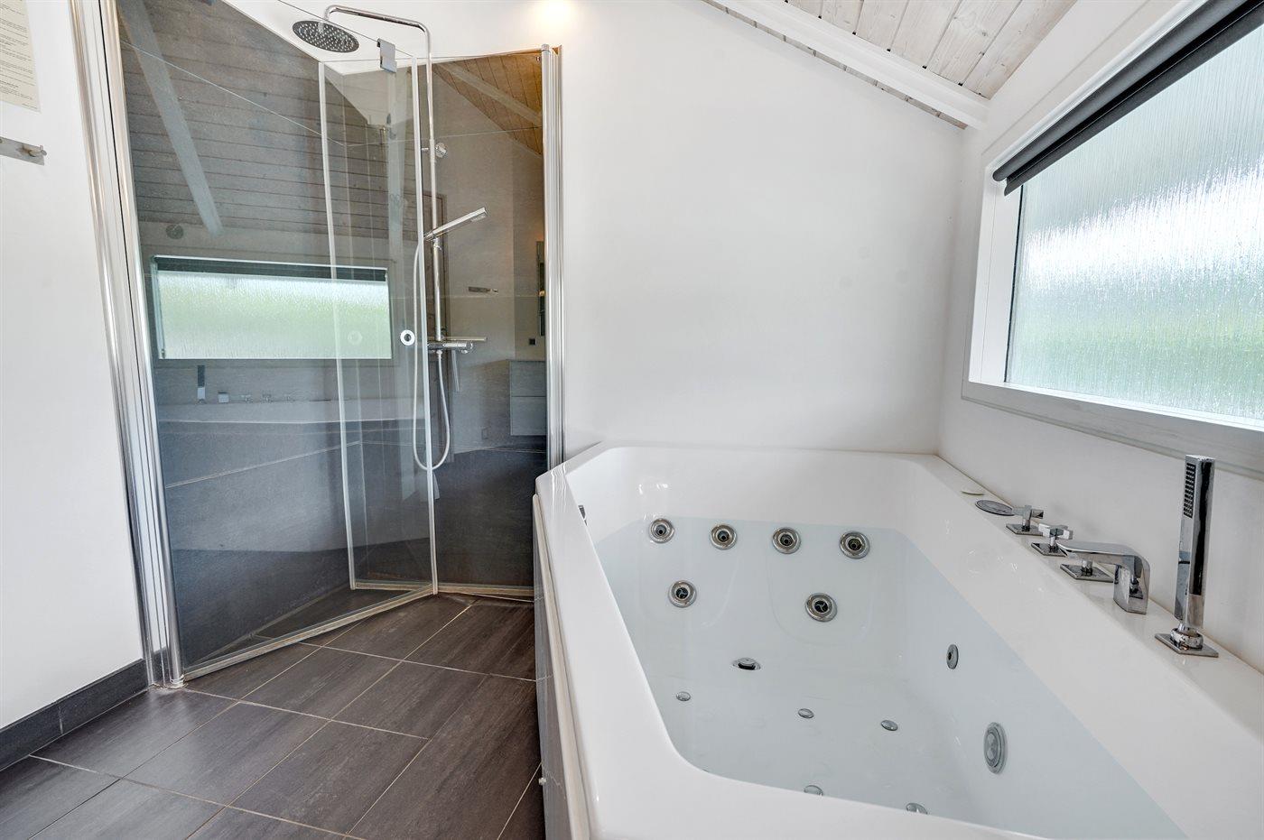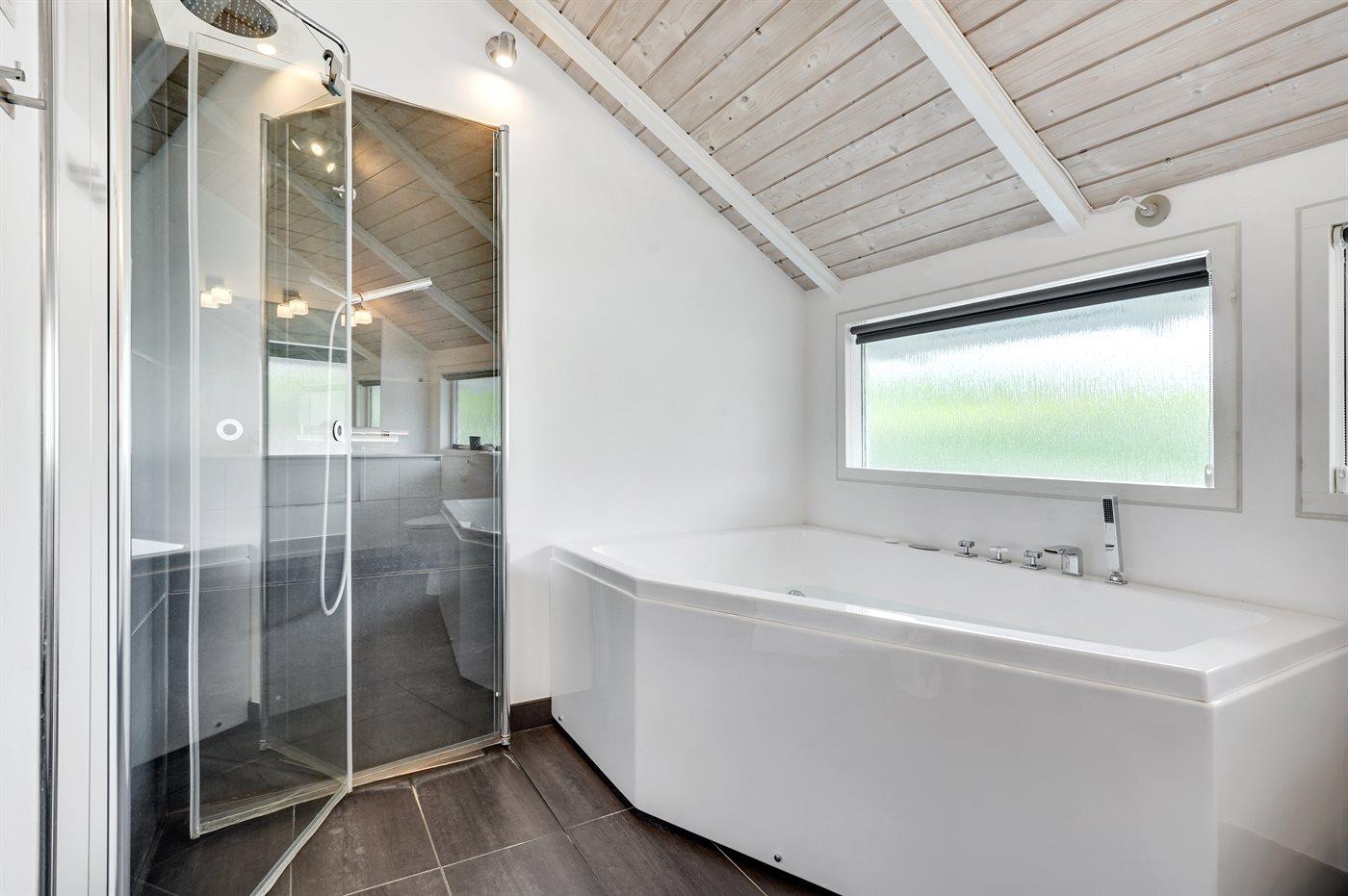 Der er 2 badeværelser med bruseniche og 2 toiletter I saunaen er der mulighed for afslapning.