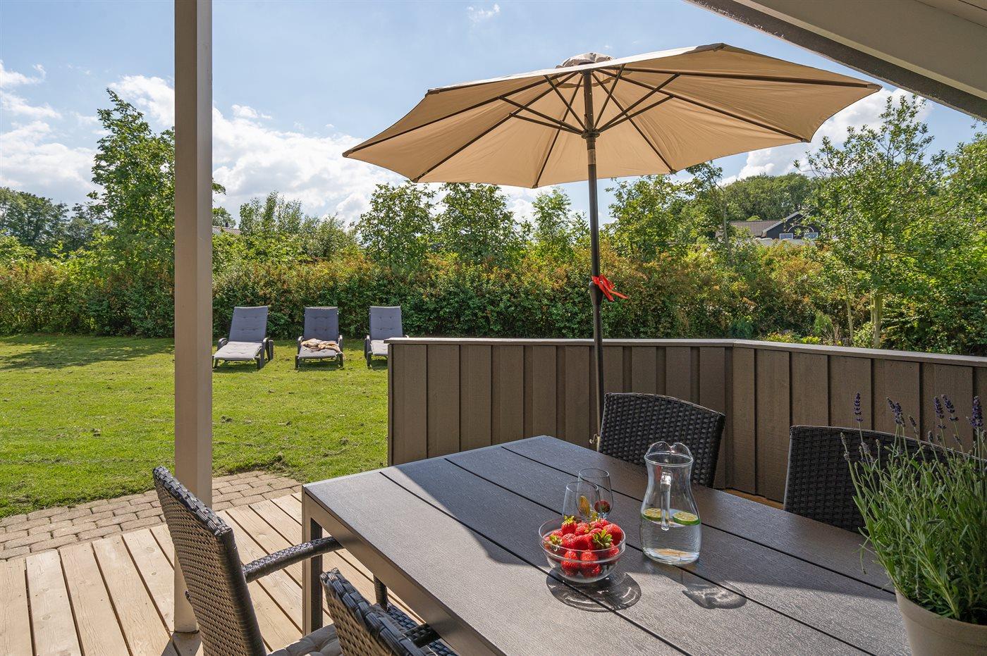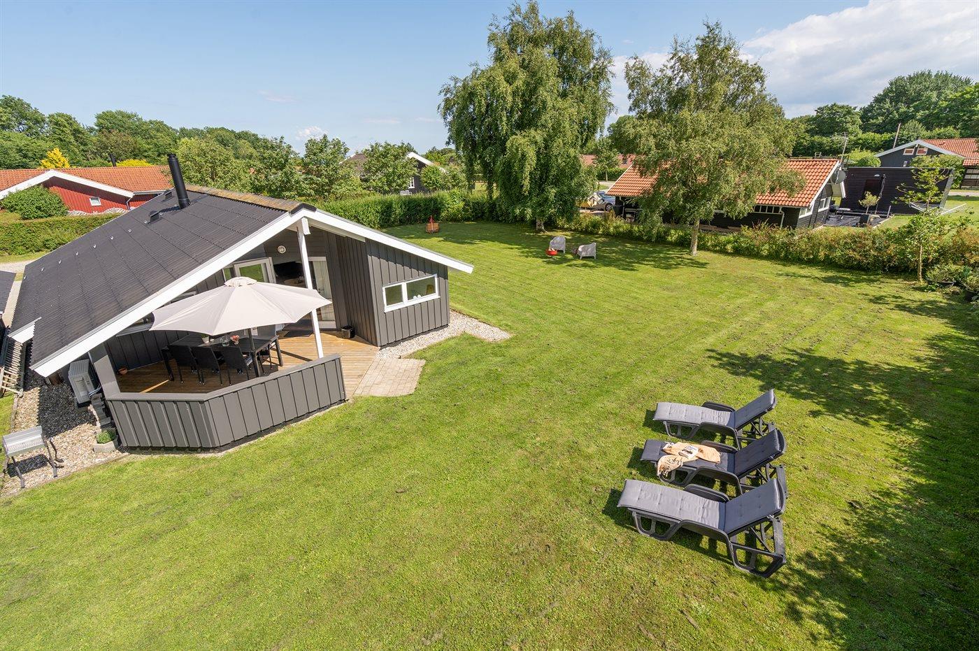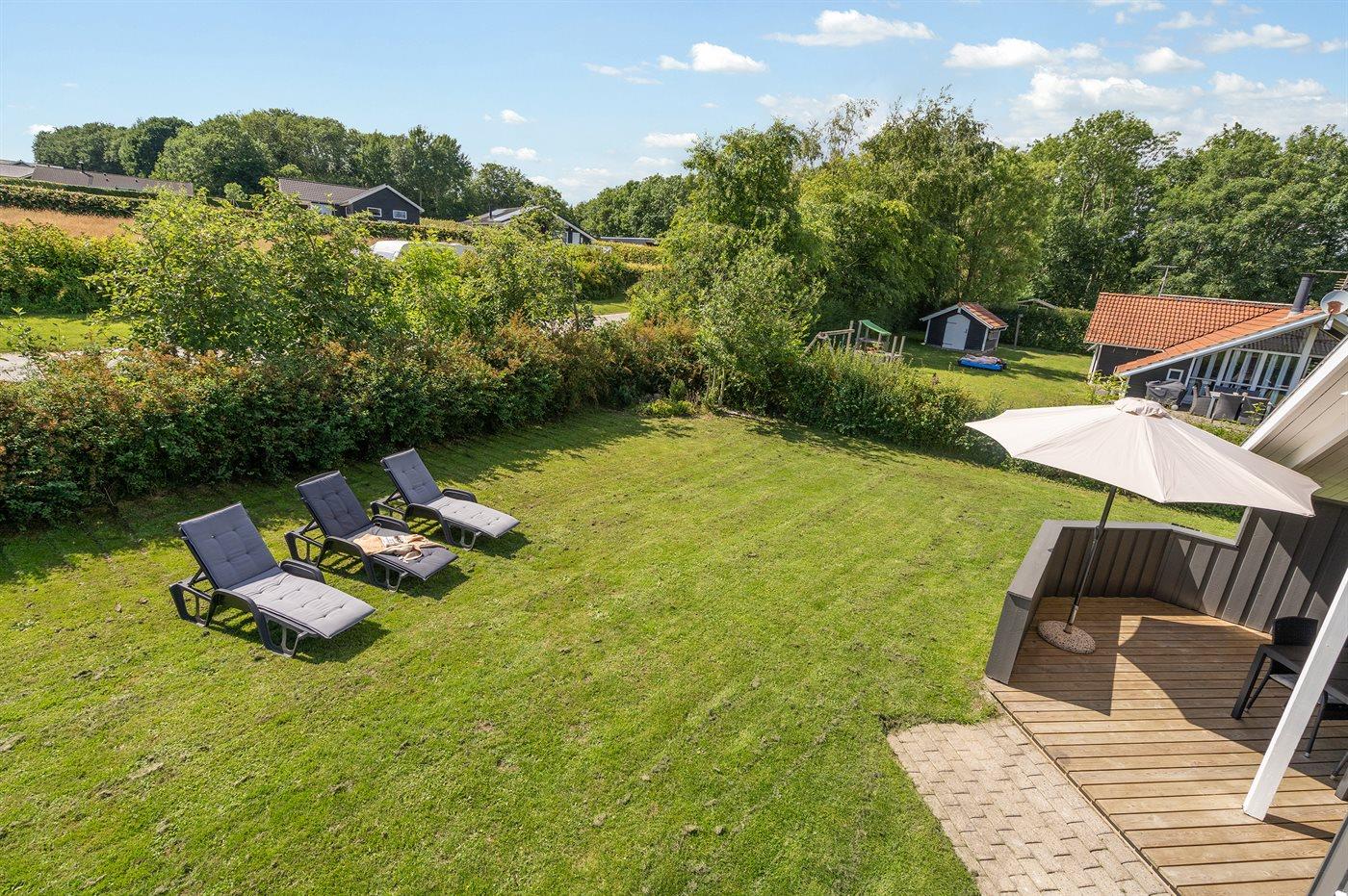 Ferieboligen er beliggende på en 860 m² stor havegrund. Der er 300 m til havet. Nærmeste forretning er beliggende i en afstand af 4000 m. Der er en golfbane i en afstand af 10000 m. Til ferieboligen hører 50 m² terrasseareal. Desuden er der 12 m² overdækket terrasse. Sandkasse. Der findes stigegolf. Grill til rådighed. Parkering ved ferieboligen.