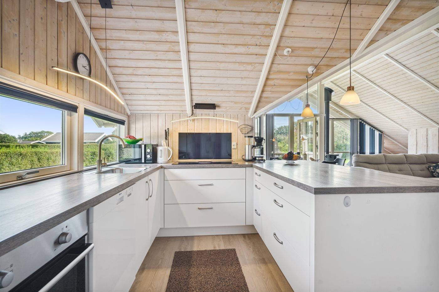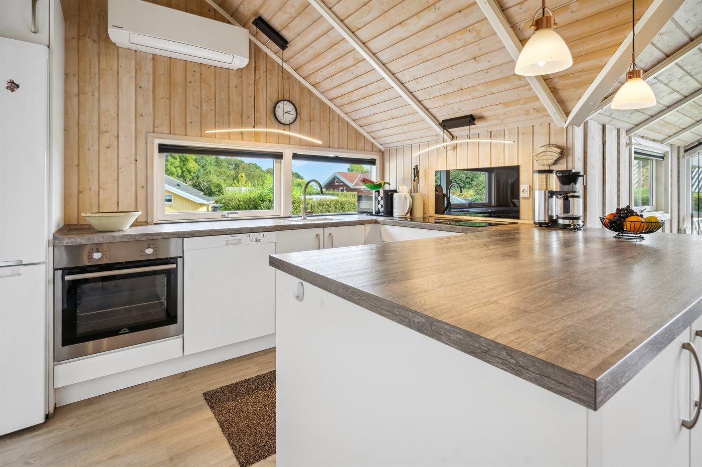 Køkkenet er udstyret med 1 køleskab. Der er 4 induktionskogeplader, varmluftovn, mikrobølgeovn samt opvaskemaskine.