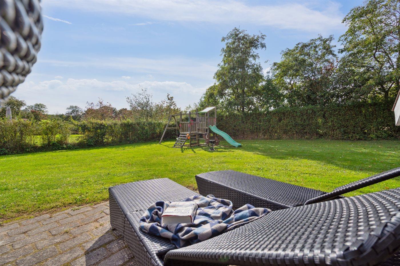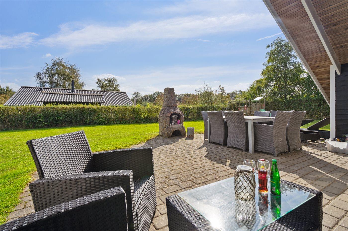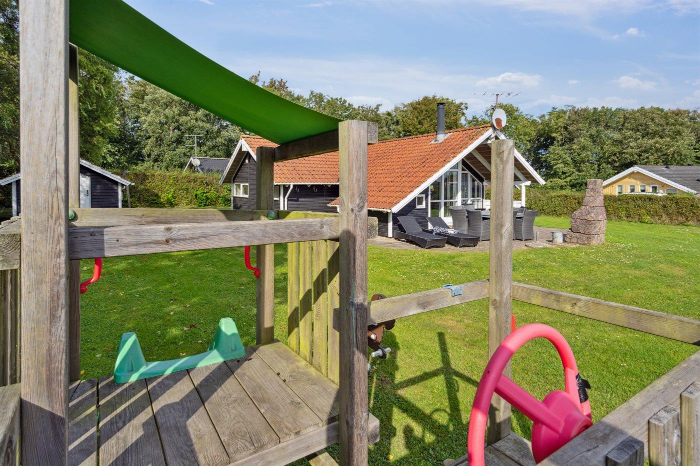 Ferieboligen er beliggende på en 850 m² stor havegrund. Der er 300 m til havet. Nærmeste forretning er beliggende i en afstand af 4000 m. Der er en golfbane i en afstand af 10000 m. Til ferieboligen hører åbent terrasseareal. Desuden er der overdækket terrasse. Der er redskabsrum. Gynge. Sandkasse. Legetårn. Rutchebane. Der ligger en legeplads i en afstand af 500 m. På lune aftener sørger en udendørs pejs for hyggelig stemning. Parkering ved ferieboligen.