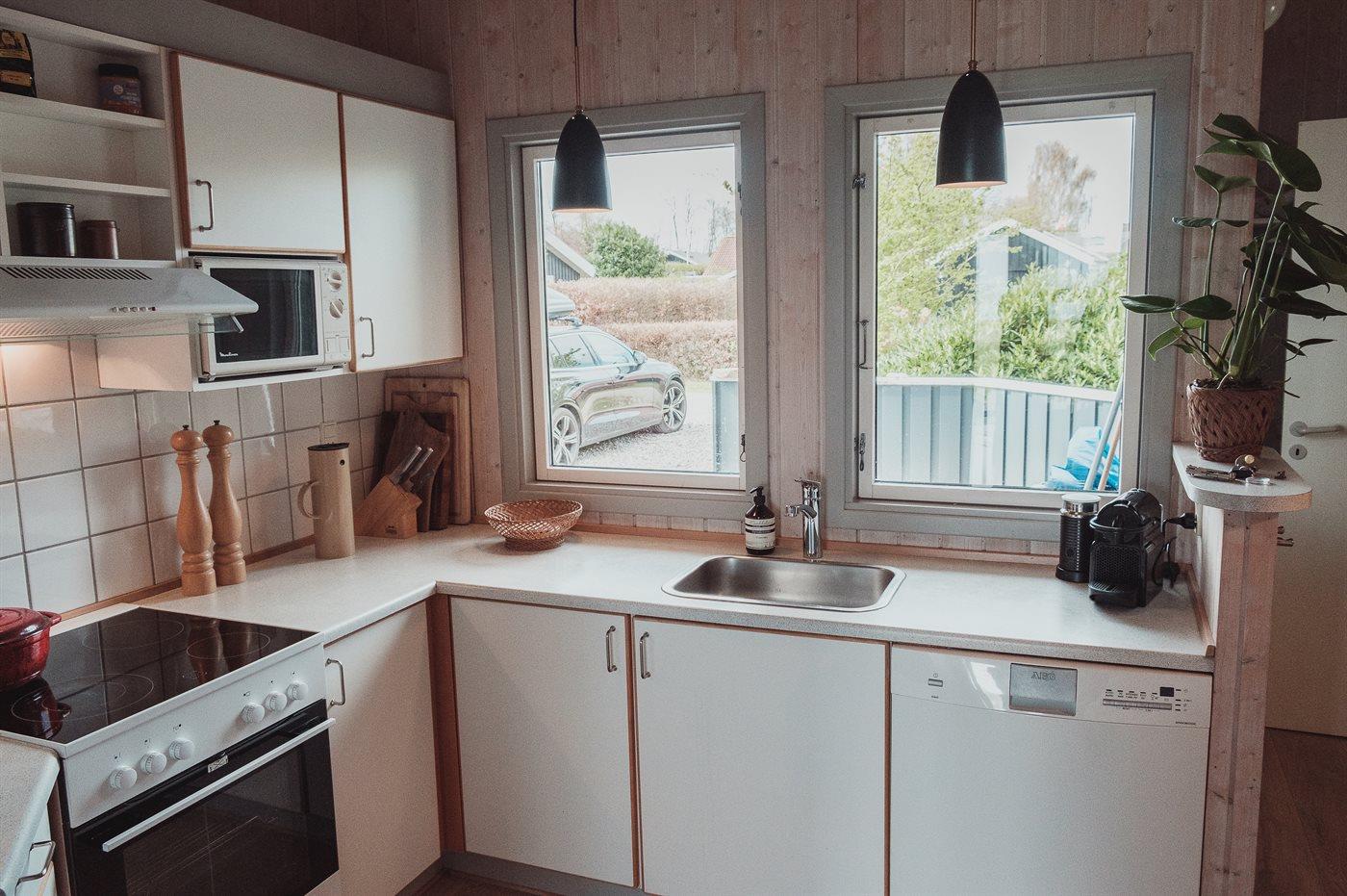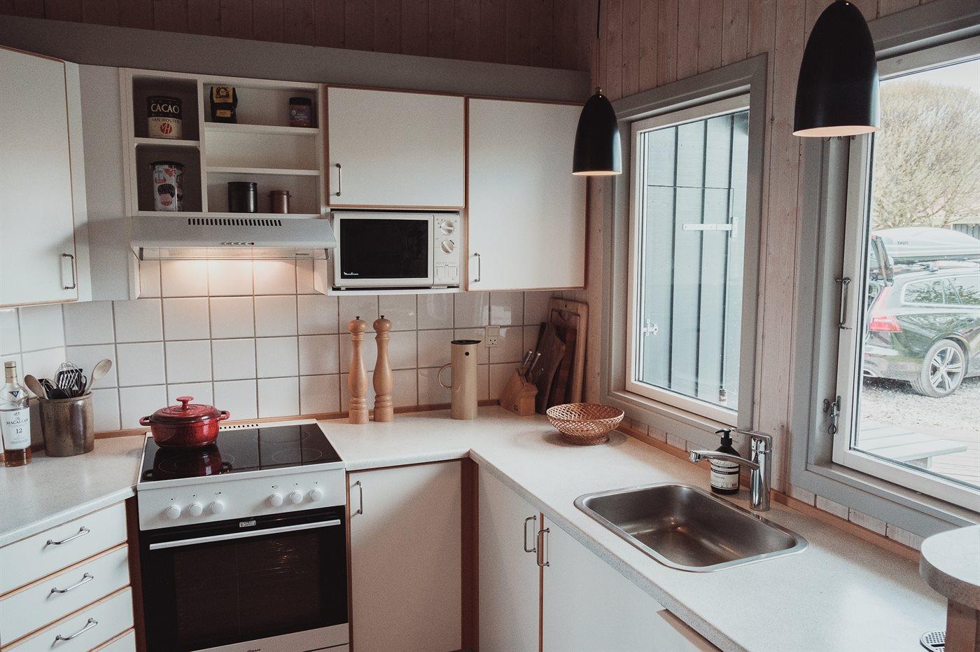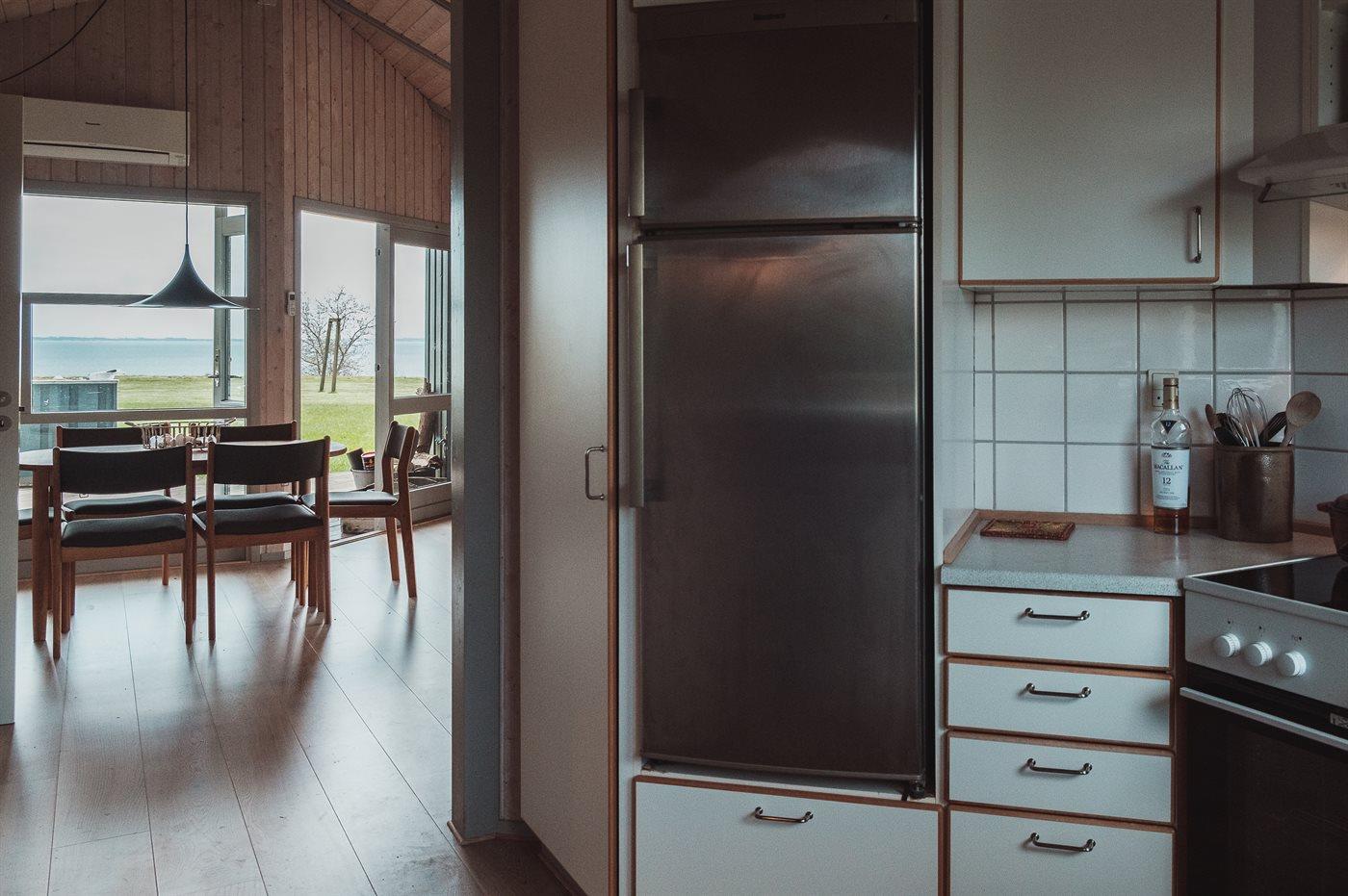 Køkkenet er udstyret med 1 køleskab. Der er 4 keramiske kogeplader, varmluftovn, mikrobølgeovn samt opvaskemaskine.