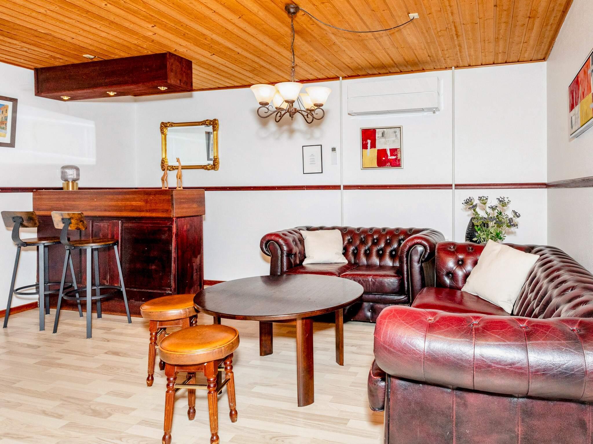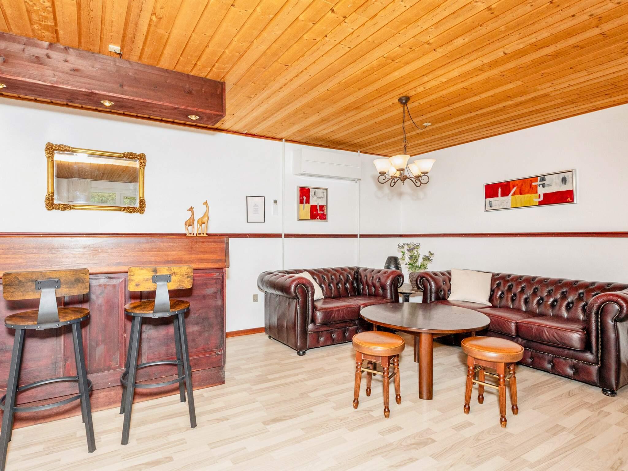 Aktivitetshus med dart, billard, fodboldmål, og en bar med chesterfield møbler.