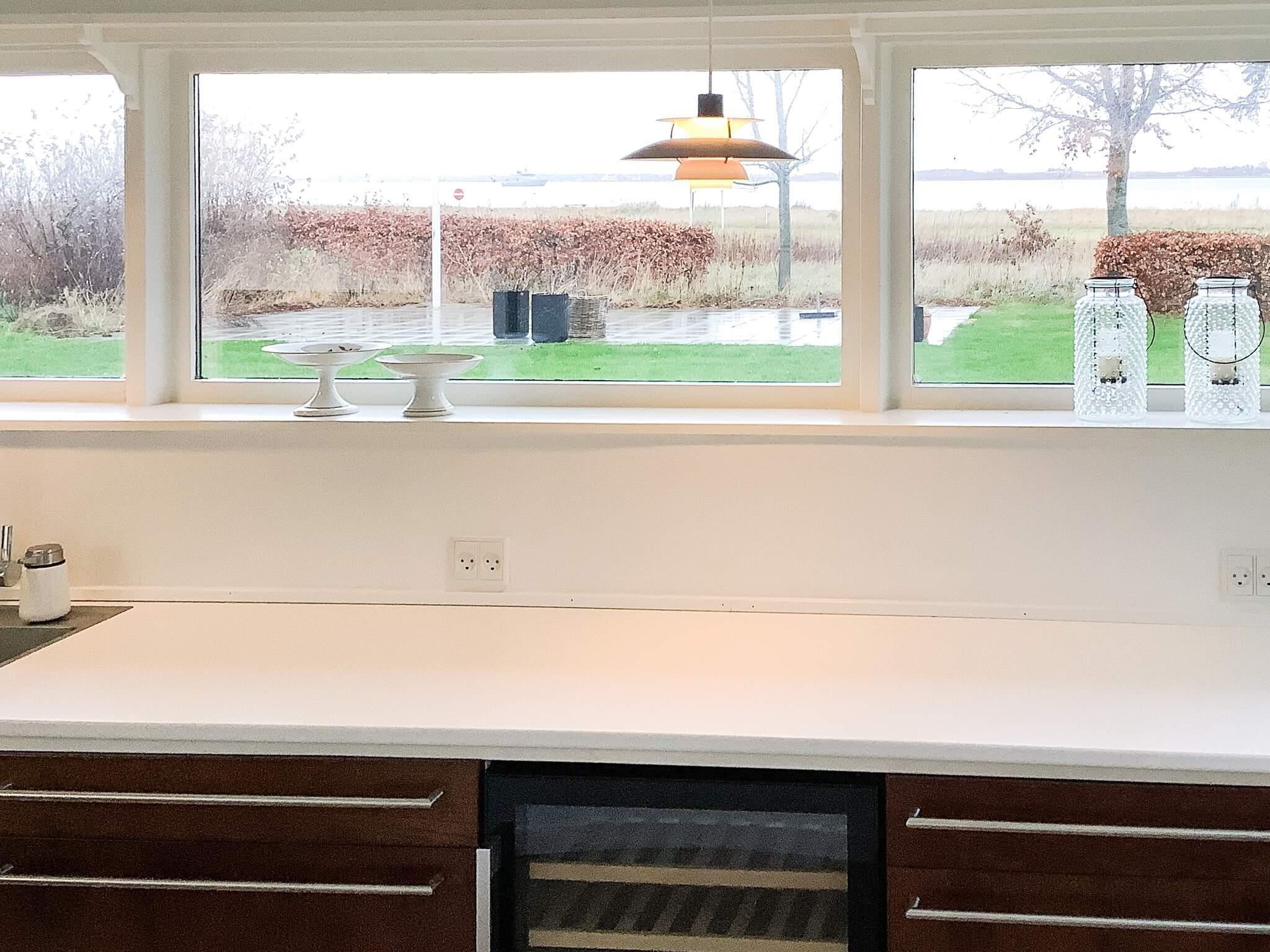 Endvidere et soveværelse med dobbeltseng og skabsvæg. Stort lyst køkken-alrum med den smukkeste udsigt til fjorden og naturen.