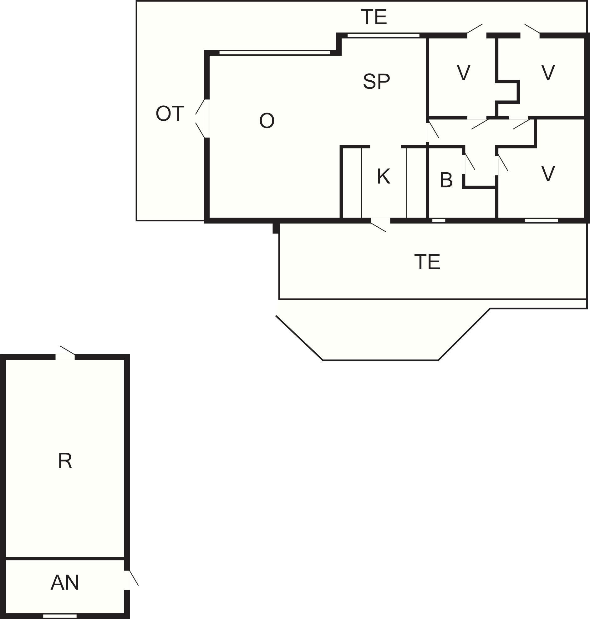 Sommerhuset indeholder desuden tre soveværelser, lille køkken, badeværelse og en fordelingsgang.
