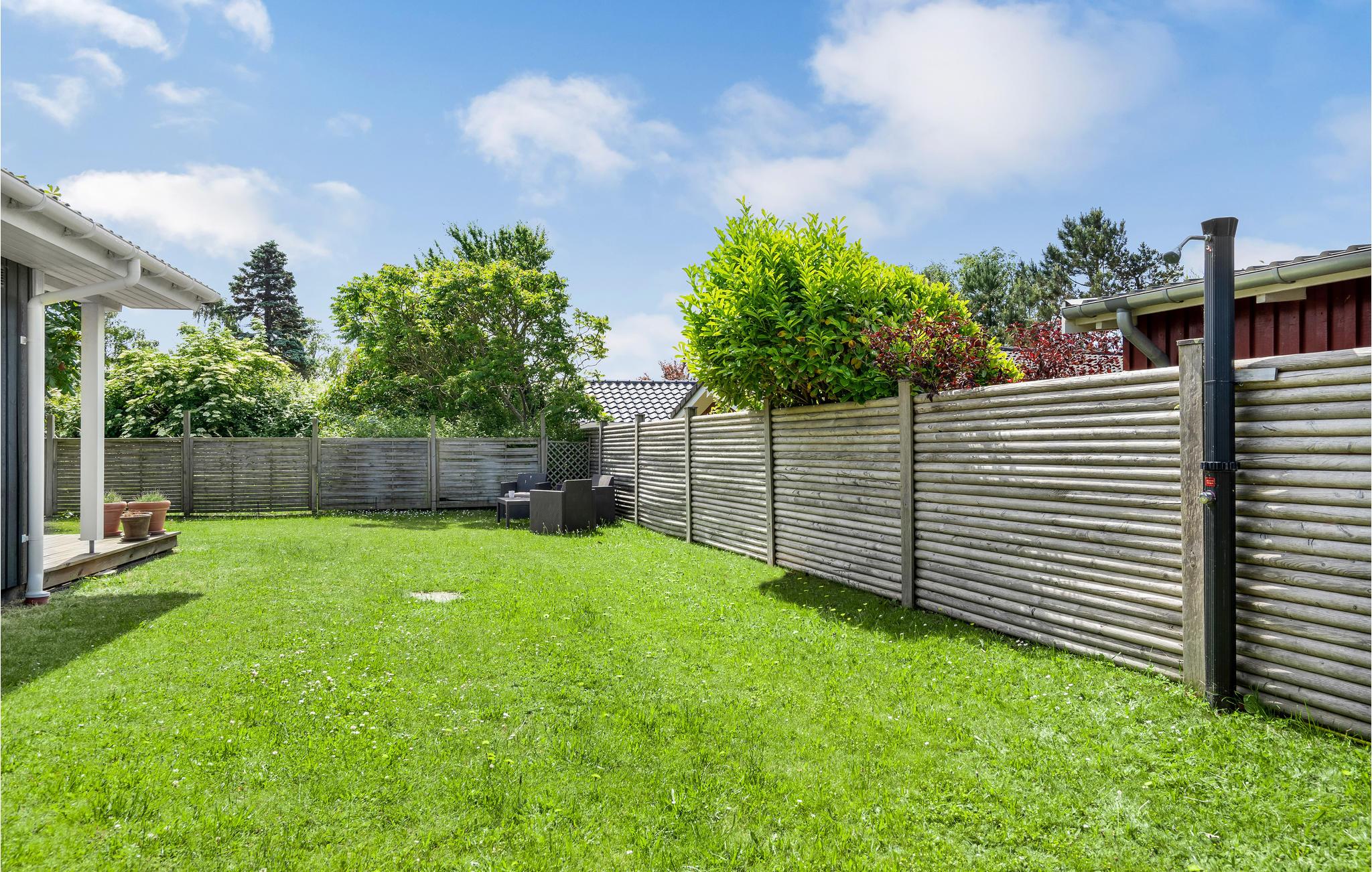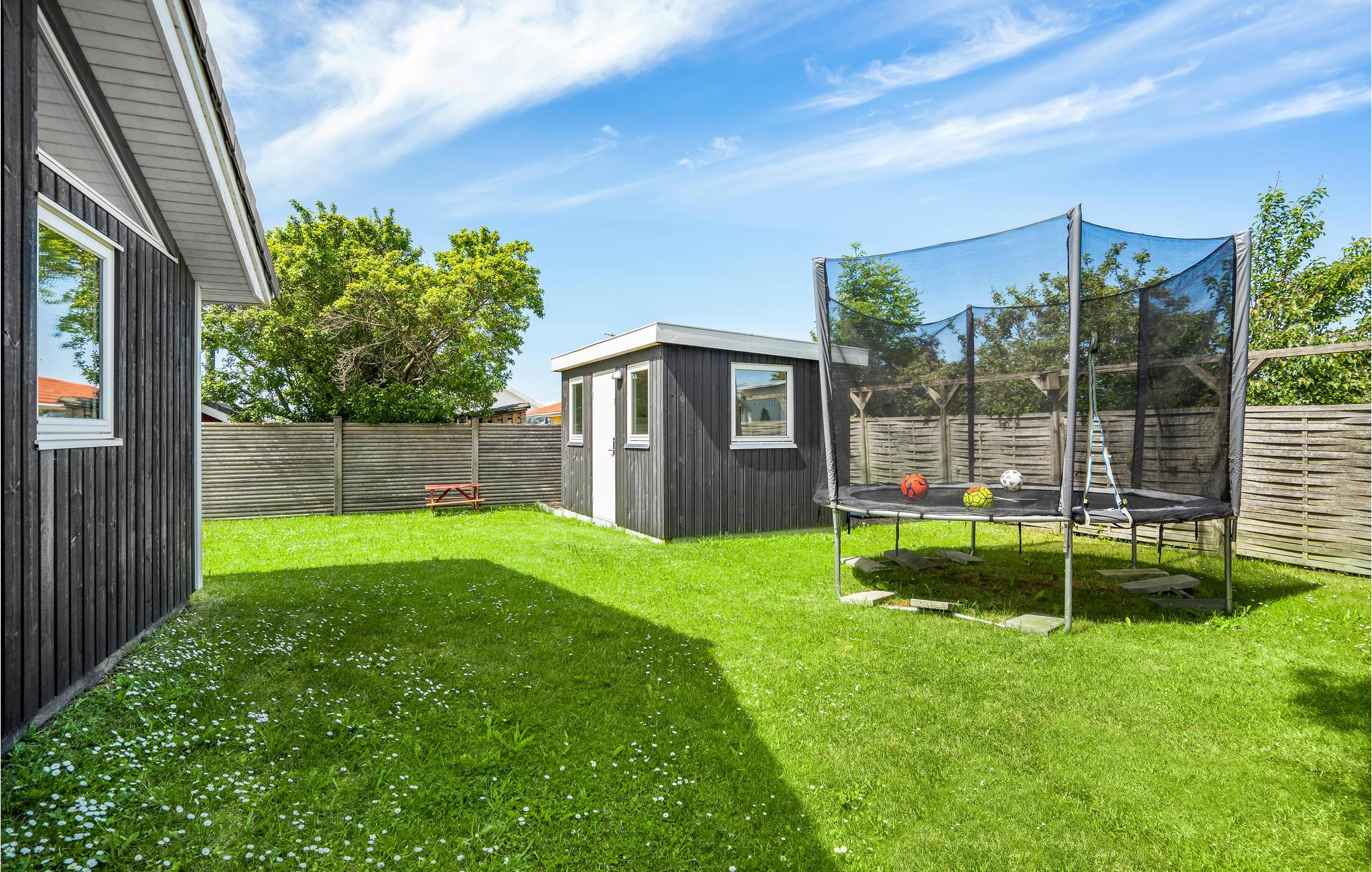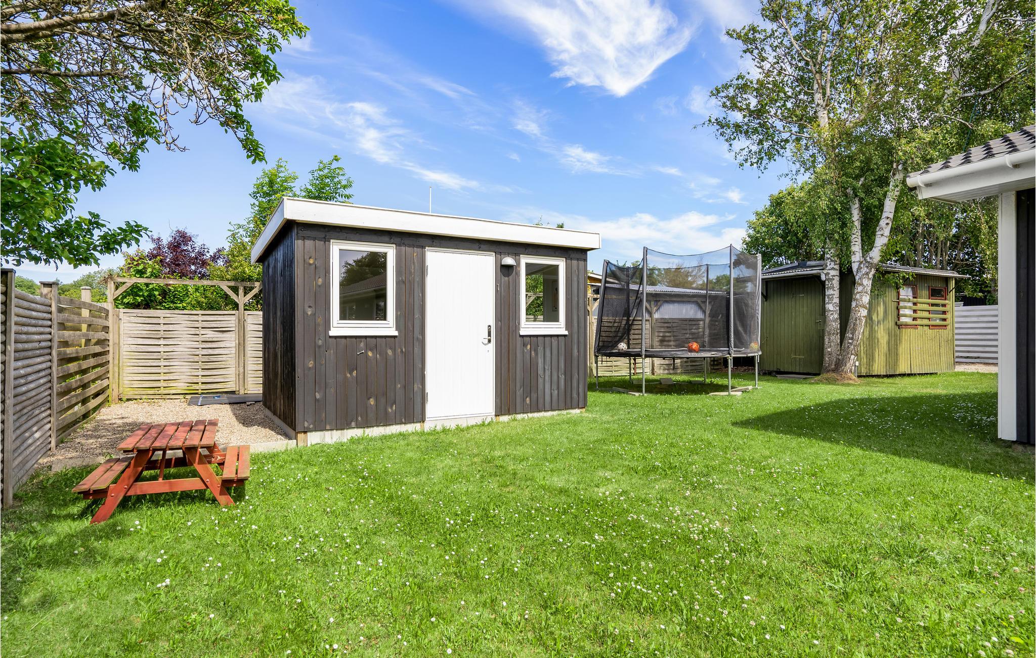 Hyggeligt sommerhus ved Næsby Strand med have, terrasse og trampolin, perfekt til en afslappende ferie nær havet.