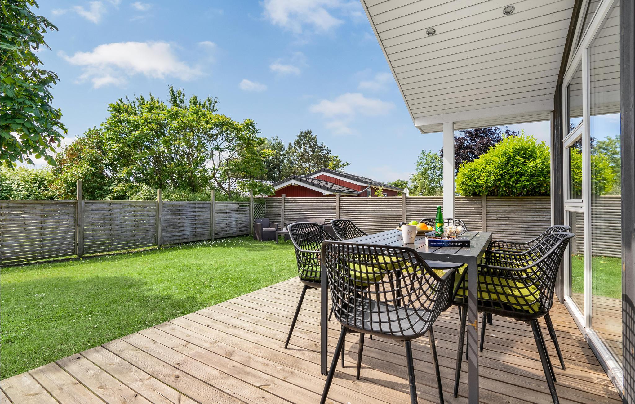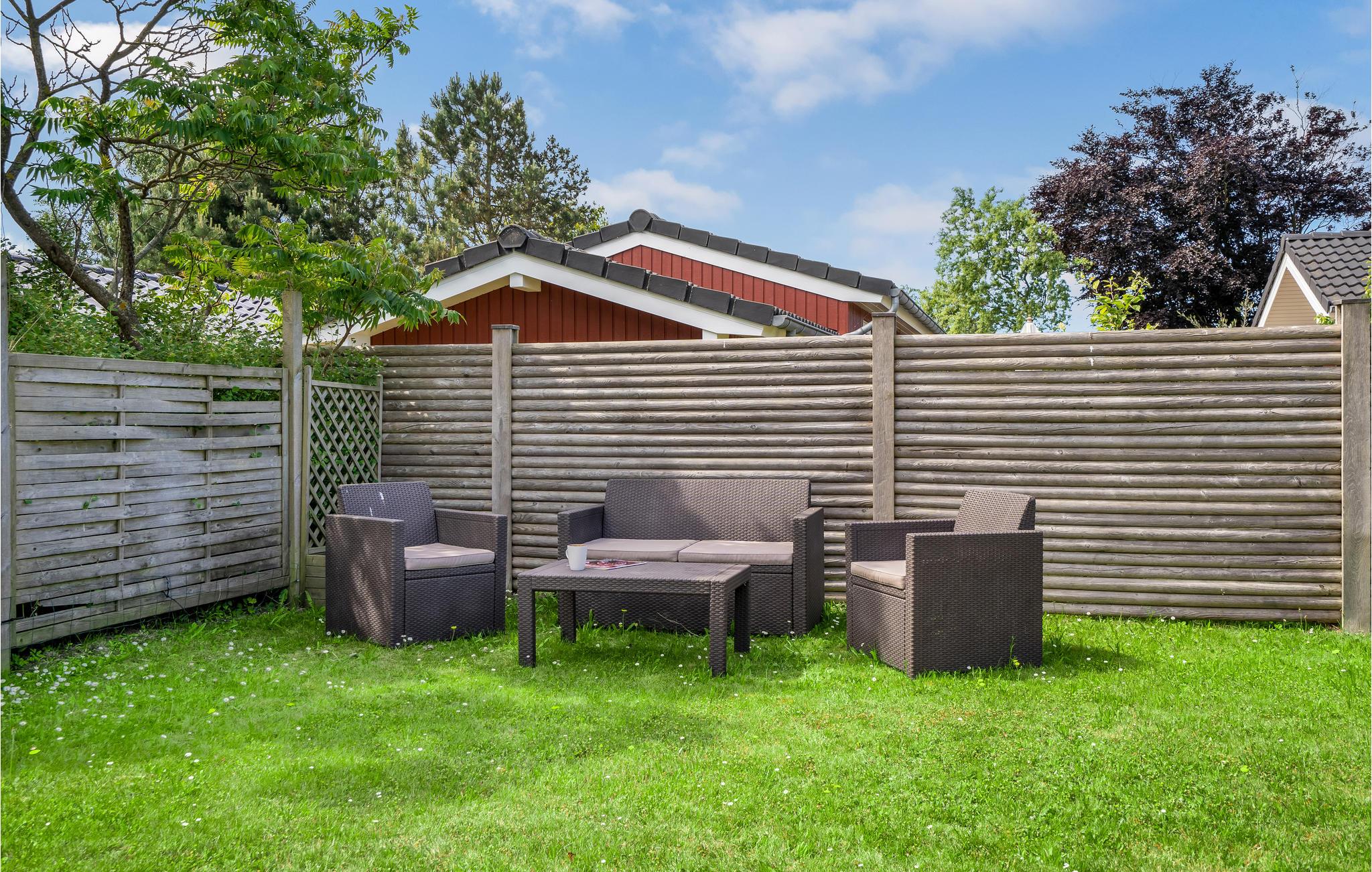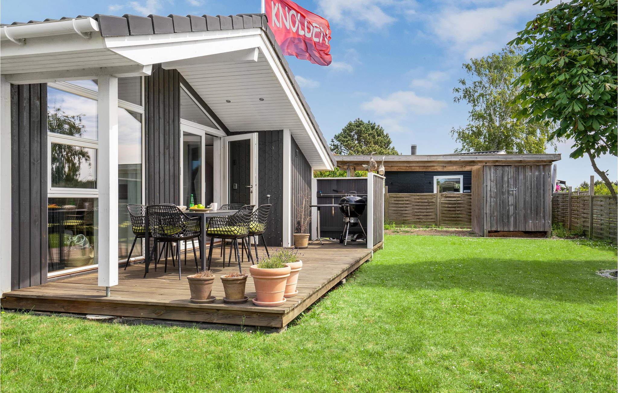 Hyggeligt sommerhus ved Næsby Strand med have, terrasse og trampolin, perfekt til en afslappende ferie nær havet.