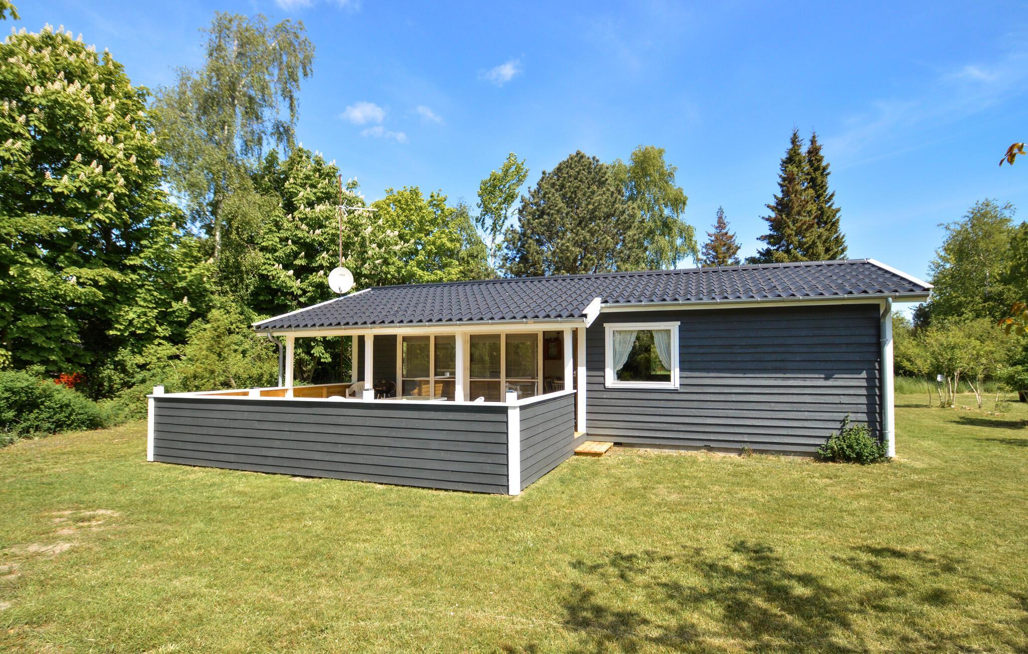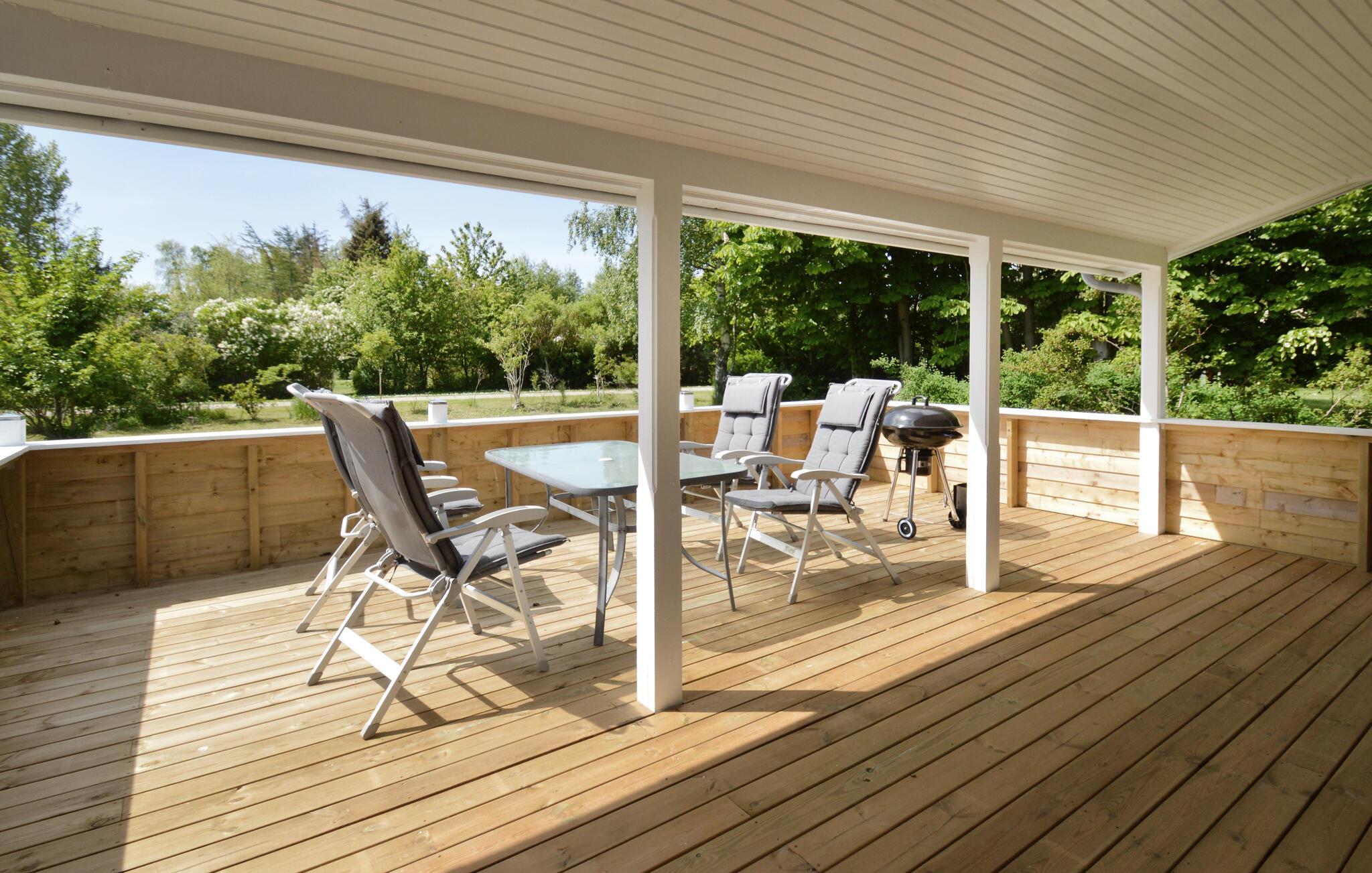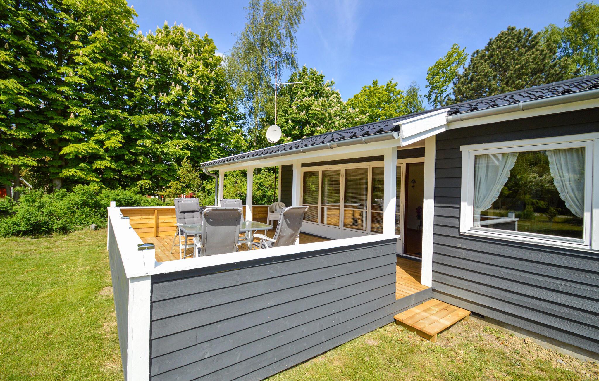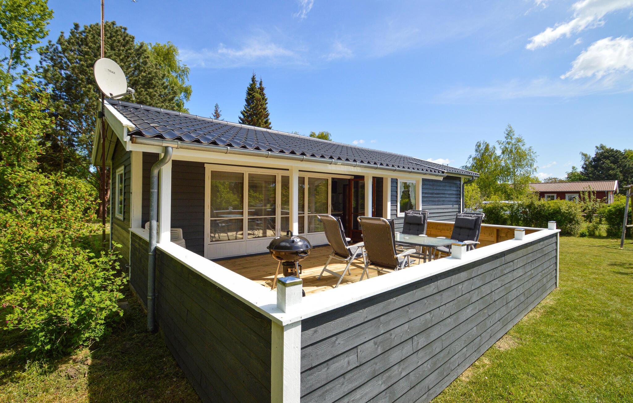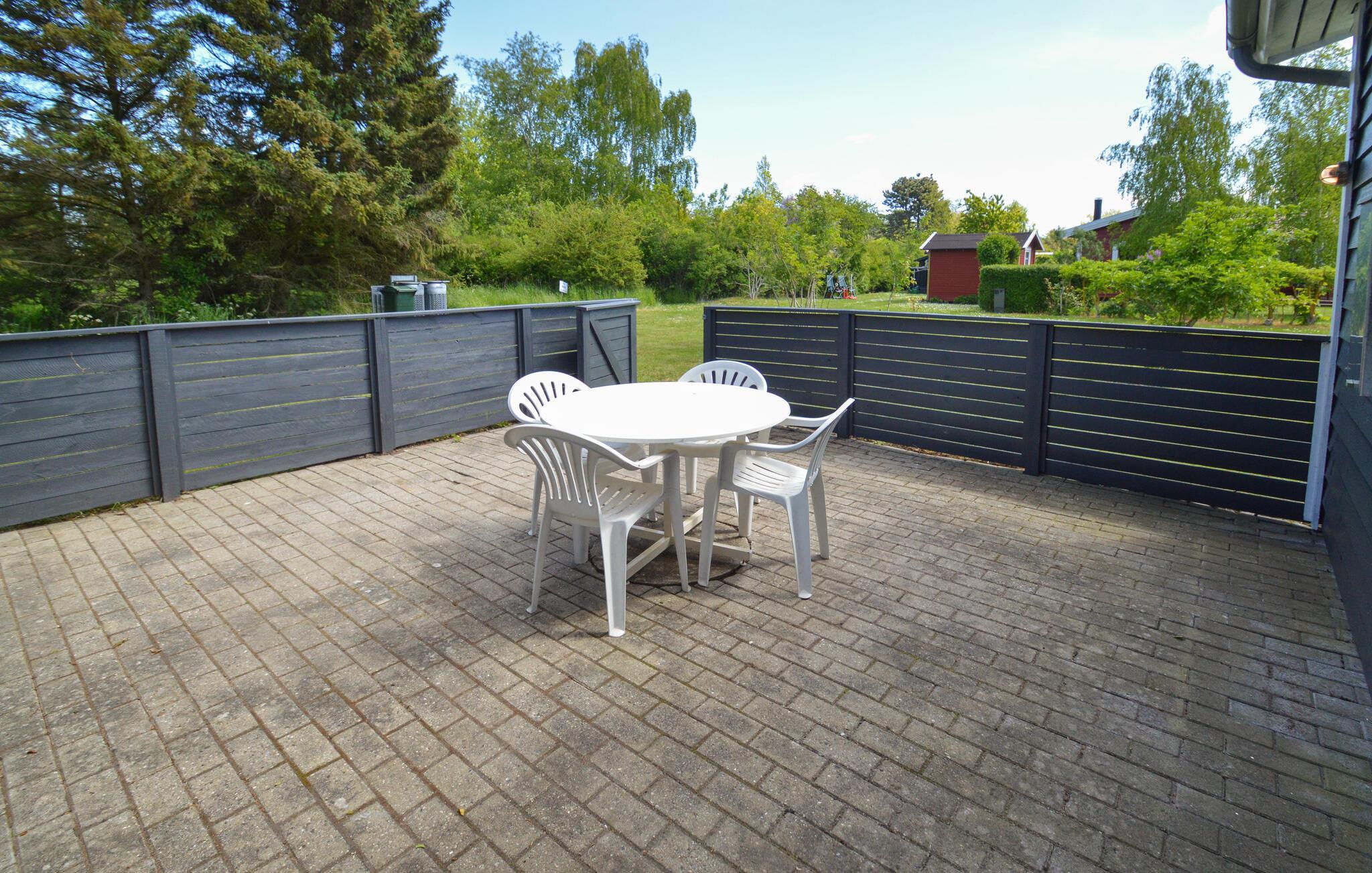 Hyggeligt feriehus nær Næsby strand med stor terrasse og have, perfekt til afslapning og naturoplevelser.