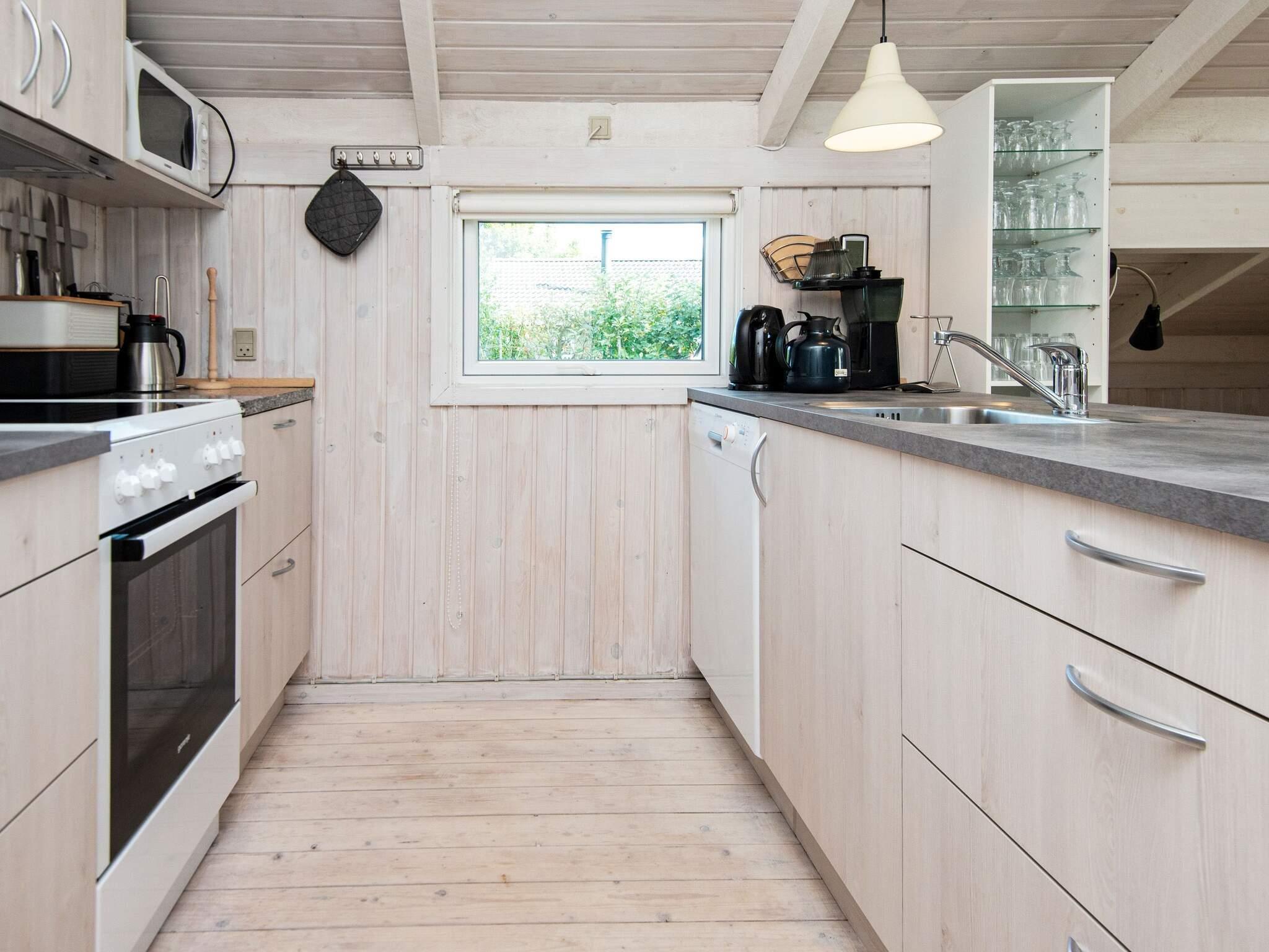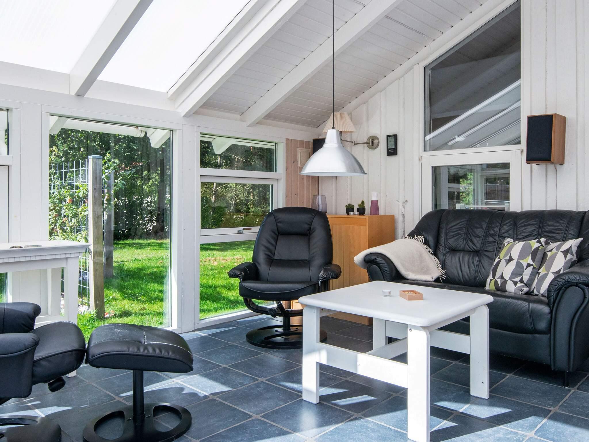 Indenfor indeholder ejendommen to soveværelser: et med dobbeltseng og det andet med to køjesenge. Yderligere sovepladser er tilgængelige i den hyggelige opholdsstue, som kan rumme yderligere to gæster. En lys vinterhave tilføjer et behageligt sted at slappe af på køligere dage eller aftener, mens du nyder udsigten over det omkringliggende grønne område. Det åbne opholds- og spiseområde giver et indbydende rum til familieliv og indendørs afslapning.